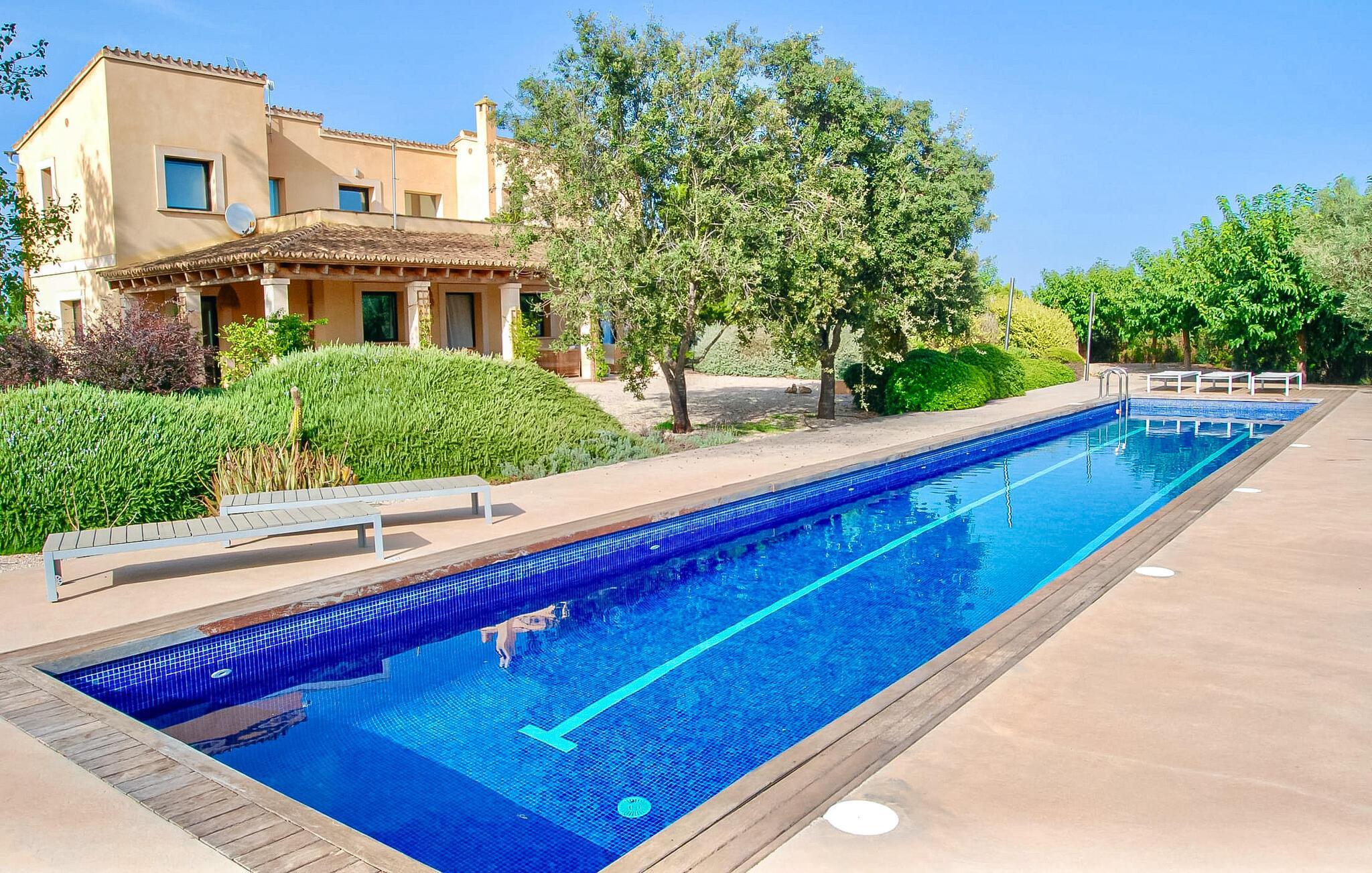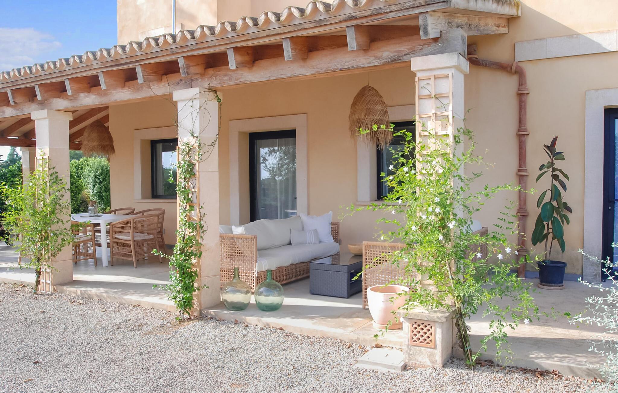 Hübsche Kies- und Terrassenflächen umgeben diese Finca, die ein stilvolles Feriendomizil für bis zu 6 Personen im wunderschönen Süden Mallorcas bietet. Obstbäume wie Granatapfel, Pflaume und Feige prägen das großzügige Areal ebenso wie urige Olivenbäume. Direkt am Haus können Sie gemütlich in der Lounge sitzen oder gemeinsam am Esstisch speisen. Das 20 m lange und außergewöhnlich große Becken ist ein großartiger Ort zum Sporttreiben. Bequeme Liegen auf der umliegenden Sonnenterrasse laden zum Entspannen ein. Auf Wunsch finden Sie hier auch ein paar natürliche Schattenplätze. Einen weiten Ausblick bietet die Balkonterrasse, auf der auch bequeme Liegen zur Verfügung stehen. Für Grillabende steht ein gemauerter Holzkohlegrill zur Verfügung.