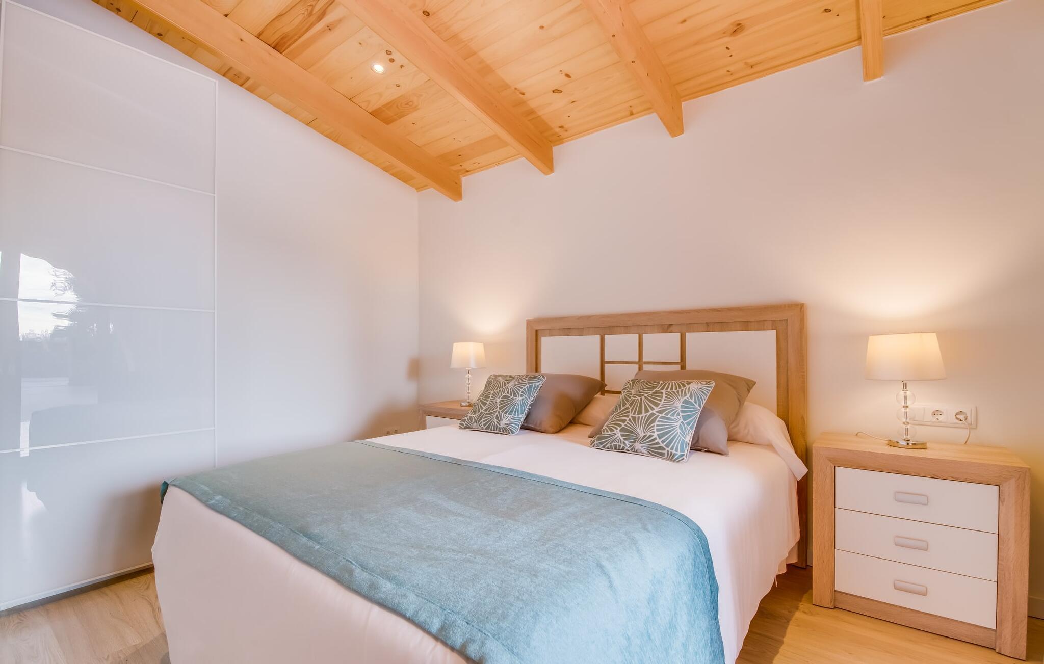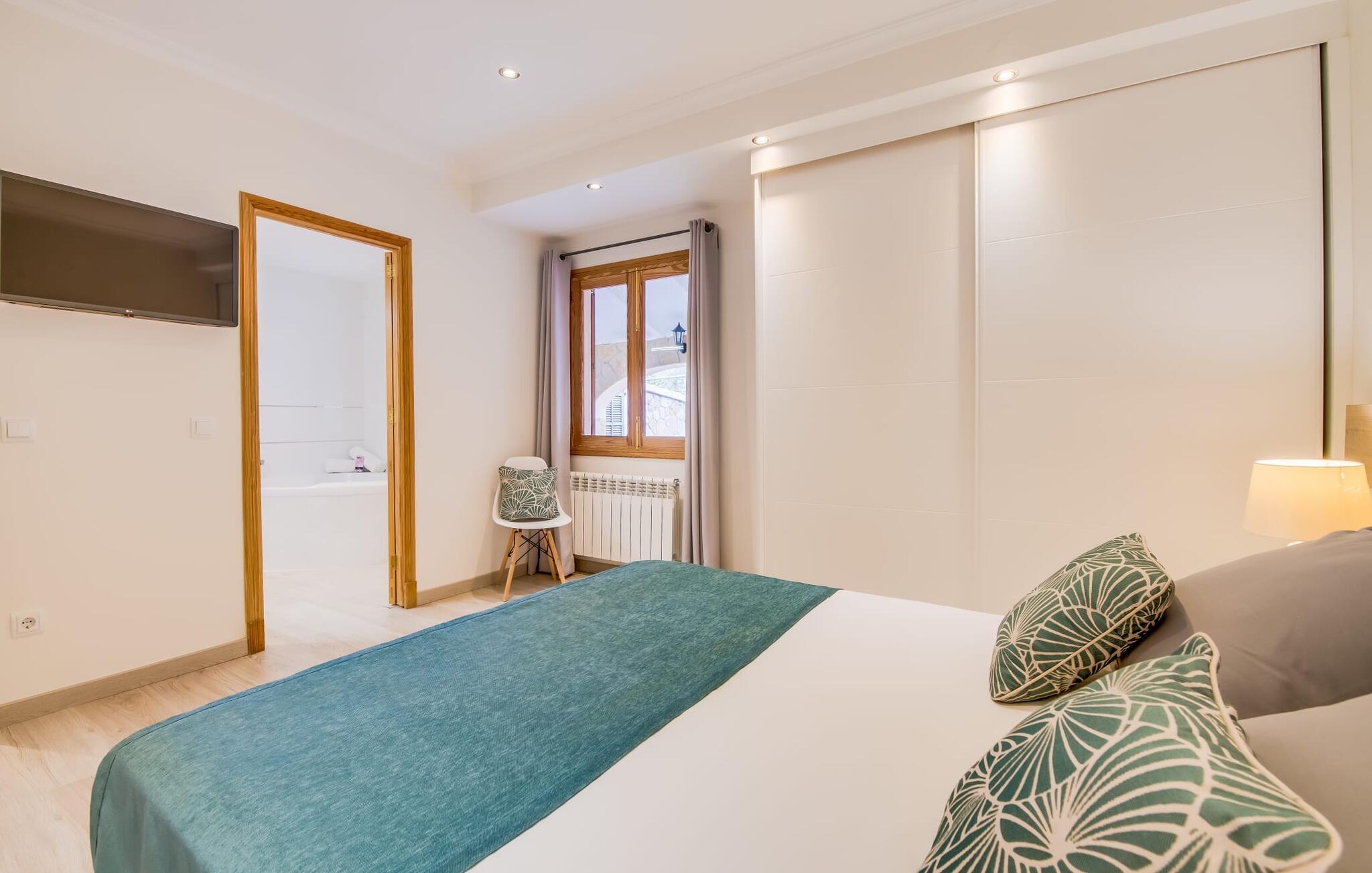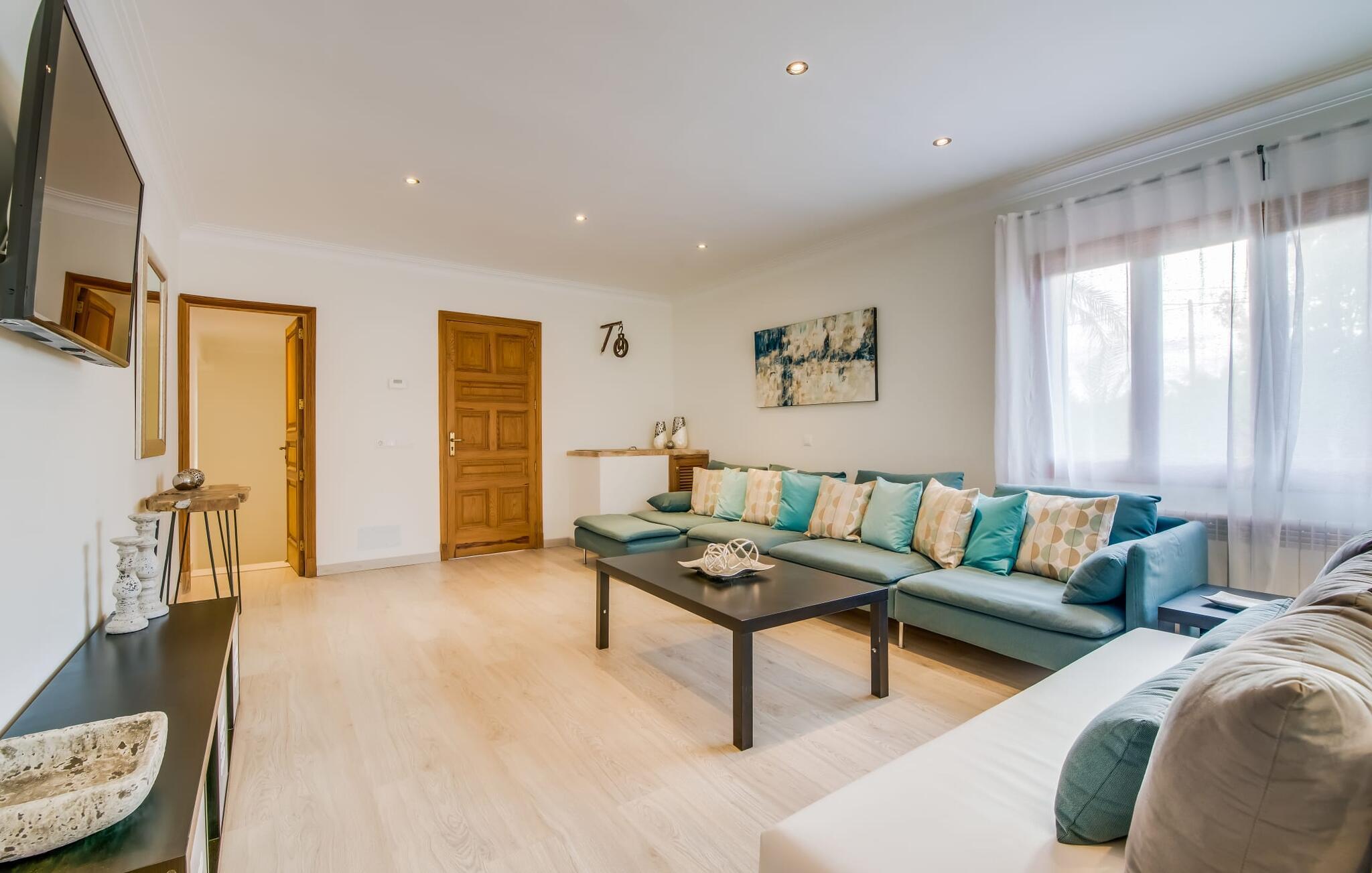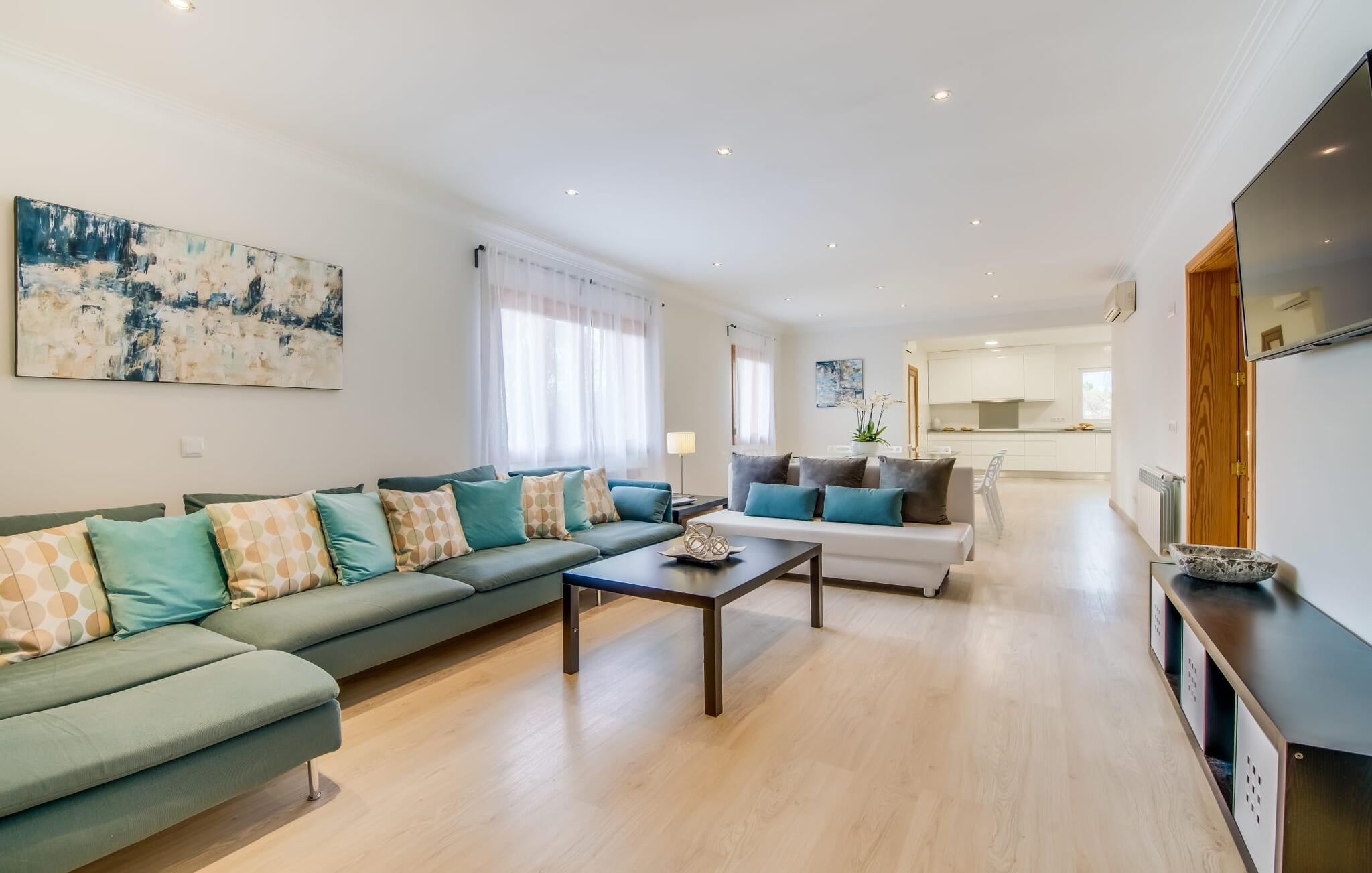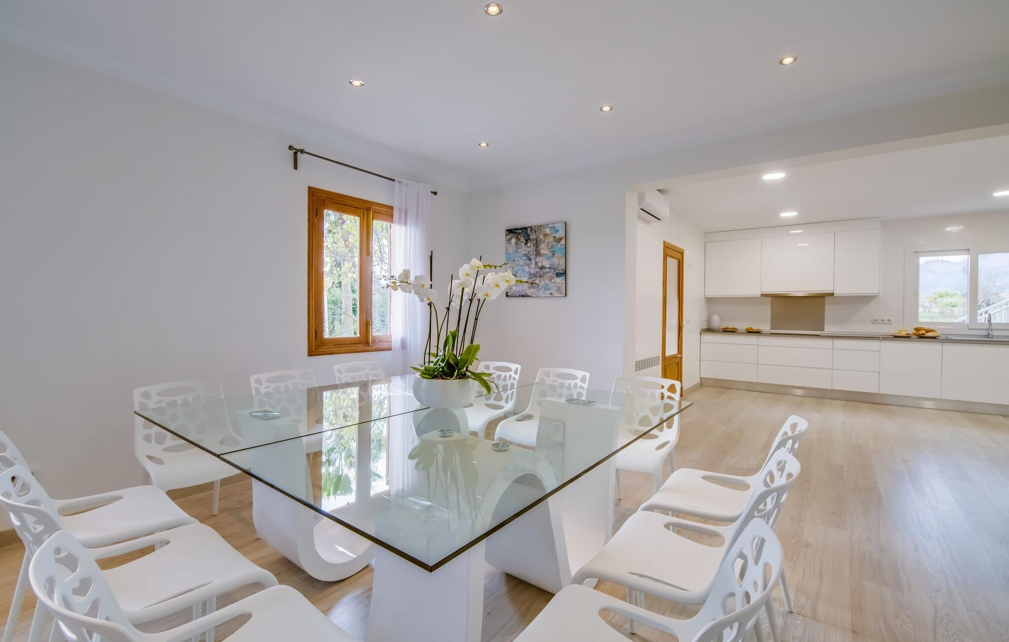 Der Innenbereich des großzügigen Hauses, das sich über Erdgeschoss und Keller erstreckt, ist mit hochmoderner Ausstattung ausgestattet. Große Fenster lassen viel Licht herein, helle Möbel in dezenten Farben sorgen für eine entspannte, friedliche Atmosphäre. Der offene Wohn-/Essbereich bietet neben einer großen Sofalandschaft mit Flachbildfernseher einen großen Esstisch für 12 Personen, der perfekt in die Küche übergeht. Es ist mit modernsten Elektrogeräten ausgestattet und lässt keine Wünsche offen. Insgesamt verfügt Ihre Villa über sechs Schlafzimmer für jeweils zwei Personen sowie fünf Badezimmer, davon drei en-suite. Jedes der Schlafzimmer ist voll klimatisiert und mit einem eigenen Fernseher ausgestattet. Zwei Zimmer befinden sich im Erdgeschoss, die anderen im Untergeschoss mit Zugang zum Garten. Die luxuriösen, tageslichtdurchfluteten Badezimmer verfügen über begehbare Duschen, moderne Waschbecken und große Spiegel. In einem der Badezimmer gibt es auch eine Badewanne. Das puristische Design, die Verarbeitung hochwertiger Materialien und der hohe Komfort machen die Villa „Son Mesquida de Inca“ zu einem echten Schmuckstück, das Sie zum Stammgast werden lässt.