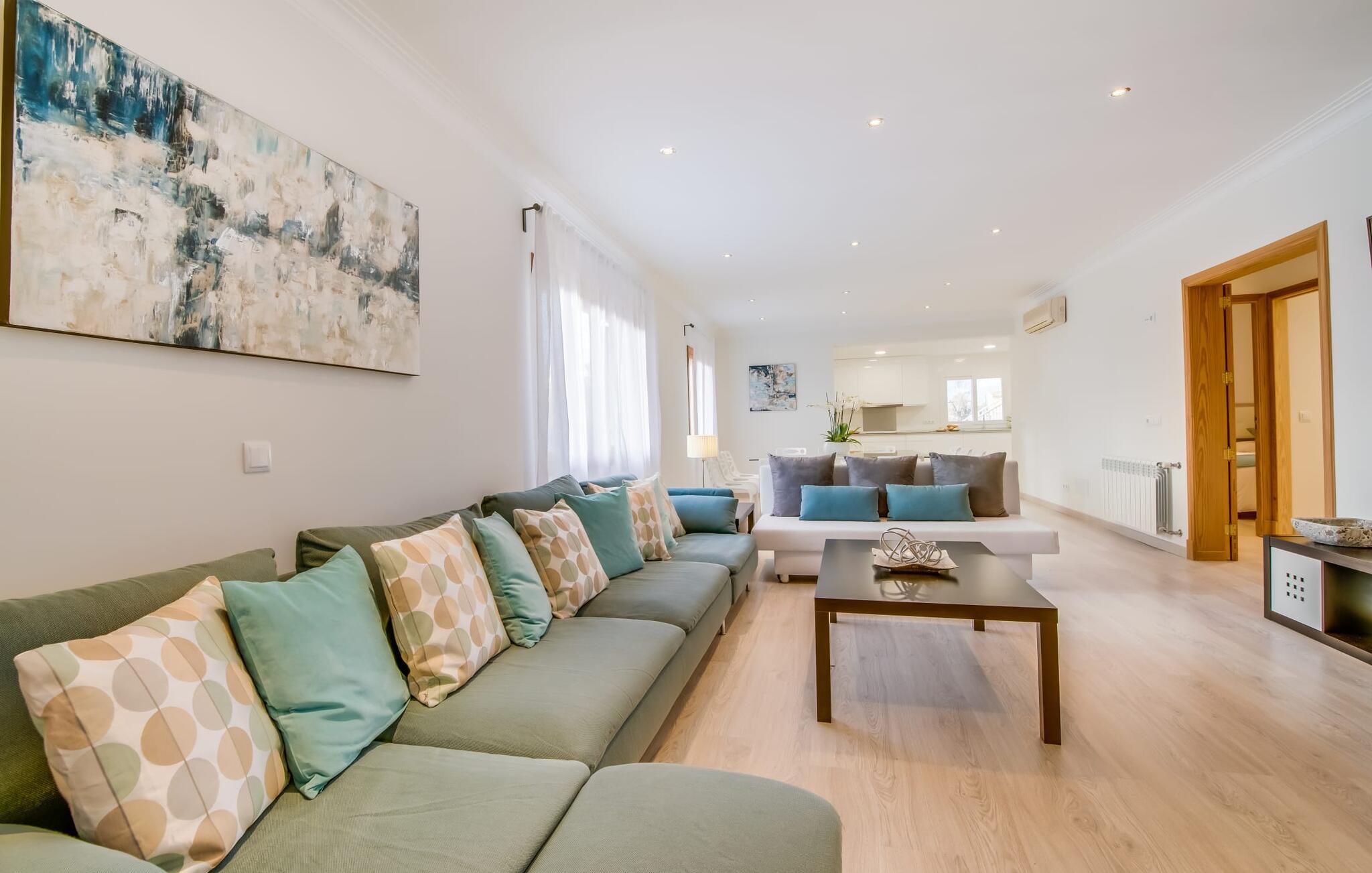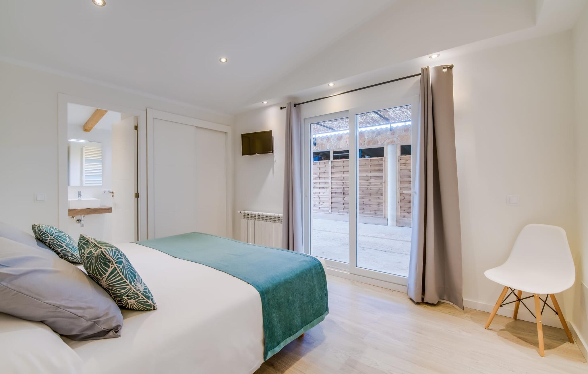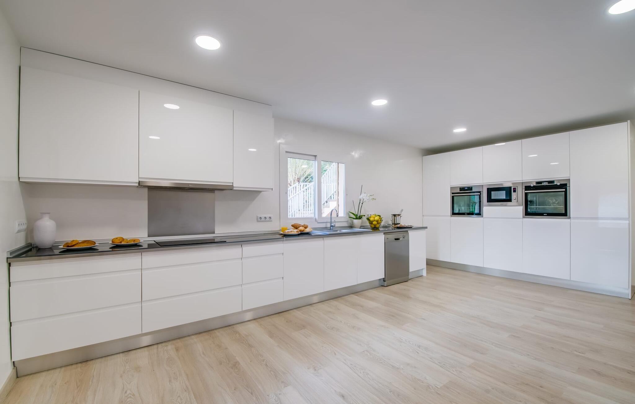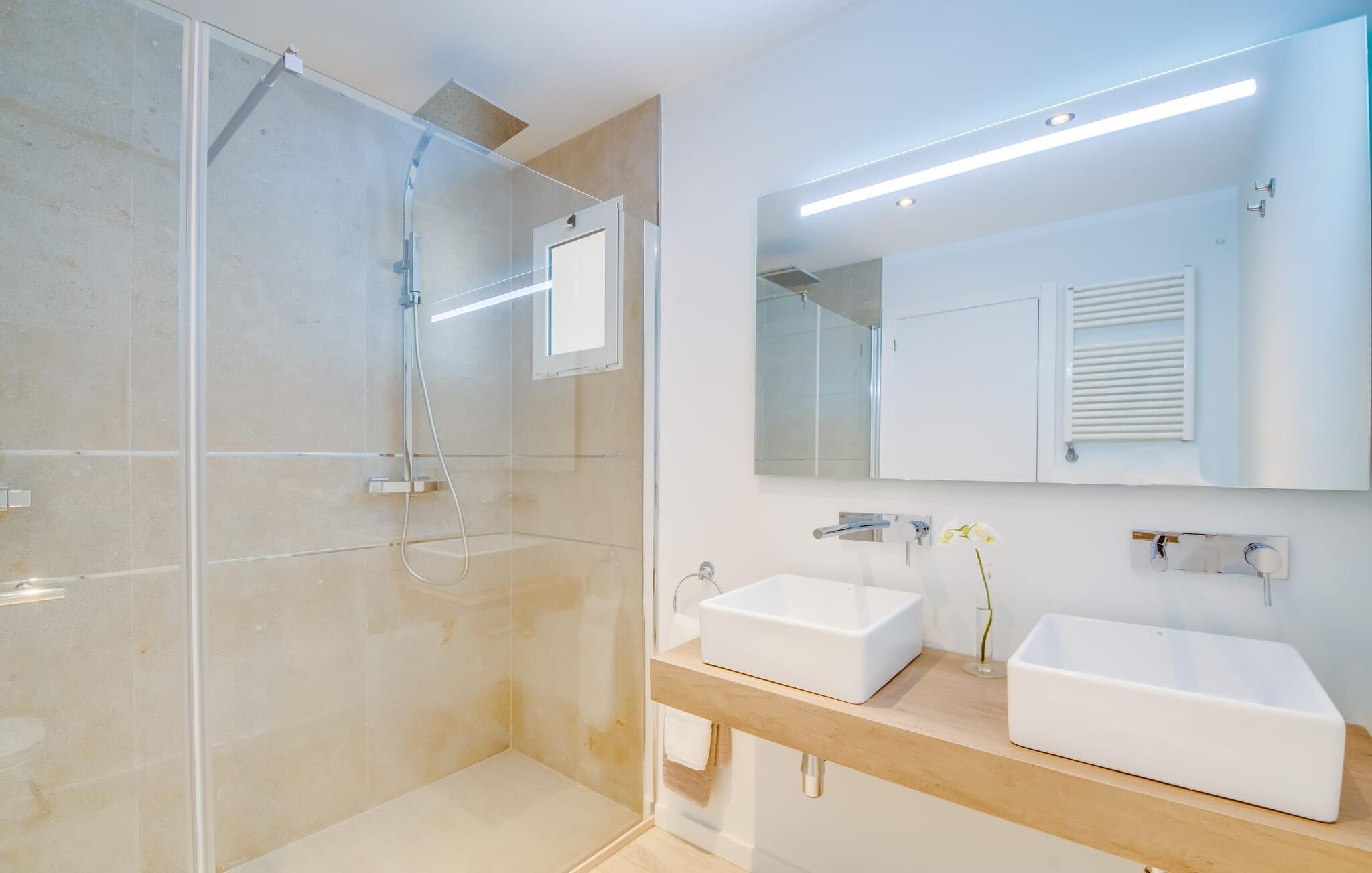 Der Innenbereich des großzügigen Hauses, das sich über Erdgeschoss und Keller erstreckt, ist mit hochmoderner Ausstattung ausgestattet. Große Fenster lassen viel Licht herein, helle Möbel in dezenten Farben sorgen für eine entspannte, friedliche Atmosphäre. Der offene Wohn-/Essbereich bietet neben einer großen Sofalandschaft mit Flachbildfernseher einen großen Esstisch für 12 Personen, der perfekt in die Küche übergeht. Es ist mit modernsten Elektrogeräten ausgestattet und lässt keine Wünsche offen. Insgesamt verfügt Ihre Villa über sechs Schlafzimmer für jeweils zwei Personen sowie fünf Badezimmer, davon drei en-suite. Jedes der Schlafzimmer ist voll klimatisiert und mit einem eigenen Fernseher ausgestattet. Zwei Zimmer befinden sich im Erdgeschoss, die anderen im Untergeschoss mit Zugang zum Garten. Die luxuriösen, tageslichtdurchfluteten Badezimmer verfügen über begehbare Duschen, moderne Waschbecken und große Spiegel. In einem der Badezimmer gibt es auch eine Badewanne. Das puristische Design, die Verarbeitung hochwertiger Materialien und der hohe Komfort machen die Villa „Son Mesquida de Inca“ zu einem echten Schmuckstück, das Sie zum Stammgast werden lässt.