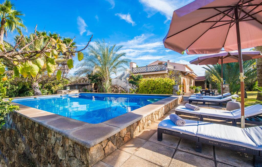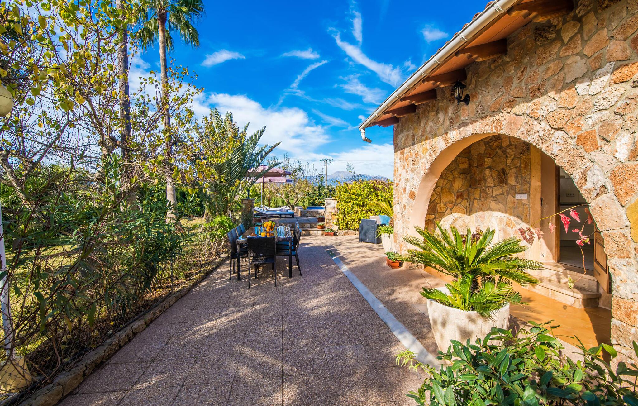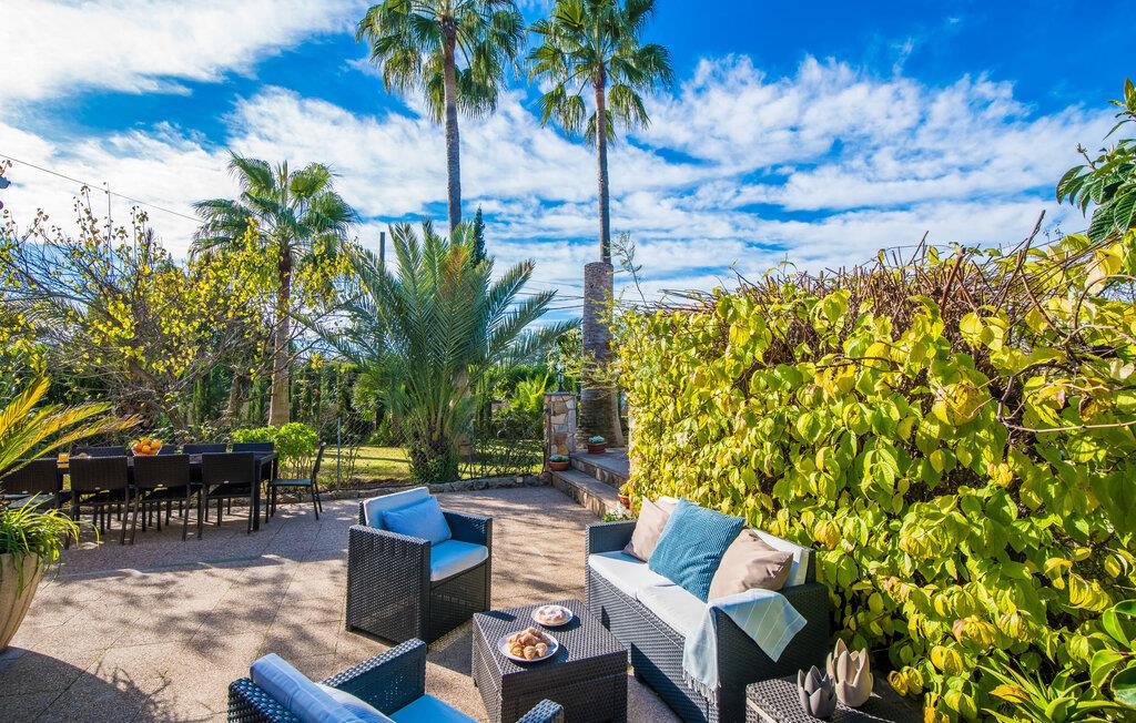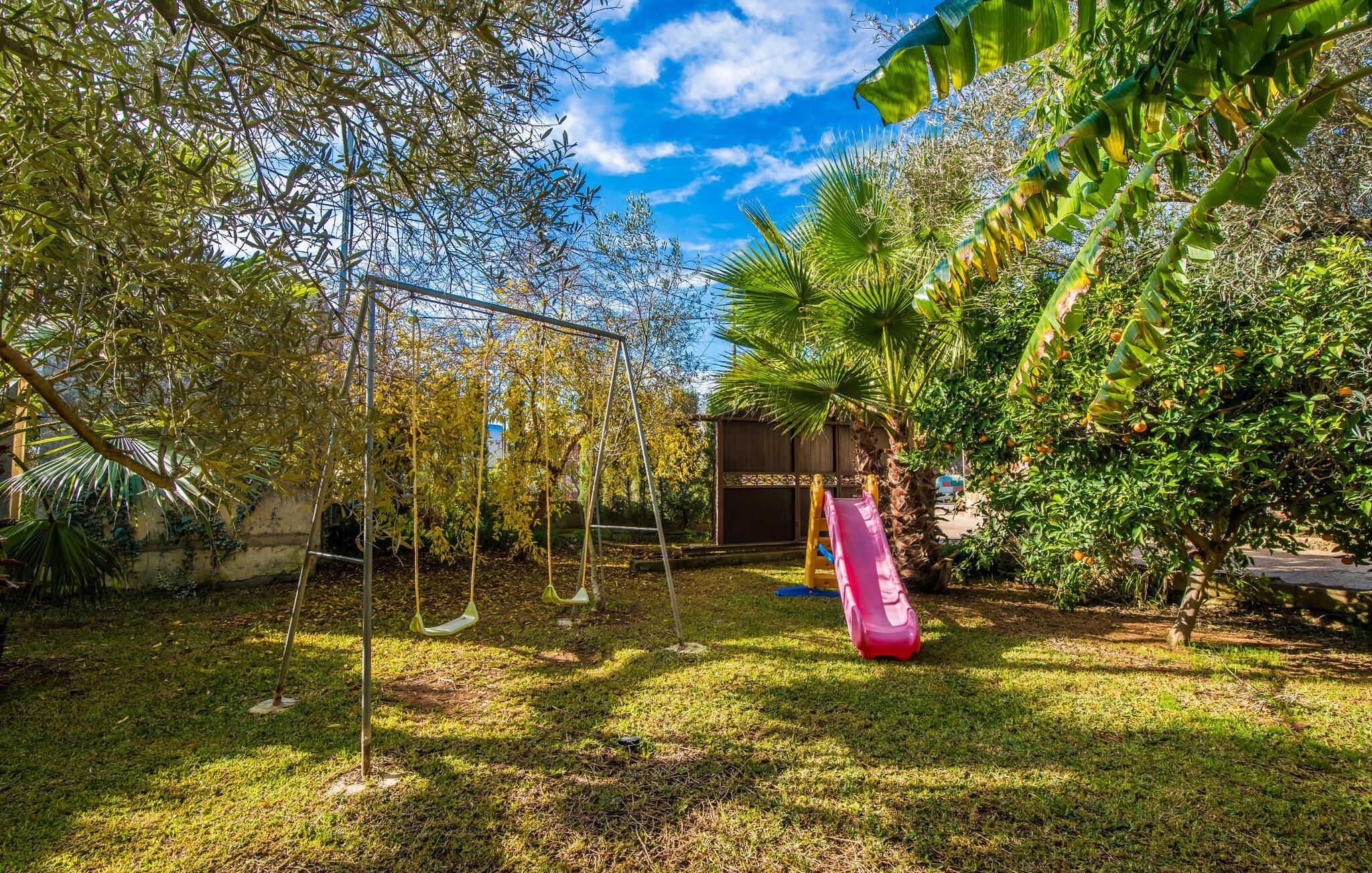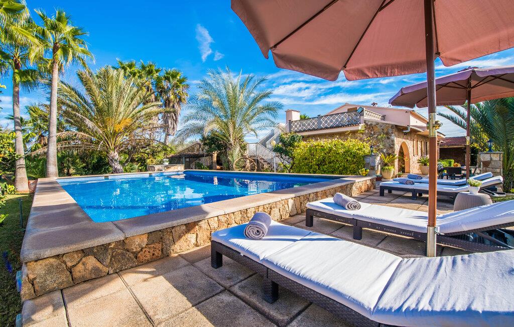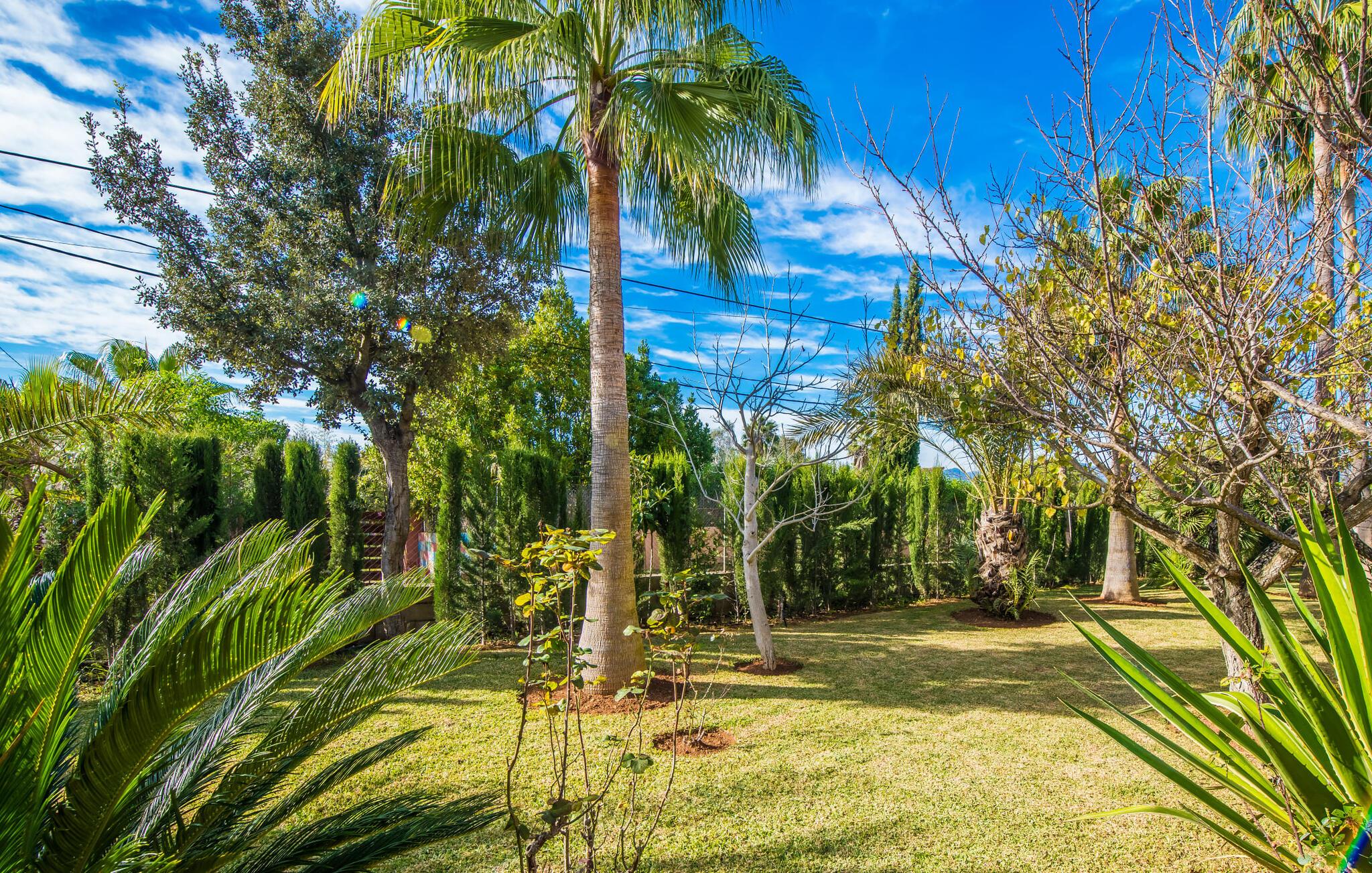 Ihre Villa liegt auf einem ca. 5.000 m² großen Grundstück, auf dem eine wahre Urlaubsoase entstanden ist. Besonders schön ist der tropische Garten mit hohen Palmen, die sich sanft im Wind wiegen, Orangenbäumen, die leuchtende Früchte tragen, und einem weiten Blick von der Ebene bis hin zum Tramuntana-Gebirge. Wer würde hier nicht anfangen zu träumen? Ein 12 x 6 m großer Pool sorgt für Badespaß und willkommene Erfrischung. Der Poolbereich ist mit bequemen Sonnenliegen ausgestattet, wo Sie unter großen Sonnenschirmen wunderbar entspannen können. Familien mit kleinen Kindern werden sich in dieser Villa besonders wohl fühlen: Nicht nur der riesige Pool lässt die Augen der jüngsten Besucher leuchten; Sobald sie die Schaukel und die Rutsche entdeckt haben, können sie ihre Vorfreude nicht mehr zurückhalten. Großzügige Rasenflächen und üppige Pflanzen bieten zudem den perfekten Rahmen zum Verstecken. Der Garten umfasst mehrere Terrassen, von denen einige teilweise überdacht sind. Am großen Esstisch können Sie gemeinsame Mahlzeiten im Freien genießen. Selbstverständlich steht Ihnen auch eine Außenküche mit großem Holzkohlegrill zur Verfügung, sodass Sie im Handumdrehen frischen Fisch – am besten direkt in der Markthalle gekauft – zubereiten können. Wer sich zurückziehen möchte, um seine E-Mails zu checken oder sich in ein gutes Buch zu vertiefen, findet auf der überdachten Terrasse ein ruhiges, gemütliches Plätzchen.