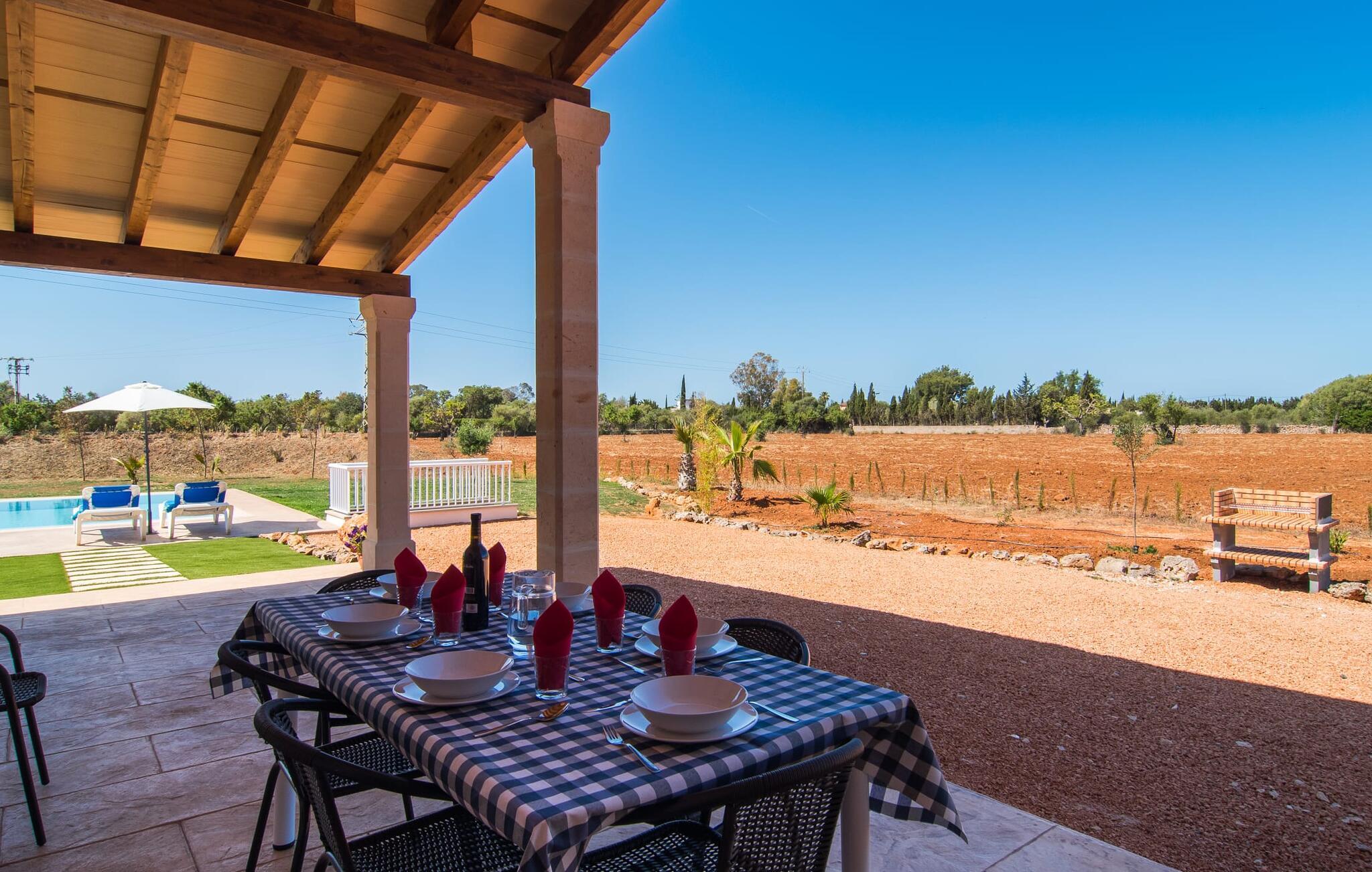 Herrlich komfortabel und in toller Alleinlage im Grünen: Die Villa „Son Pieras Nou“ liegt nur wenige Kilometer von Llucmajor entfernt. In dieser wunderschönen Ecke im Süden Mallorcas sind weder Nachbarn noch Autos in Sicht: Hier können Sie absolute Ruhe inmitten der Natur genießen und nach Lust und Laune die Seele baumeln lassen. Das neu erbaute Natursteinhaus liegt auf einem 28.000 m² großen Grundstück mit Rasenflächen und vielen Olivenbäumen. Wer gerne aktiv ist, kann mit seinen Mitreisenden Spaziergänge unternehmen oder sich beim Volleyball auf dem hauseigenen Volleyballfeld auspowern. Anschließend können Sie sich im großen, rechteckigen Pool mit Außendusche abkühlen, in dem auch Kinder gerne planschen und schwimmen. Um ein Auge auf sie zu haben, können sich die Eltern entweder auf einer der bequemen Sonnenliegen niederlassen oder … Sitzen Sie im Schatten auf der überdachten Terrasse mit verschiedenen einladenden Sitzgelegenheiten.