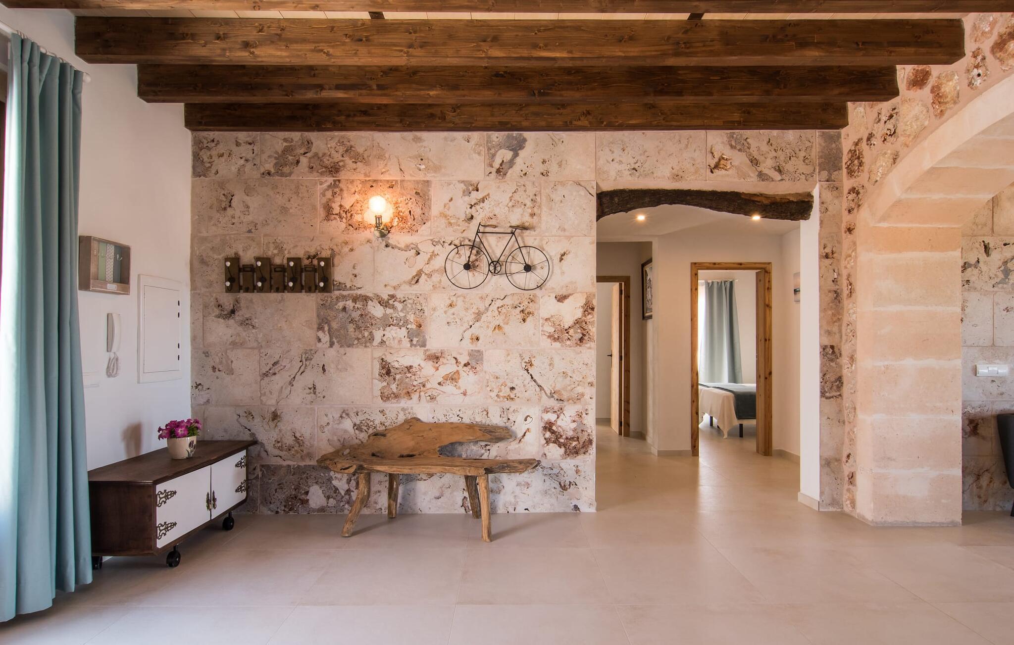 Das Interieur von „Son Pieras Nou“ wurde mit einem guten Blick für geschmackvolle Details gestaltet. Natürliche Farben dominieren, weiß gestrichene Wände wechseln sich mit rustikalen Natursteinwänden ab, die Decken bestechen durch schöne dunkelbraune Holzbalken und der Boden ist in einem tollen hellbraunen Farbton gefliest. All dies verbreitet eine angenehm entspannte, ländliche Urlaubsatmosphäre. Ein architektonisches Highlight ist der Verzicht auf Treppen: In der ebenerdigen Villa befinden sich praktischerweise alle Räume auf einer Ebene. Dazu gehören das großzügige Wohnzimmer mit zwei gemütlichen Sofas und mehreren Sesseln vor dem Fernseher oder der Essbereich, der sich zur Küche hin öffnet, mit elegantem Tisch, Designerstühlen und stimmungsvoller Beleuchtung. Ein weiteres Highlight ist die ultraschicke Küche, deren Stil perfekt zum Rest des Hauses passt und von der aus Sie den Blick nach draußen genießen können. Abgerundet wird der Wohnraum durch drei klimatisierte Schlafzimmer sowie zwei moderne Badezimmer, eines davon en-suite.