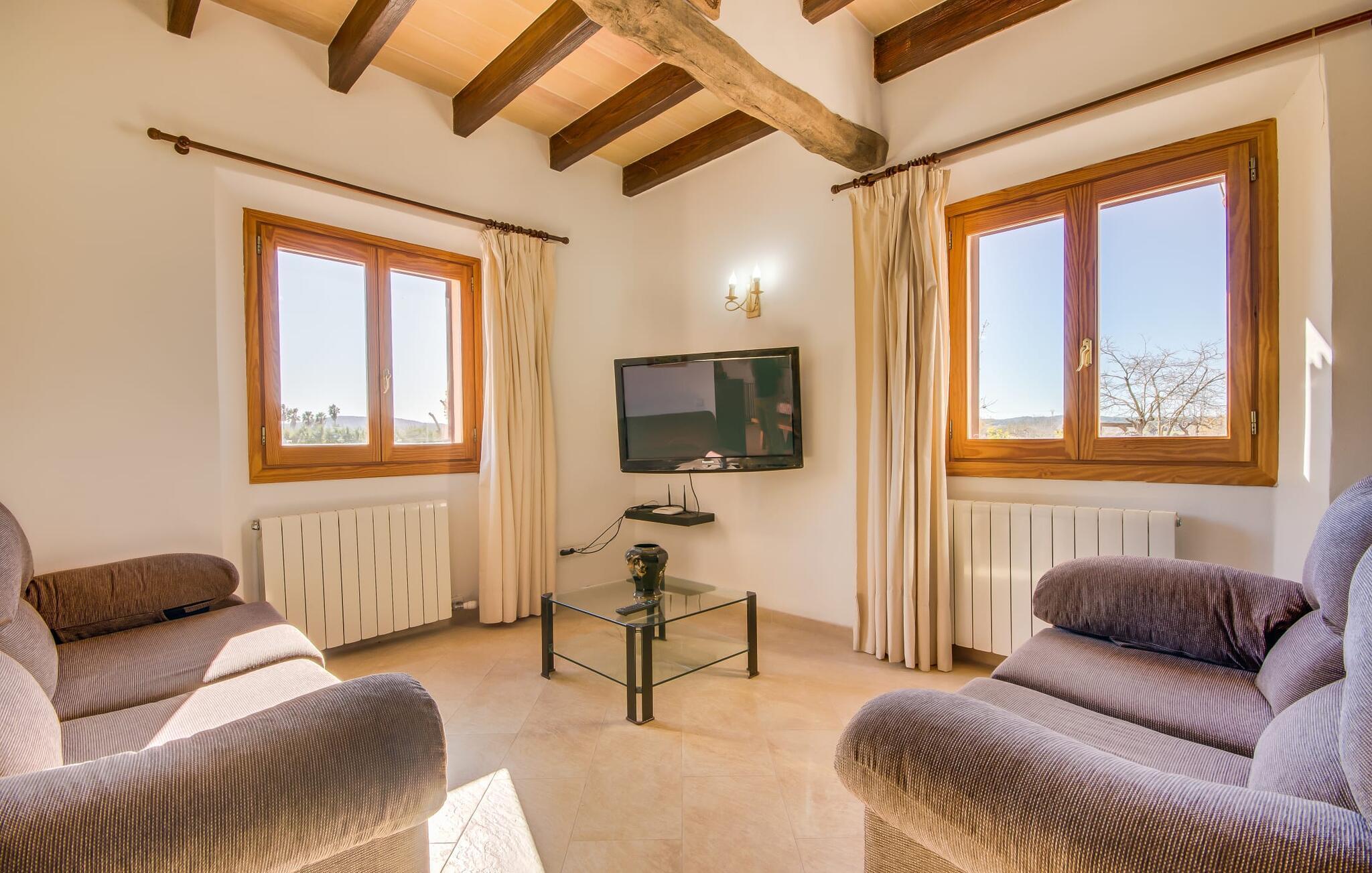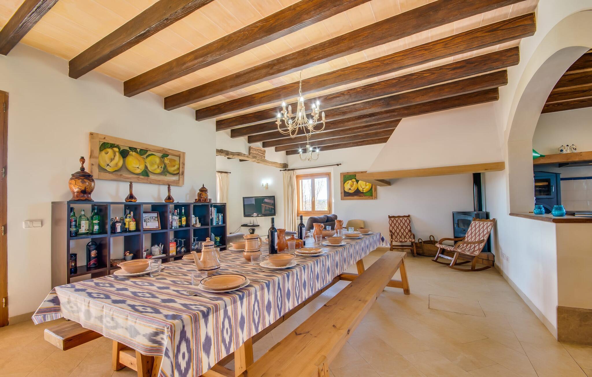Die Terrasse führt in das Innere von „Son Pujol Vell“. Den Mittelpunkt bildet das großzügige, kombinierte Wohn-/Esszimmer mit offenem Durchgang zur kleinen, praktisch eingerichteten Küche. Erster Eindruck: Etwas verwinkelt und dadurch sehr gemütlich, mit hohen Decken und Sichtbalken, viel Holz, viele warme Farbtöne. Dazu eine Sofaecke mit Flachbildfernseher und Kamin neben den Schaukelstühlen. Der große Esstisch lädt zum geselligen Beisammensein ein – hier findet jeder seinen Wohlfühlplatz. Von diesem Raum aus führt auch die Treppe hinauf in die oberste Etage. Große Gruppen finden in dieser Villa ihr perfektes Zuhause, da alle Schlafzimmer mit einem Fernseher und einem eigenen Bad ausgestattet sind. Neben gemeinschaftlichen Standorten bietet es daher auch jede Menge Rückzugsräume für jeden Einzelnen. Das Spielzimmer mit Brettspielen, einer Spielekonsole und vielem mehr wird sicherlich ein weiteres Highlight für die kleinen Gäste sein. Darüber hinaus ist die Lage von „Son Pujol Vell“ im Herzen der Insel sehr günstig. Palma mit seinem wilden Nachtleben, vielfältigen Einkaufsmöglichkeiten und dem internationalen Flughafen ist nur eine halbe Stunde entfernt. Die wunderschönen Strände Platja de Palma, Es Penyo, Ciudad Jardin oder Platja de Sa Rapita sind ebenso weit entfernt. Die bekannten Badeorte Sa Coma oder Can Picafort sind in ca. 40 Minuten zu erreichen – praktisch kann man von hier aus die gesamte Insel erkunden. Da die Villa in der Nähe einer Landstraße liegt, kann es je nach Wind und Wetter gelegentlich zu Verkehrslärm kommen. Das charmante Städtchen Montuïri erreichen Sie bequem zu Fuß in etwa 20 Minuten und der Fußmarsch lohnt sich auf jeden Fall: Der Ort ist noch völlig ursprünglich und neben urigen Restaurants finden Sie hier auch die hübsche Kapelle Mare de Deu de la Bona Pau oder die hübsche Windmühle Molí d'en Fraret hier. Die klassische Villa „Son Pujol Vell“ liegt im Zentrum der Insel, rund 2 km nordwestlich von Montuïri, einer der ältesten Städte Mallorcas. Alle Einkäufe können Sie bequem in der Kleinstadt erledigen, über den Wochenmarkt schlendern oder in einem der typisch mallorquinischen Restaurants einkehren. Praktisch: Der Flughafen Palma und wunderschöne Strände wie Platja de Palma sind in einer halben Stunde mit dem Auto erreichbar.