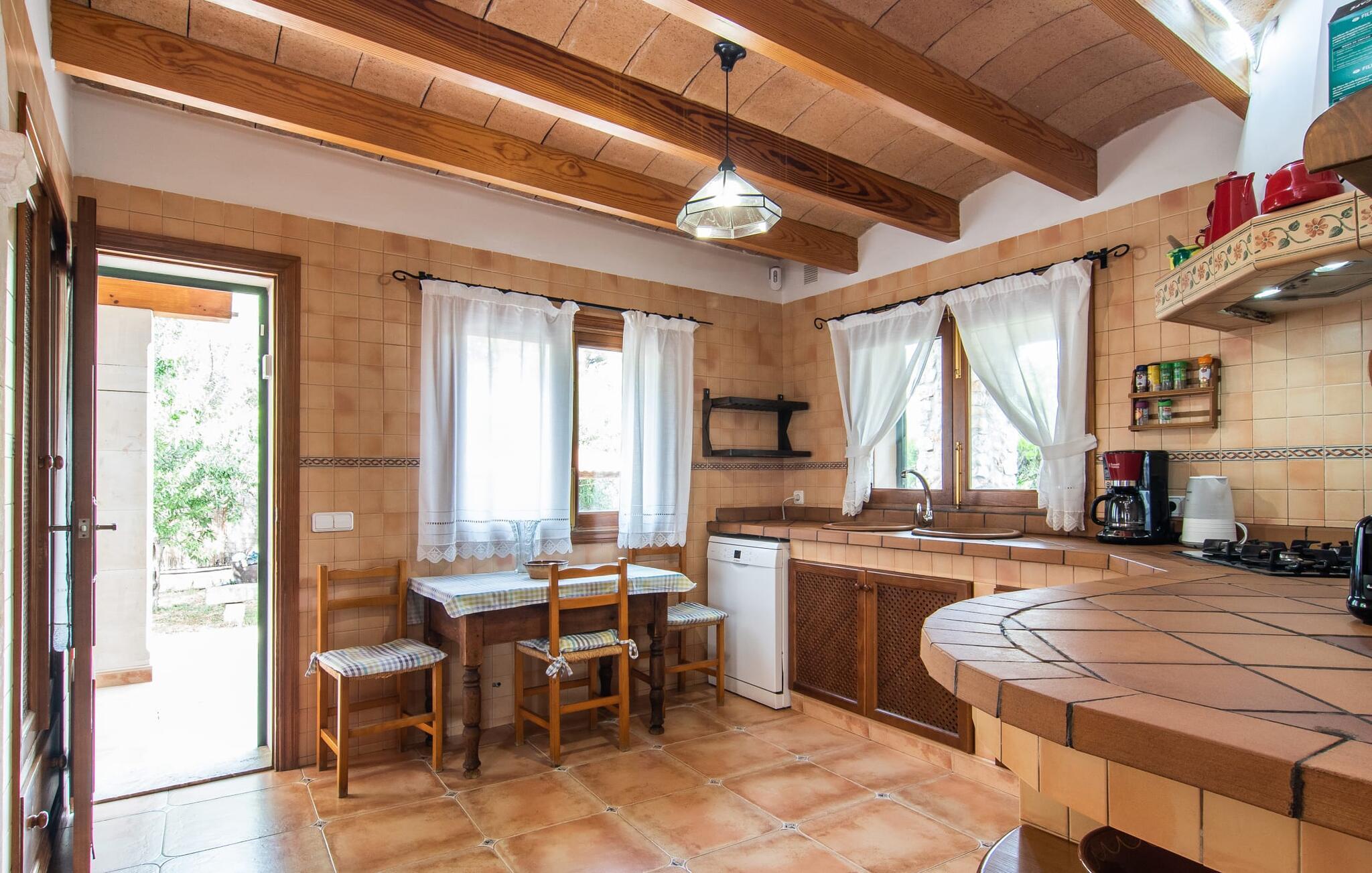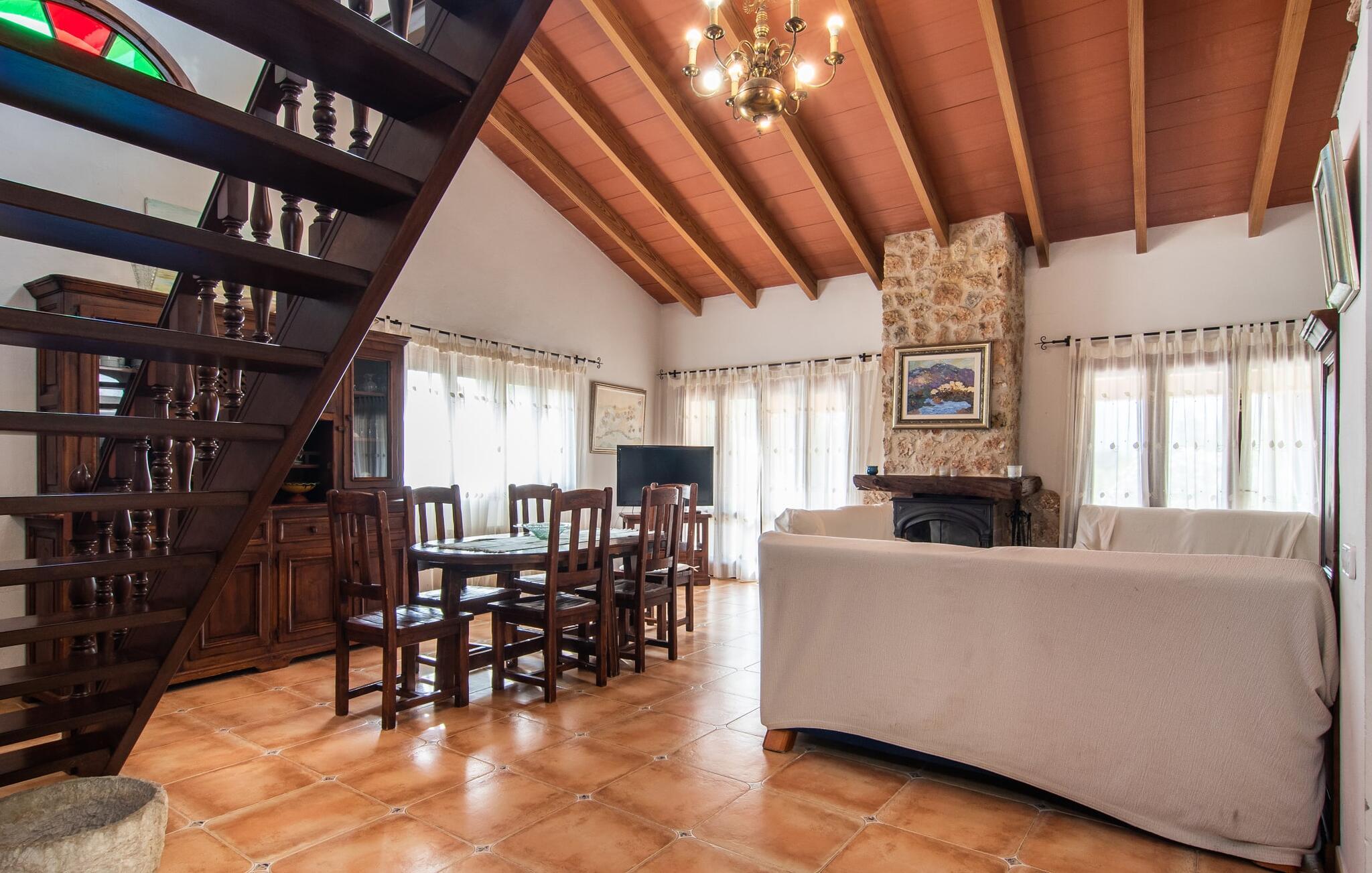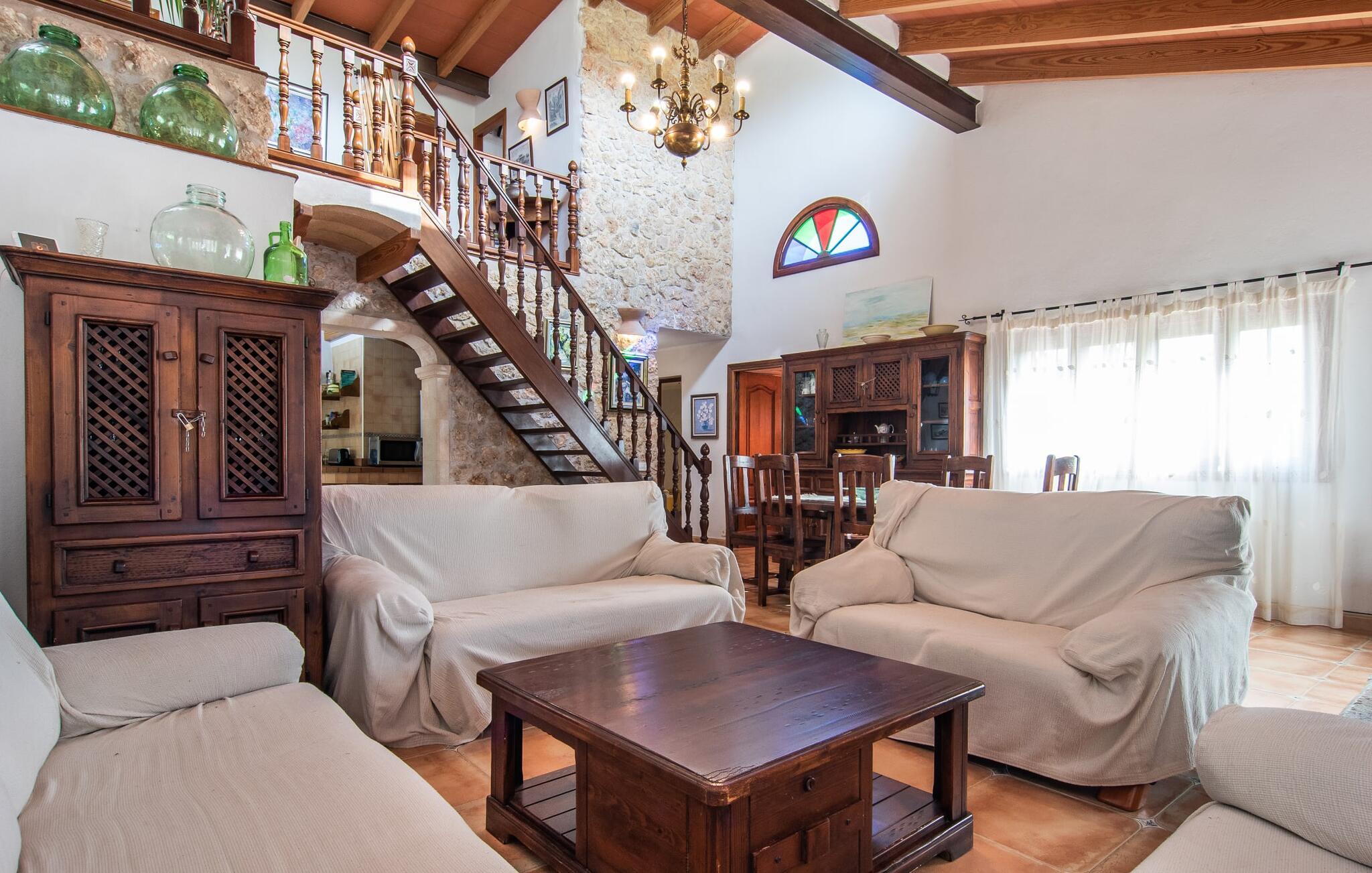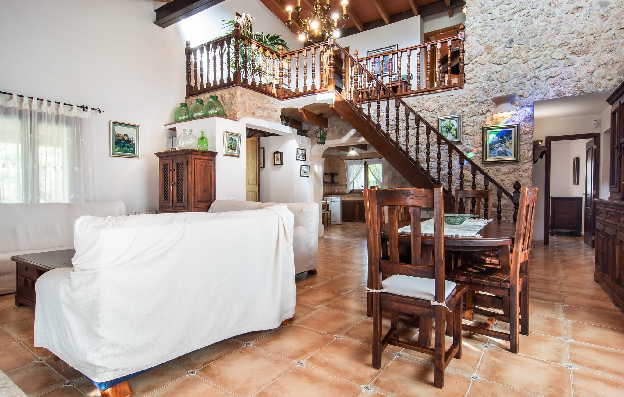Im Inneren der Villa empfängt Sie ein sehr komfortabler Wohn-/Essbereich, der mit viel Liebe zum Detail gestaltet und gestaltet und größtenteils mit traditionellen mallorquinischen Möbeln ausgestattet ist. Der Kamin strahlt Wärme und Gemütlichkeit aus und kleine Elemente wie das farbenfrohe halbrunde Glasfenster verleihen dem Raum einen besonderen Charme. Bequeme Sofas laden zum Entspannen oder Lesen eines guten Buches ein. Für Ihre Unterhaltung sorgen außerdem ein Flachbildfernseher und ein DVD-Player. An den Wohnbereich schließt sich eine voll ausgestattete Küche an, die durch zwei Fenster schön hell ist und mit der gewölbten Decke und einem dezenten Farbspiel sehr einladend wirkt. Eine ganz wunderbar gestaltete Treppe aus dunklem Holz führt hinauf zu einer lichtdurchfluteten Galerie, hinter der sich die weiteren Räume im ersten Stock befinden. Die drei Schlafzimmer im Haupthaus sind sehr komfortabel eingerichtet und bieten ausreichend Stauraum für Ihre Urlaubsgarderobe. In den Badezimmern wurden teilweise Originalfliesen und nostalgische Accessoires erhalten und mit modernen Elementen kombiniert, sodass Sie auf Annehmlichkeiten wie Regendusche und Badewanne nicht verzichten müssen. Eines der Badezimmer befindet sich im Erdgeschoss und kann als Gäste-WC genutzt werden, da es separat gelegen ist. Das zweite Badezimmer befindet sich im Obergeschoss und ist vom Schlafzimmer aus zugänglich. Sperrige Gegenstände wie Haartrockner oder Bügeleisen können Sie getrost zu Hause lassen, da diese in ausreichender Zahl im Ferienhaus vorhanden sind. In der Villa „Son Roura“ können Sie sich in typisch mallorquinischem Ambiente entspannen und Ihren Urlaub auf der Insel in vollen Zügen genießen.