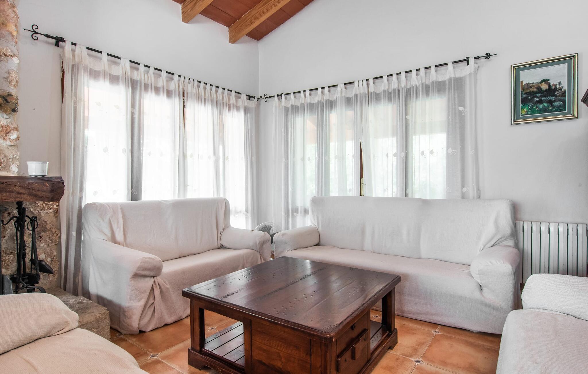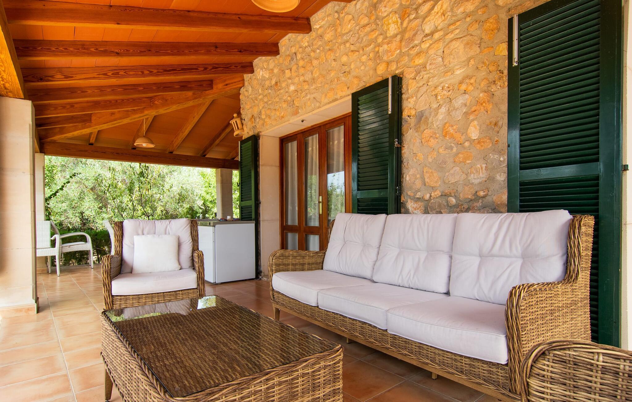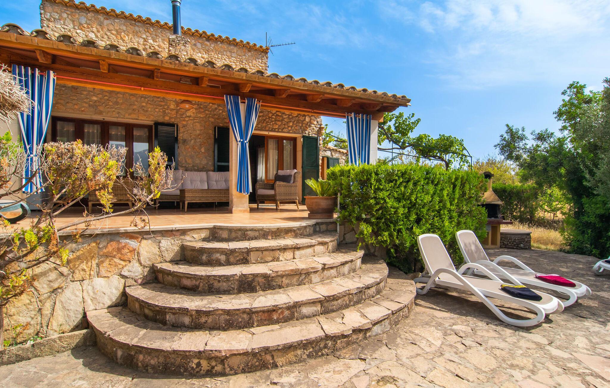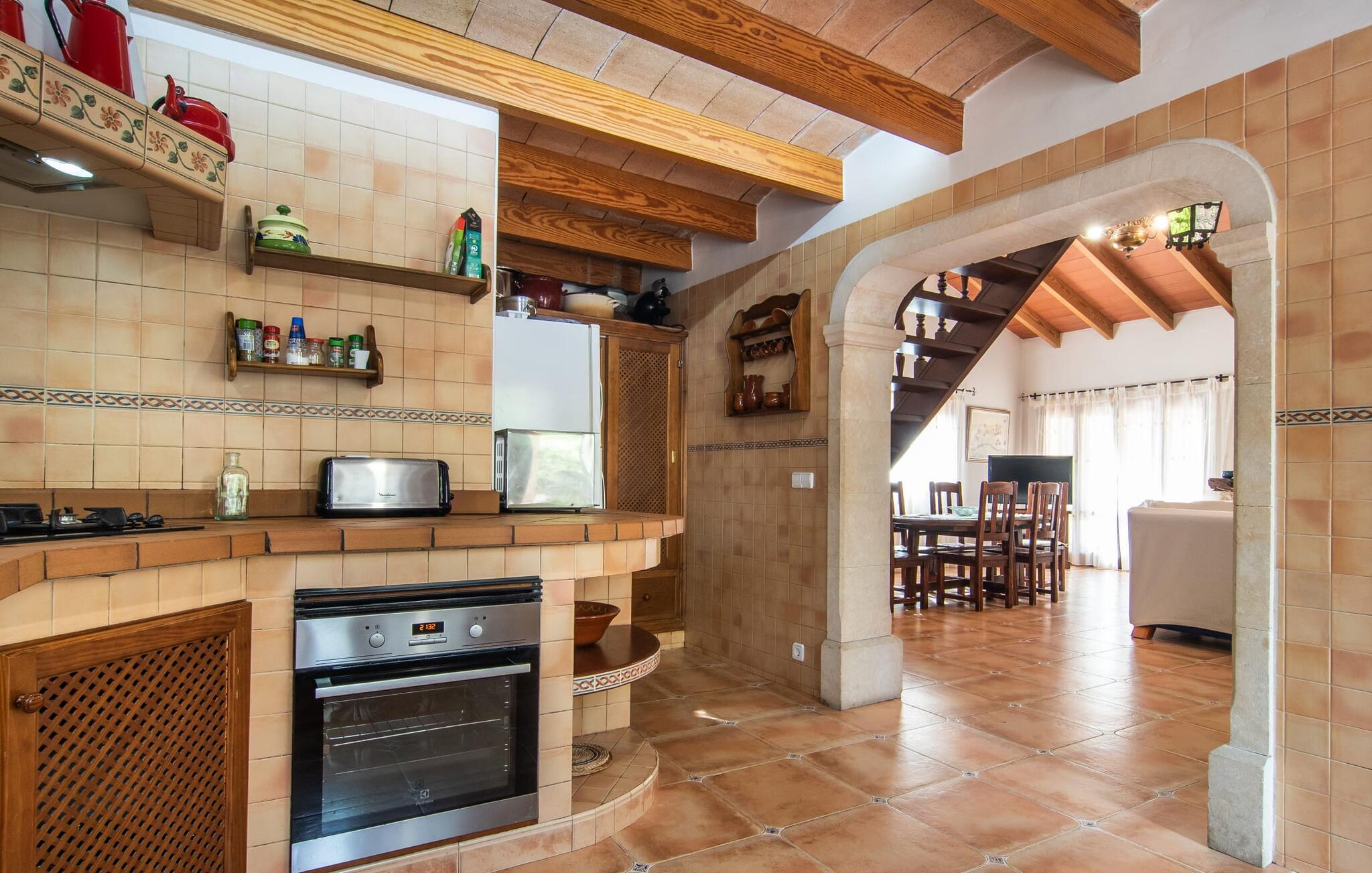 Im Inneren der Villa empfängt Sie ein sehr komfortabler Wohn-/Essbereich, der mit viel Liebe zum Detail gestaltet und gestaltet und größtenteils mit traditionellen mallorquinischen Möbeln ausgestattet ist. Der Kamin strahlt Wärme und Gemütlichkeit aus und kleine Elemente wie das farbenfrohe halbrunde Glasfenster verleihen dem Raum einen besonderen Charme. Bequeme Sofas laden zum Entspannen oder Lesen eines guten Buches ein. Für Ihre Unterhaltung sorgen außerdem ein Flachbildfernseher und ein DVD-Player. An den Wohnbereich schließt sich eine voll ausgestattete Küche an, die durch zwei Fenster schön hell ist und mit der gewölbten Decke und einem dezenten Farbspiel sehr einladend wirkt. Eine ganz wunderbar gestaltete Treppe aus dunklem Holz führt hinauf zu einer lichtdurchfluteten Galerie, hinter der sich die weiteren Räume im ersten Stock befinden. Die drei Schlafzimmer im Haupthaus sind sehr komfortabel eingerichtet und bieten ausreichend Stauraum für Ihre Urlaubsgarderobe. In den Badezimmern wurden teilweise Originalfliesen und nostalgische Accessoires erhalten und mit modernen Elementen kombiniert, sodass Sie auf Annehmlichkeiten wie Regendusche und Badewanne nicht verzichten müssen. Eines der Badezimmer befindet sich im Erdgeschoss und kann als Gäste-WC genutzt werden, da es separat gelegen ist. Das zweite Badezimmer befindet sich im Obergeschoss und ist vom Schlafzimmer aus zugänglich. Sperrige Gegenstände wie Haartrockner oder Bügeleisen können Sie getrost zu Hause lassen, da diese in ausreichender Zahl im Ferienhaus vorhanden sind. In der Villa „Son Roura“ können Sie sich in typisch mallorquinischem Ambiente entspannen und Ihren Urlaub auf der Insel in vollen Zügen genießen.