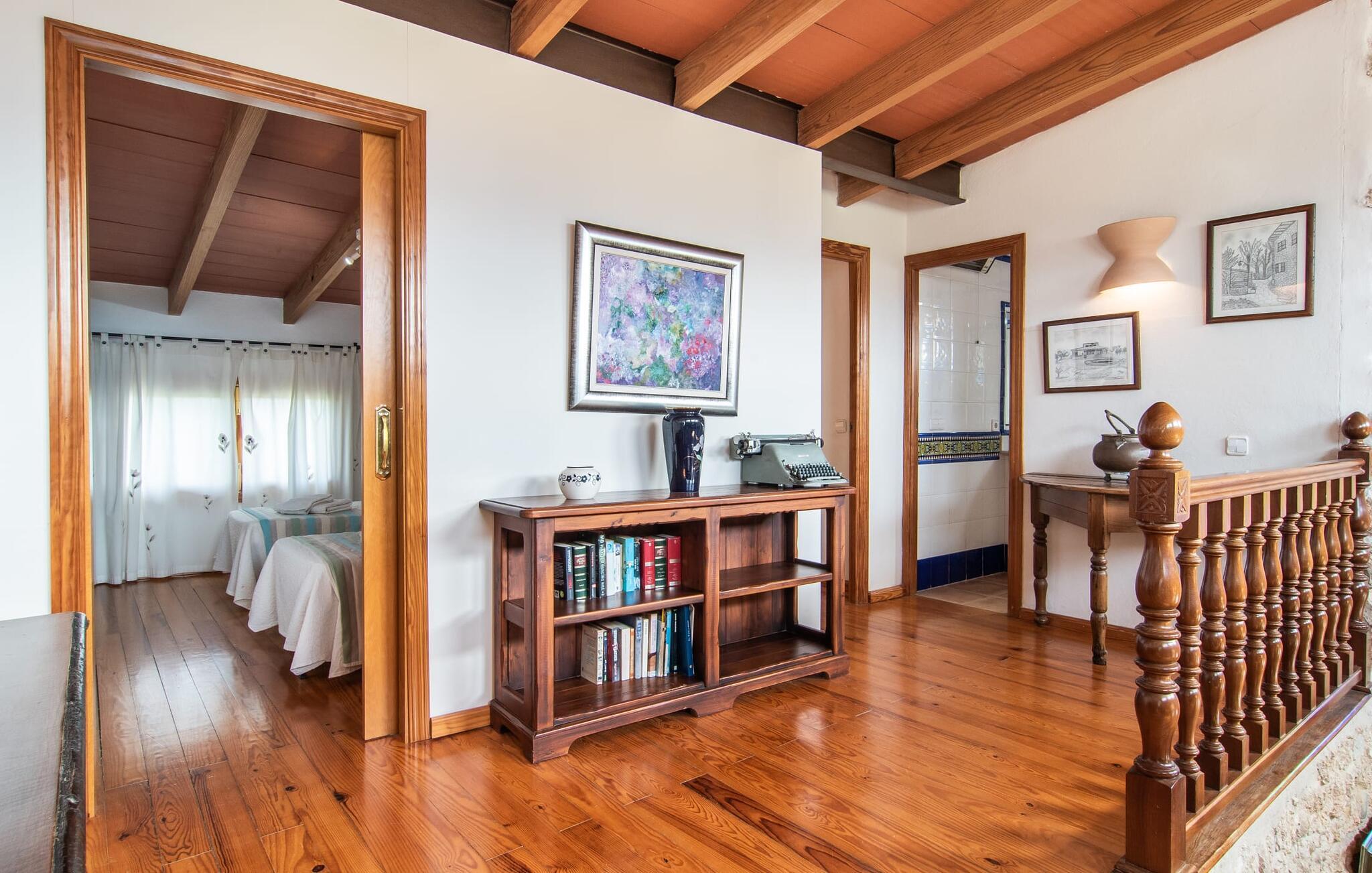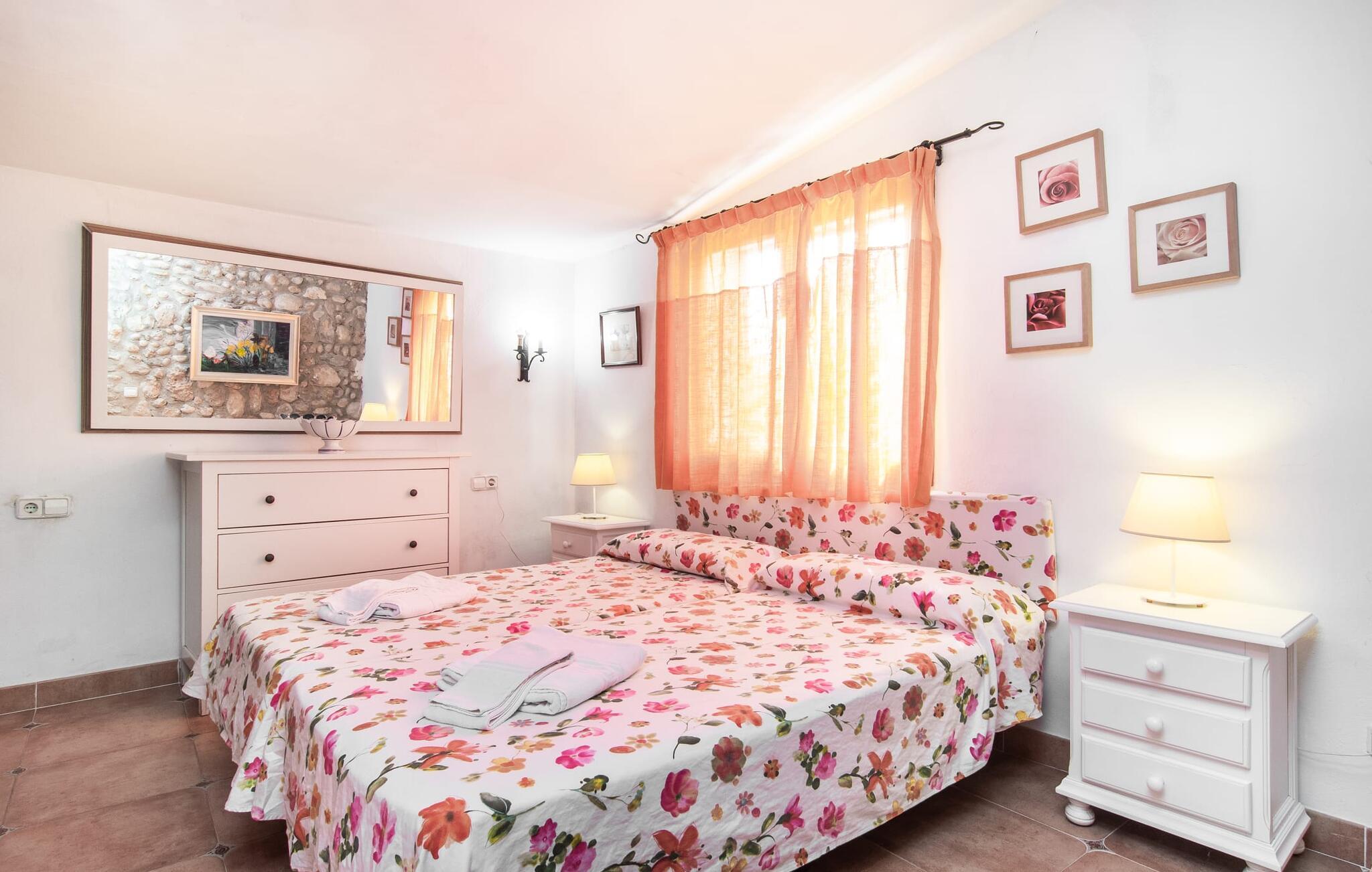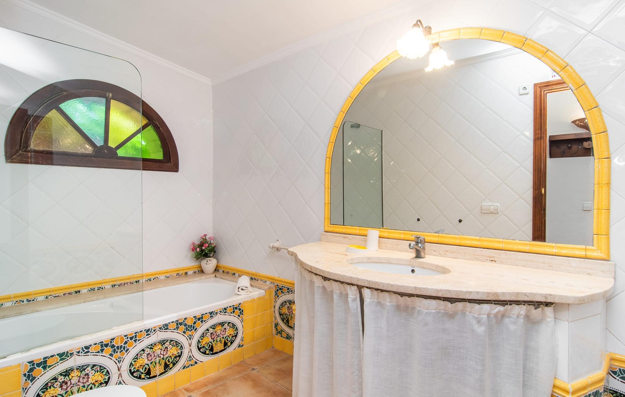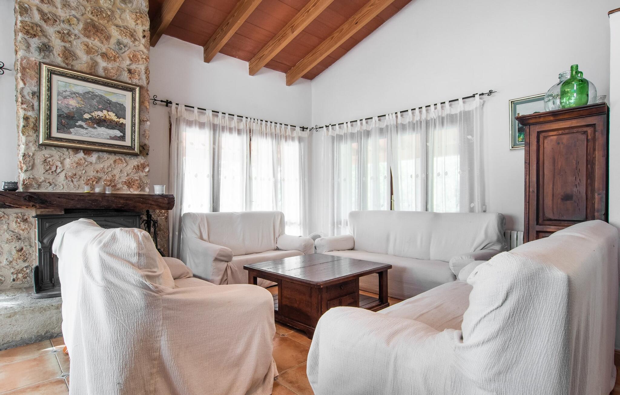 Im Inneren der Villa empfängt Sie ein sehr komfortabler Wohn-/Essbereich, der mit viel Liebe zum Detail gestaltet und gestaltet und größtenteils mit traditionellen mallorquinischen Möbeln ausgestattet ist. Der Kamin strahlt Wärme und Gemütlichkeit aus und kleine Elemente wie das farbenfrohe halbrunde Glasfenster verleihen dem Raum einen besonderen Charme. Bequeme Sofas laden zum Entspannen oder Lesen eines guten Buches ein. Für Ihre Unterhaltung sorgen außerdem ein Flachbildfernseher und ein DVD-Player. An den Wohnbereich schließt sich eine voll ausgestattete Küche an, die durch zwei Fenster schön hell ist und mit der gewölbten Decke und einem dezenten Farbspiel sehr einladend wirkt. Eine ganz wunderbar gestaltete Treppe aus dunklem Holz führt hinauf zu einer lichtdurchfluteten Galerie, hinter der sich die weiteren Räume im ersten Stock befinden. Die drei Schlafzimmer im Haupthaus sind sehr komfortabel eingerichtet und bieten ausreichend Stauraum für Ihre Urlaubsgarderobe. In den Badezimmern wurden teilweise Originalfliesen und nostalgische Accessoires erhalten und mit modernen Elementen kombiniert, sodass Sie auf Annehmlichkeiten wie Regendusche und Badewanne nicht verzichten müssen. Eines der Badezimmer befindet sich im Erdgeschoss und kann als Gäste-WC genutzt werden, da es separat gelegen ist. Das zweite Badezimmer befindet sich im Obergeschoss und ist vom Schlafzimmer aus zugänglich. Sperrige Gegenstände wie Haartrockner oder Bügeleisen können Sie getrost zu Hause lassen, da diese in ausreichender Zahl im Ferienhaus vorhanden sind. In der Villa „Son Roura“ können Sie sich in typisch mallorquinischem Ambiente entspannen und Ihren Urlaub auf der Insel in vollen Zügen genießen.