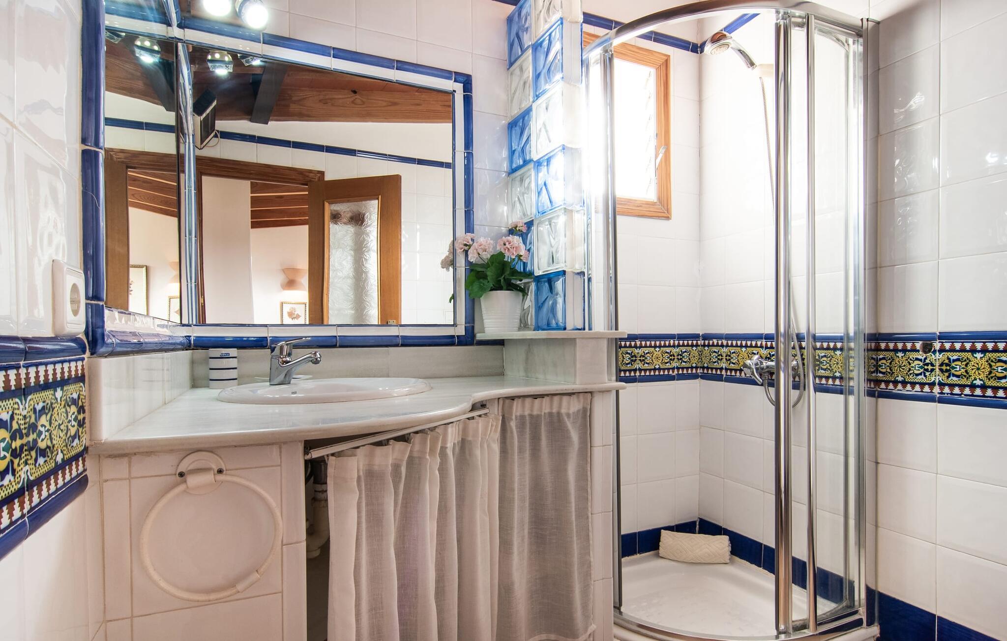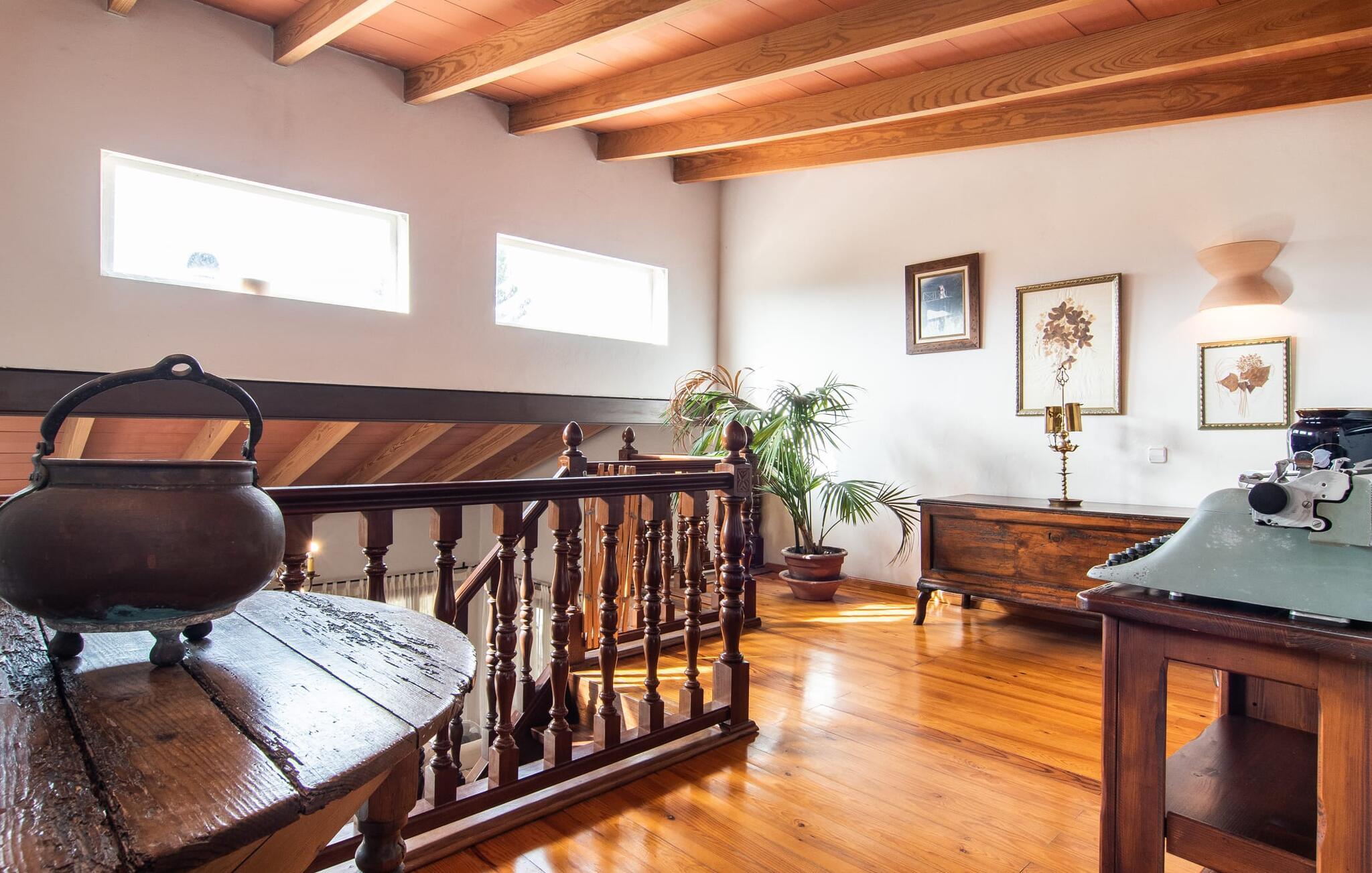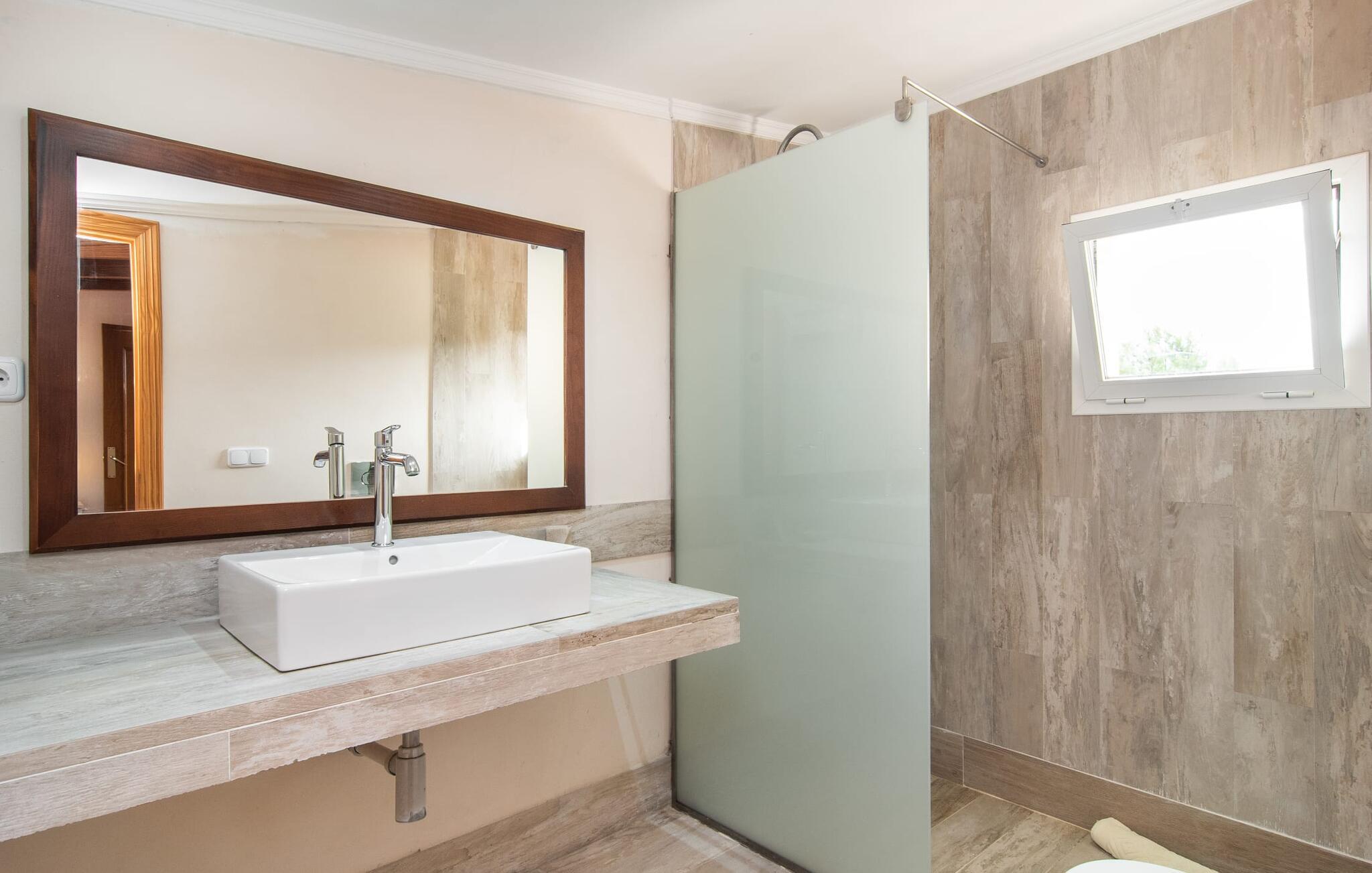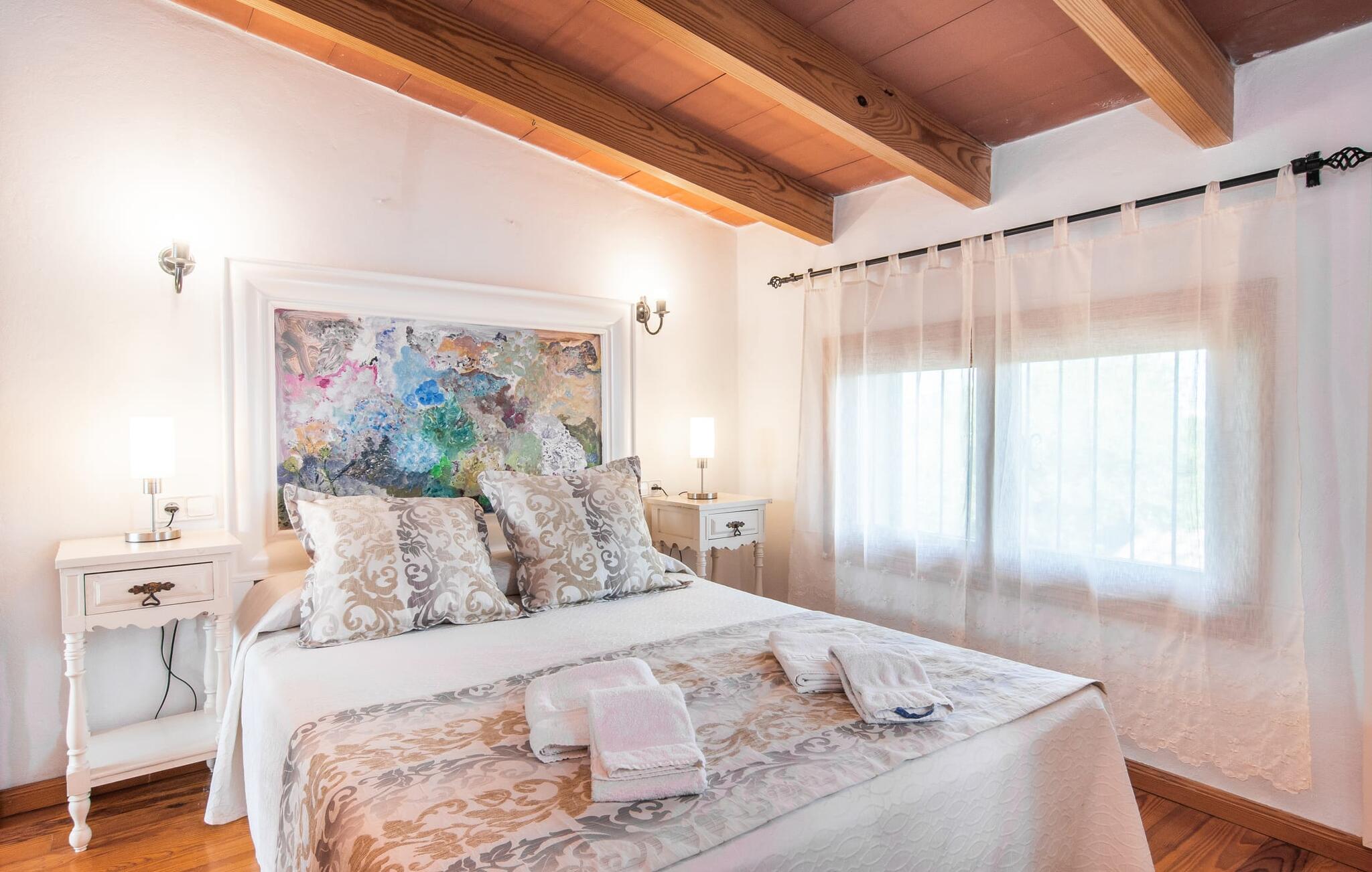 Im Inneren der Villa empfängt Sie ein sehr komfortabler Wohn-/Essbereich, der mit viel Liebe zum Detail gestaltet und gestaltet und größtenteils mit traditionellen mallorquinischen Möbeln ausgestattet ist. Der Kamin strahlt Wärme und Gemütlichkeit aus und kleine Elemente wie das farbenfrohe halbrunde Glasfenster verleihen dem Raum einen besonderen Charme. Bequeme Sofas laden zum Entspannen oder Lesen eines guten Buches ein. Für Ihre Unterhaltung sorgen außerdem ein Flachbildfernseher und ein DVD-Player. An den Wohnbereich schließt sich eine voll ausgestattete Küche an, die durch zwei Fenster schön hell ist und mit der gewölbten Decke und einem dezenten Farbspiel sehr einladend wirkt. Eine ganz wunderbar gestaltete Treppe aus dunklem Holz führt hinauf zu einer lichtdurchfluteten Galerie, hinter der sich die weiteren Räume im ersten Stock befinden. Die drei Schlafzimmer im Haupthaus sind sehr komfortabel eingerichtet und bieten ausreichend Stauraum für Ihre Urlaubsgarderobe. In den Badezimmern wurden teilweise Originalfliesen und nostalgische Accessoires erhalten und mit modernen Elementen kombiniert, sodass Sie auf Annehmlichkeiten wie Regendusche und Badewanne nicht verzichten müssen. Eines der Badezimmer befindet sich im Erdgeschoss und kann als Gäste-WC genutzt werden, da es separat gelegen ist. Das zweite Badezimmer befindet sich im Obergeschoss und ist vom Schlafzimmer aus zugänglich. Sperrige Gegenstände wie Haartrockner oder Bügeleisen können Sie getrost zu Hause lassen, da diese in ausreichender Zahl im Ferienhaus vorhanden sind. In der Villa „Son Roura“ können Sie sich in typisch mallorquinischem Ambiente entspannen und Ihren Urlaub auf der Insel in vollen Zügen genießen.
