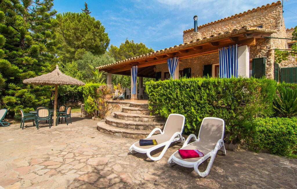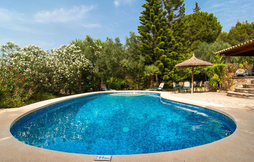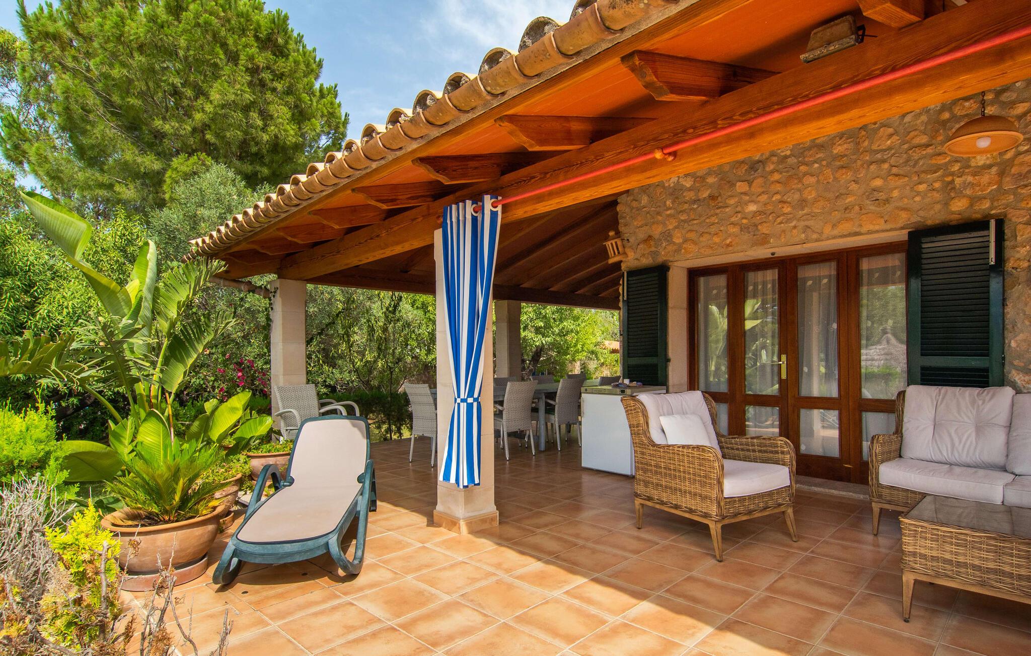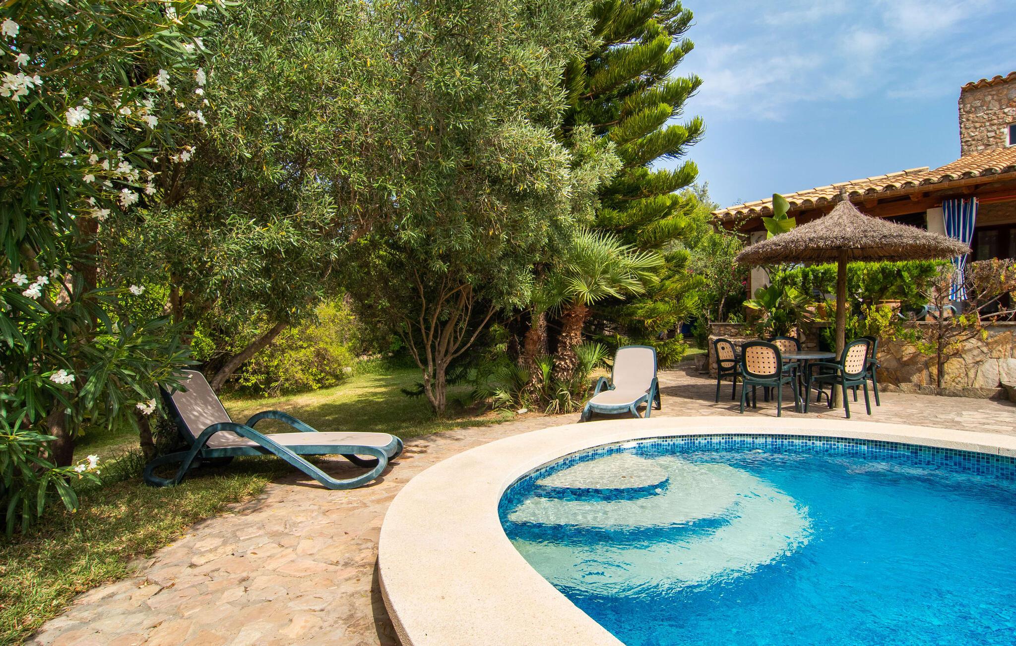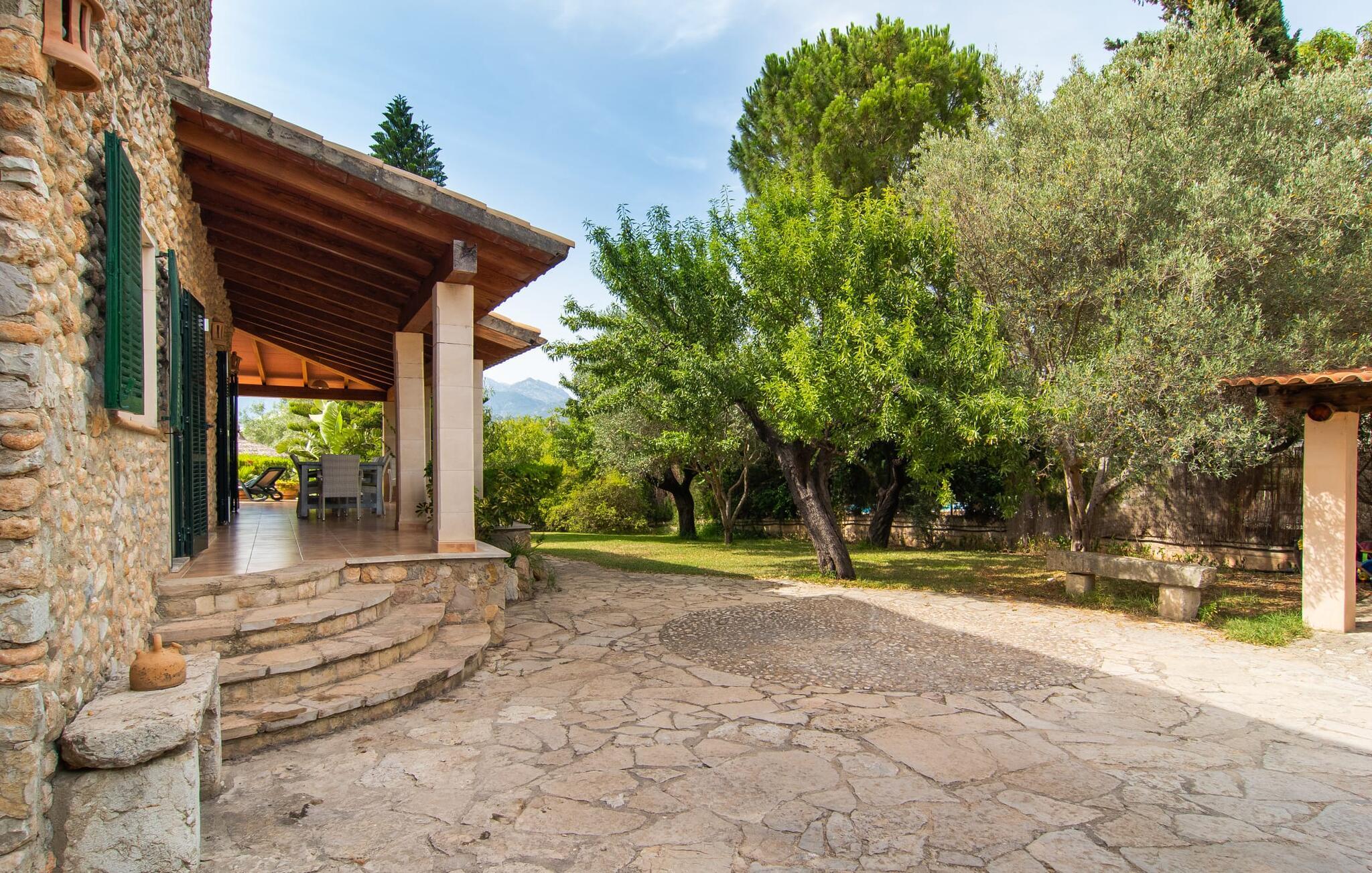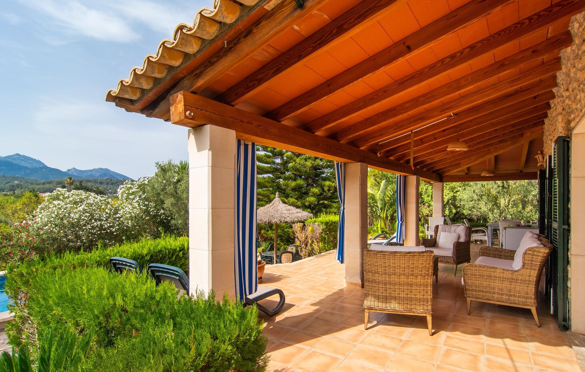 Die charismatische Villa „Son Roura“ ist ein sehr idyllisches, großes Natursteingebäude, das seine Besucher mit authentischem Charme um den Finger hüllt. Die Anfahrt dorthin gestaltet sich entspannt, da die attraktive Ferienresidenz ländlich, aber dennoch zentral gelegen und gut an das Verkehrsnetz angebunden ist. Fahrzeuge können auf dem Privatgrundstück im Schatten geparkt werden. Ein erster Blick in den angelegten Garten mit seinen vielen grünen Bäumen und mediterranen Pflanzen wird Sie sicherlich beeindrucken. Schnell wird klar, dass man hier eine wunderbare Auszeit genießen kann. Herzstück der Anlage ist die große Poolterrasse, die allen Urlaubern ausreichend Platz zum Entspannen und Sonnenbaden unter dem blauen Mittelmeerhimmel bietet. Wenn es zu heiß wird, gibt es viele schöne Rückzugsorte mit natürlichem Schatten oder Sie hüpfen einfach in den schicken Pool! Der mit Mosaiken geflieste Pool variiert in der Tiefe zwischen 1 und 2 m und ist auch bequem über eine Treppe erreichbar. Das kühle Nass sorgt für belebende Erfrischung und wohltuende Entspannung finden Sie auf einer der acht Sonnenliegen. Besonders angenehm auf die Seele wirken die fantastischen Ausblicke, die dieses Anwesen bietet: die Bergketten des Tramuntana-Gebirges. Diese Augenweide lässt sich auch von der hübschen, überdachten Außenterrasse der Villa aus bestaunen. Zum Entspannen lädt neben den attraktiven Loungemöbeln auch ein großer Esstisch ein und ein extra Kühlschrank ist ebenfalls vorhanden. So sind Kaltgetränke schnell serviert und Sie können ausgiebig entspannen. Der Grillmeister unter Ihnen wird sich über den riesigen Steingrill neben der L-förmigen Terrasse freuen, während die mitreisenden Kinder Tischtennis oder Basketball spielen können.