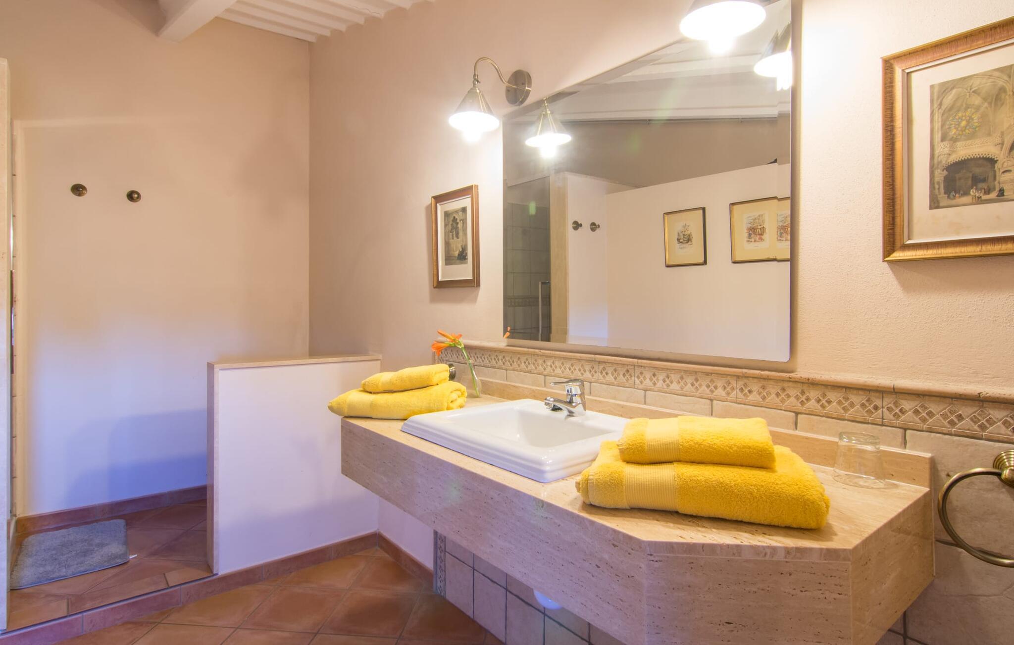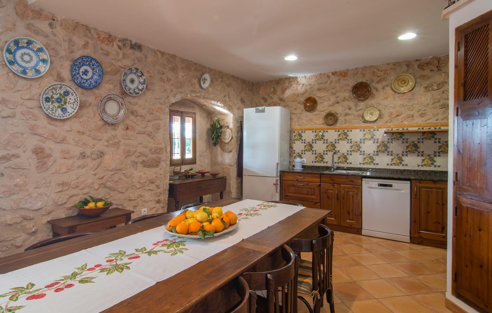 Im Inneren zeigt sich der mallorquinische Landhausstil im großzügigen, sonnendurchfluteten Wohn- und Essbereich mit hohen Decken, Terrakotta-, Holz- und Bruchsteinakzenten. Die Wohnküche bietet alles, was Sie für einen erholsamen Urlaub benötigen. Zwei der fünf Schlafzimmer liegen im Erdgeschoss und alle fünf sind klimatisiert. Vier Badezimmer sind en-suite und bieten Komfort für größere Gruppen. Jedes Schlafzimmer bietet einen atemberaubenden Blick auf die umliegende Natur und bereitet so die Bühne für unvergessliche Ausflüge.