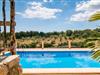 Die erhöhte Lage verfügt über einen Balkon mit Blick auf den Pool und die umliegenden Berge. Der Pool ist mit blauen Mosaikfliesen geschmückt und von bequemen Liegen und Sonnenschirmen umgeben. Der angelegte Garten umfasst Palmen und einen gepflegten Rasen, der sich ideal zum Entspannen oder Spielen mit den Kindern eignet.