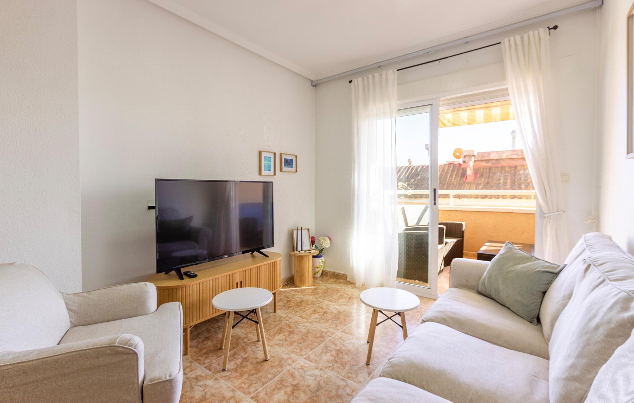 Die helle, ansprechende Wohnung erwartet Sie in idealer Lage nur ein paar Schritte vom Strand und vielen Aktivitätsmöglichkeiten entfernt. Die wohnliche Einrichtung und lebhafte Farben sorgen dafür, dass Sie hier in angenehmem Ambiente entspannen. Nach einem wunderbaren Urlaubstag können Sie im Wohnzimmer noch gemütlich zusammensitzen und Pläne für die nächsten Tage schmieden.