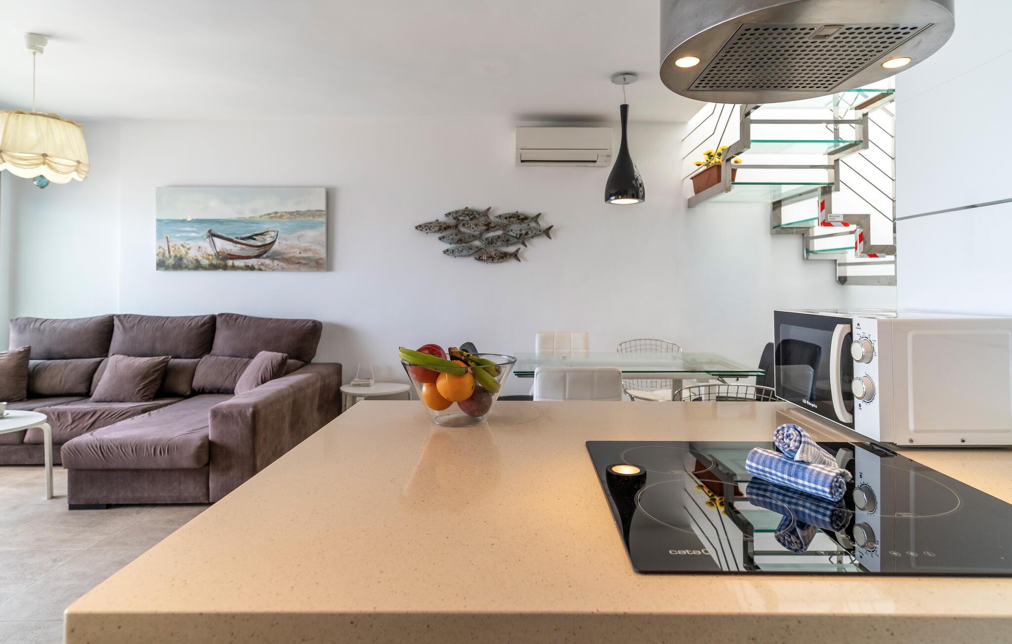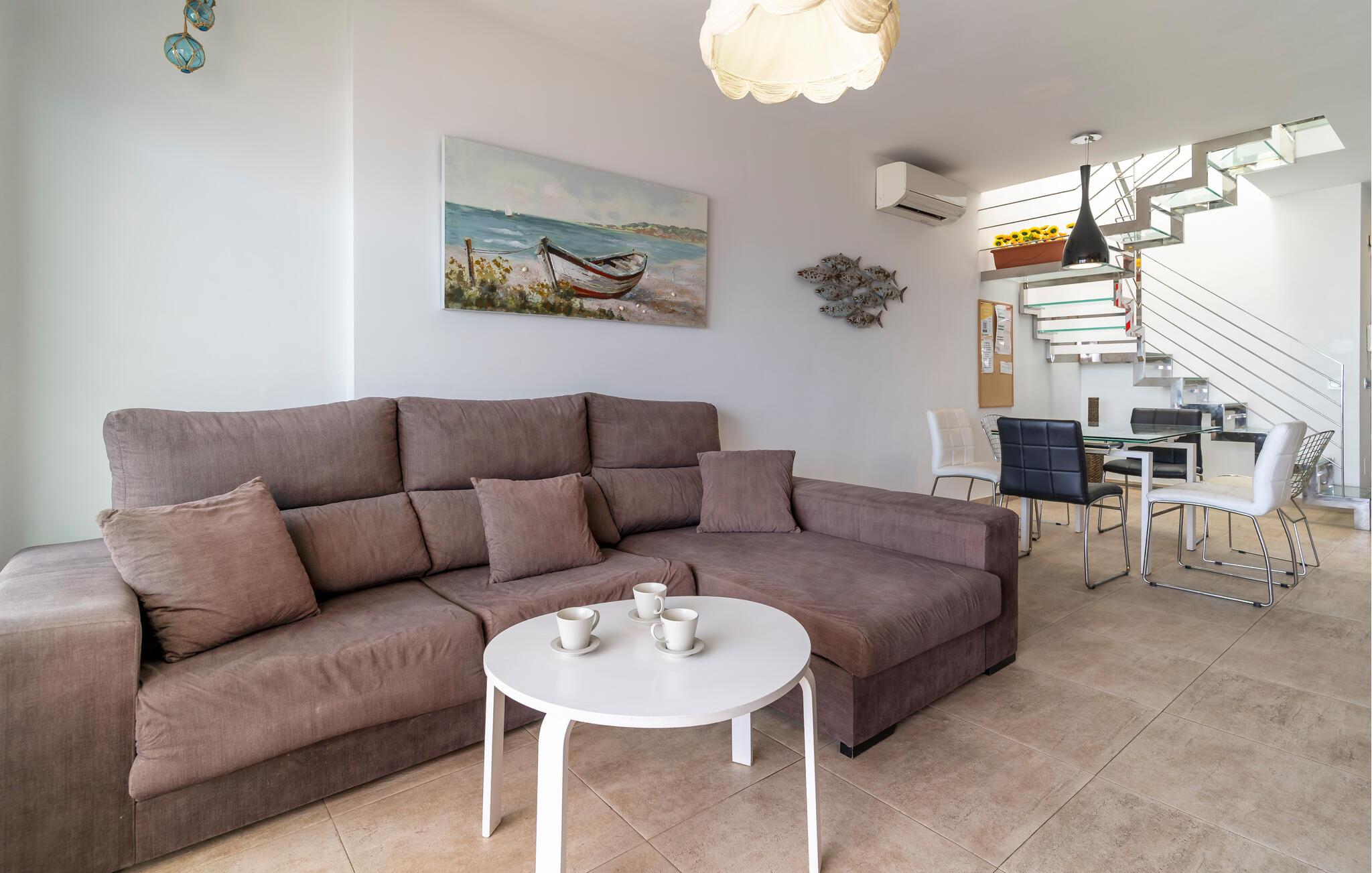 Nur wenige Schritte vom Sandstrand entfernt begrüßt Sie dieses moderne und geräumige Reihenhaus, in dem Sie sich an der wohltuenden Meeresbrise vom Alltag erholen. Bereiten Sie in geselliger Runde leckere Tapas und mediterrane Gerichte zu, freuen Sie sich auf gesellige Mahlzeiten und finden Sie nach einem langen Tag an der Sonne für einen gemütlichen Filmabend auf dem bequemen Sofa zusammen.