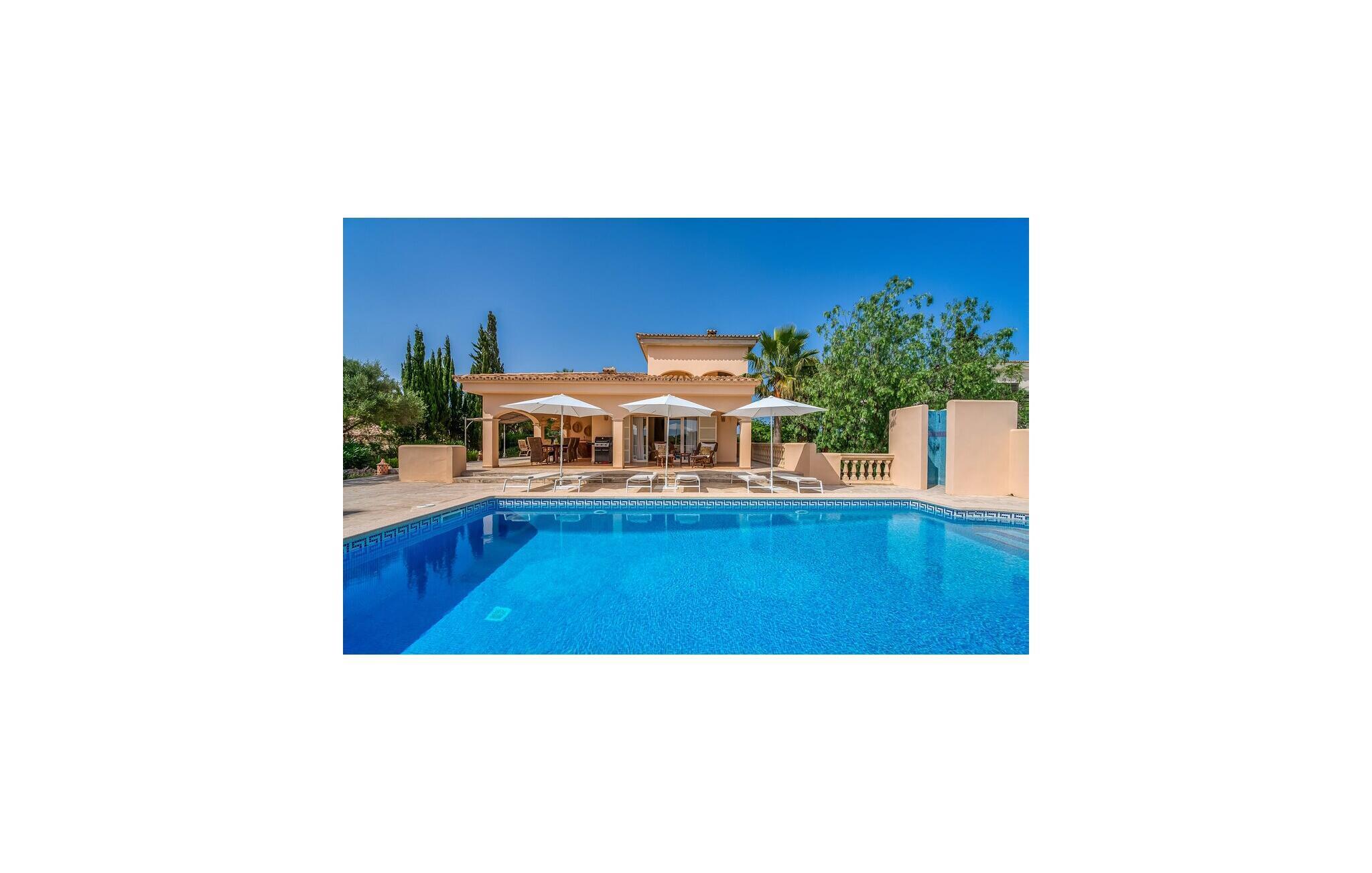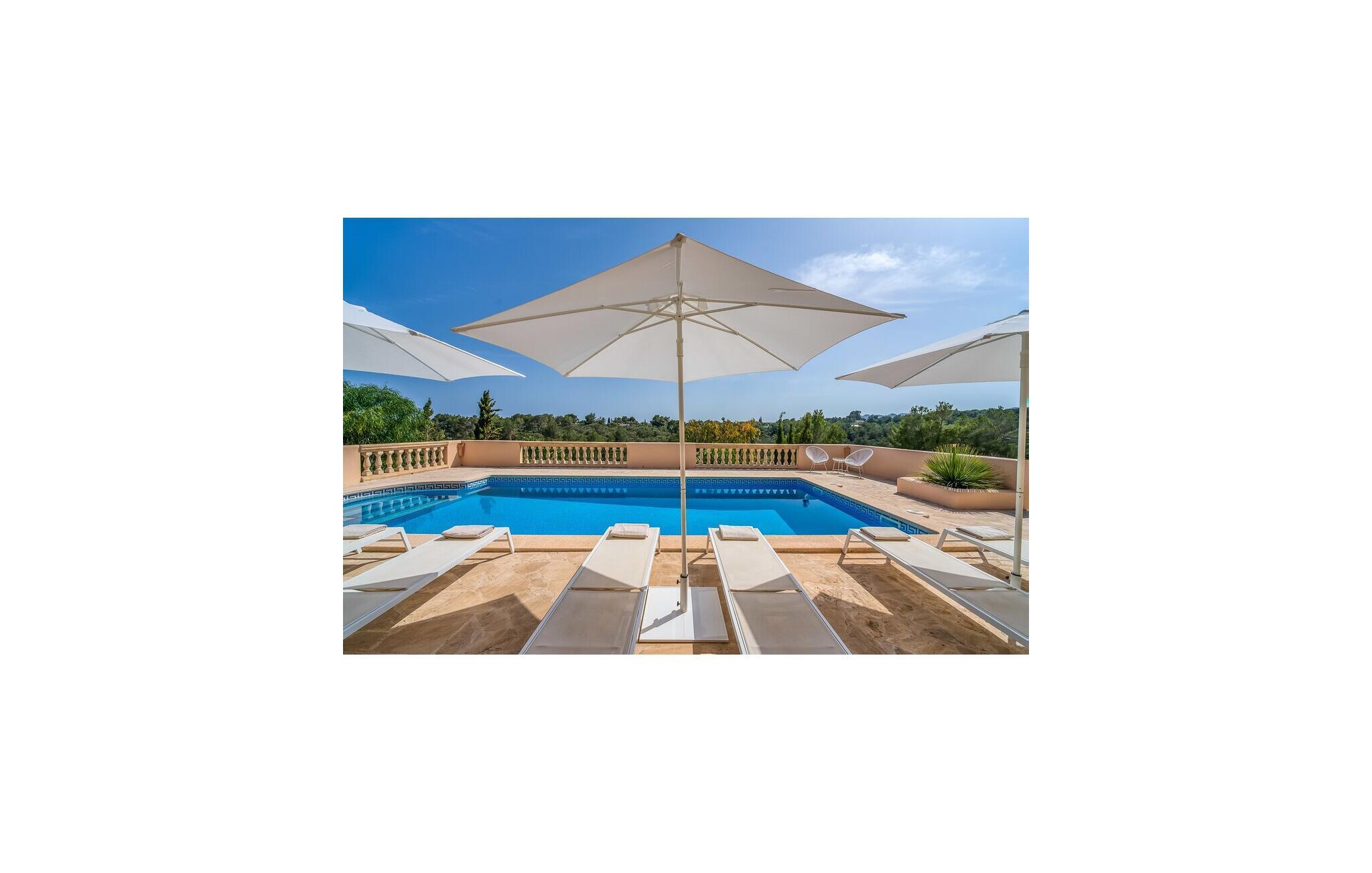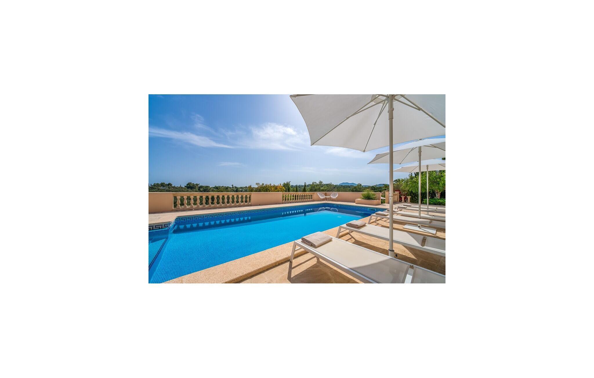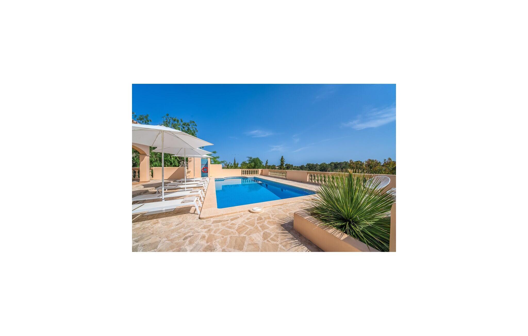 Eingebettet in den Hang und flankiert von Zypressen, Palmen und mediterranem Grün, bietet diese mallorquinische Villa "Turo del Sol" eine atemberaubende, nach Süden ausgerichtete Poolterrasse.