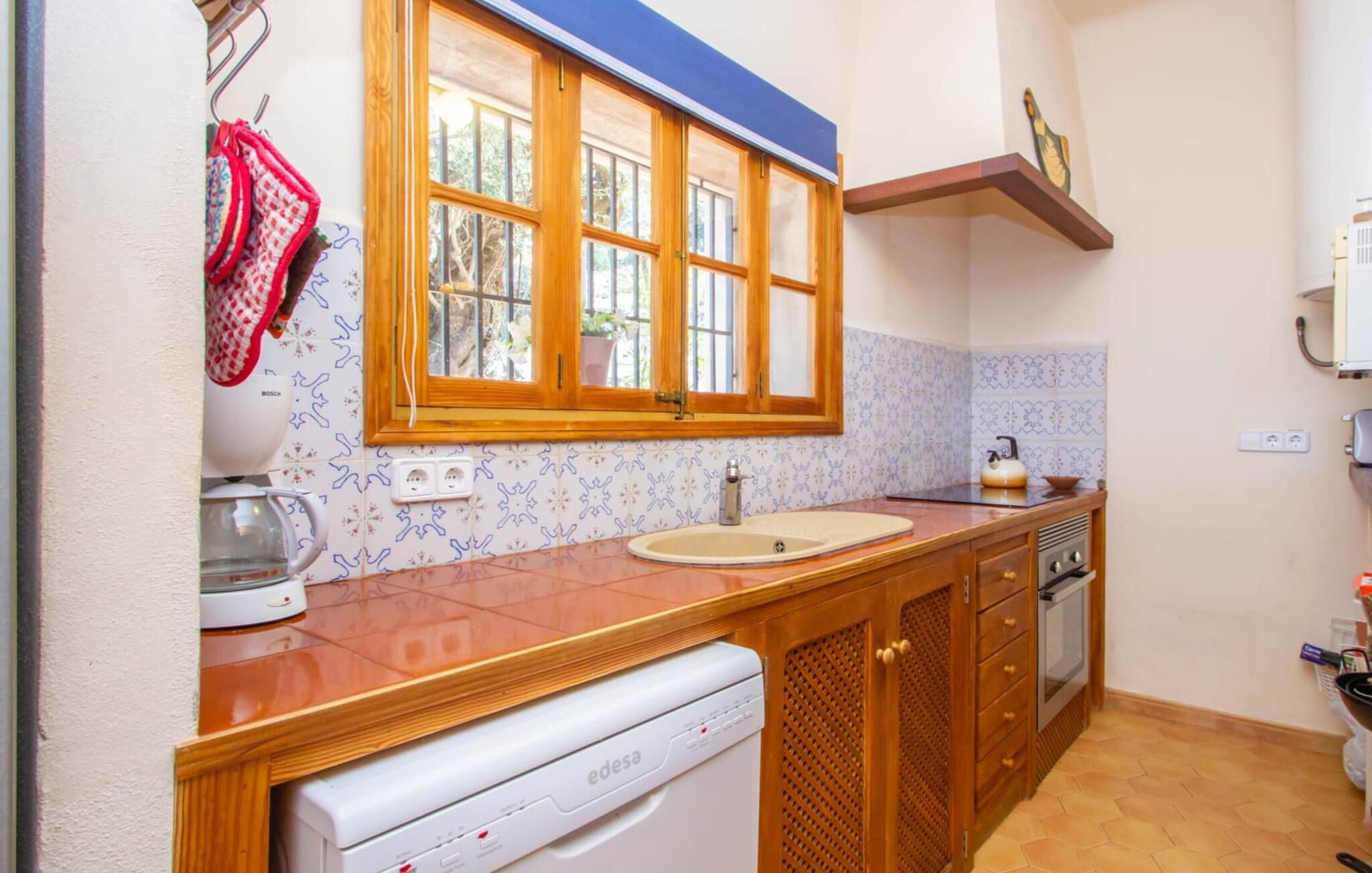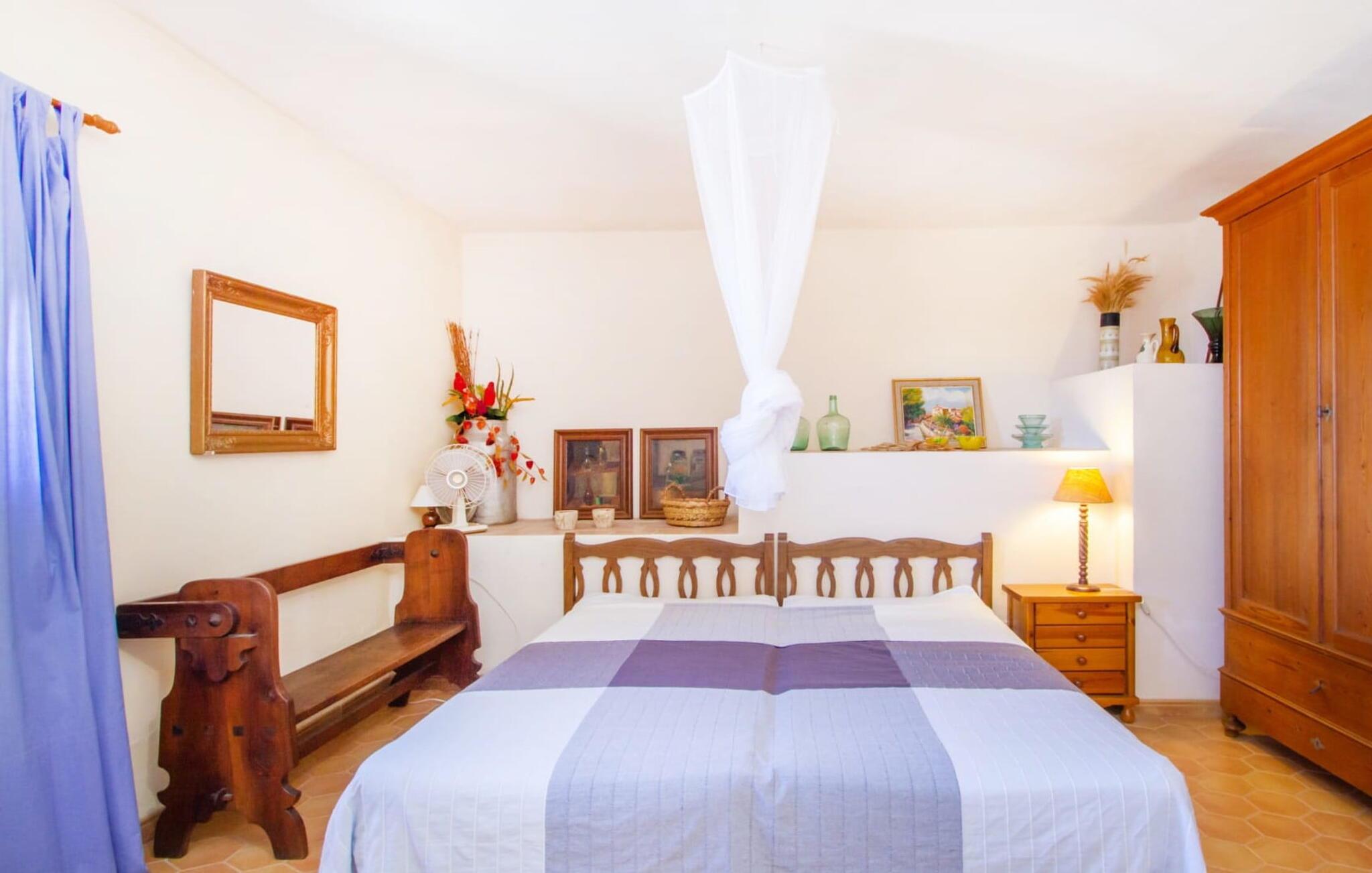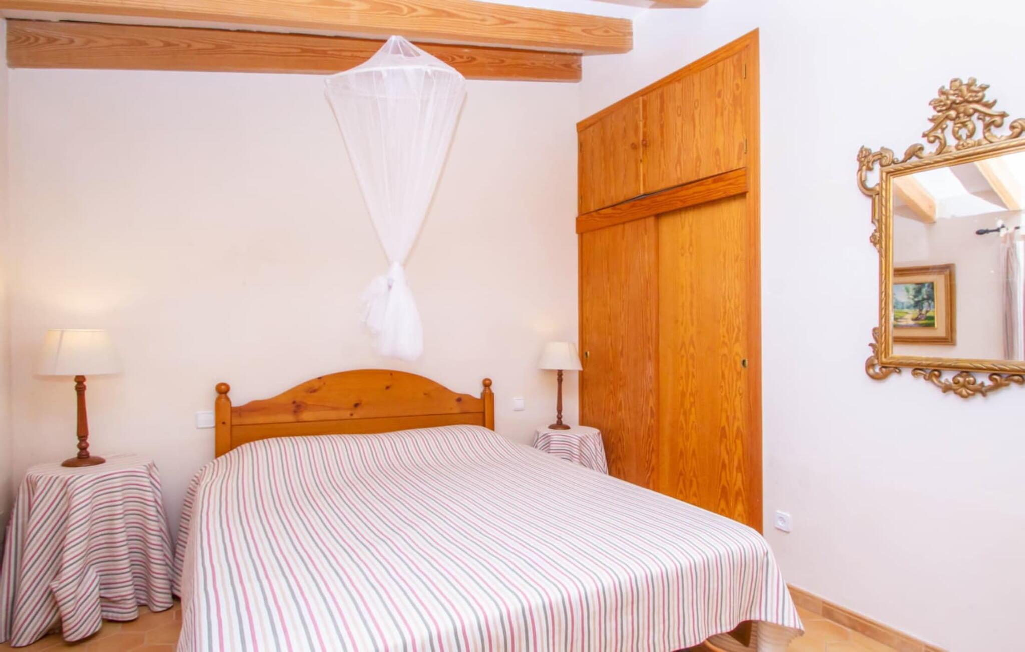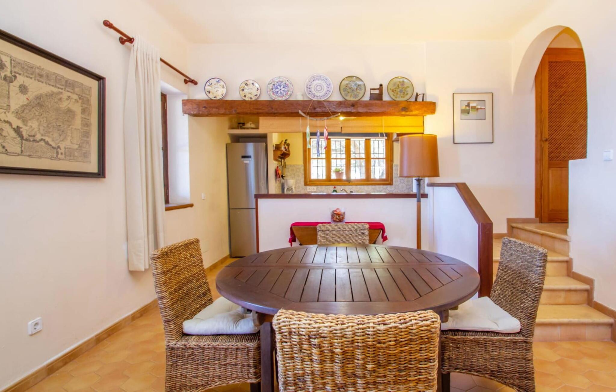 Das Haupthaus erstreckt sich über zwei Etagen und verfügt über zwei komfortable Doppelzimmer, ein Badezimmer mit Dusche und eine zusätzliche Toilette. Die offene Küche ist komplett ausgestattet und der Wohn-/Essbereich bietet den perfekten Ort zum Entspannen. Ein Anbau mit separatem Eingang bietet zusätzlichen Wohnraum, ein geräumiges Doppelzimmer mit eigenem Bad und ist somit ideal für Gruppen, die Privatsphäre suchen. Die Klimaanlage sorgt für Komfort in warmen Sommernächten, während die Einrichtung den authentischen mallorquinischen Stil widerspiegelt, perfekt, um in die lokale Kultur einzutauchen.