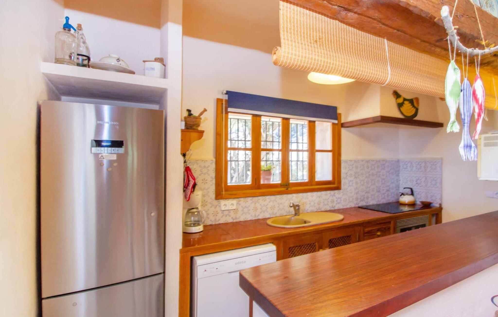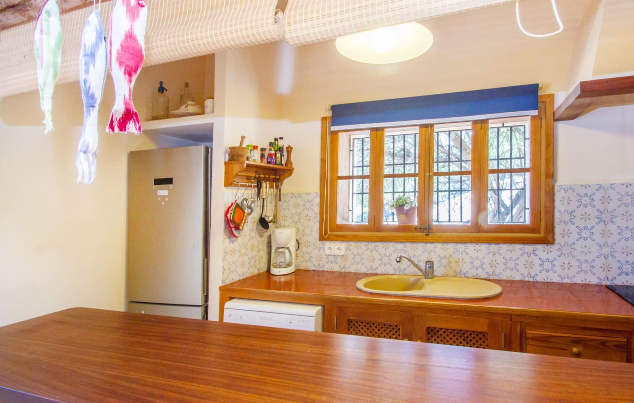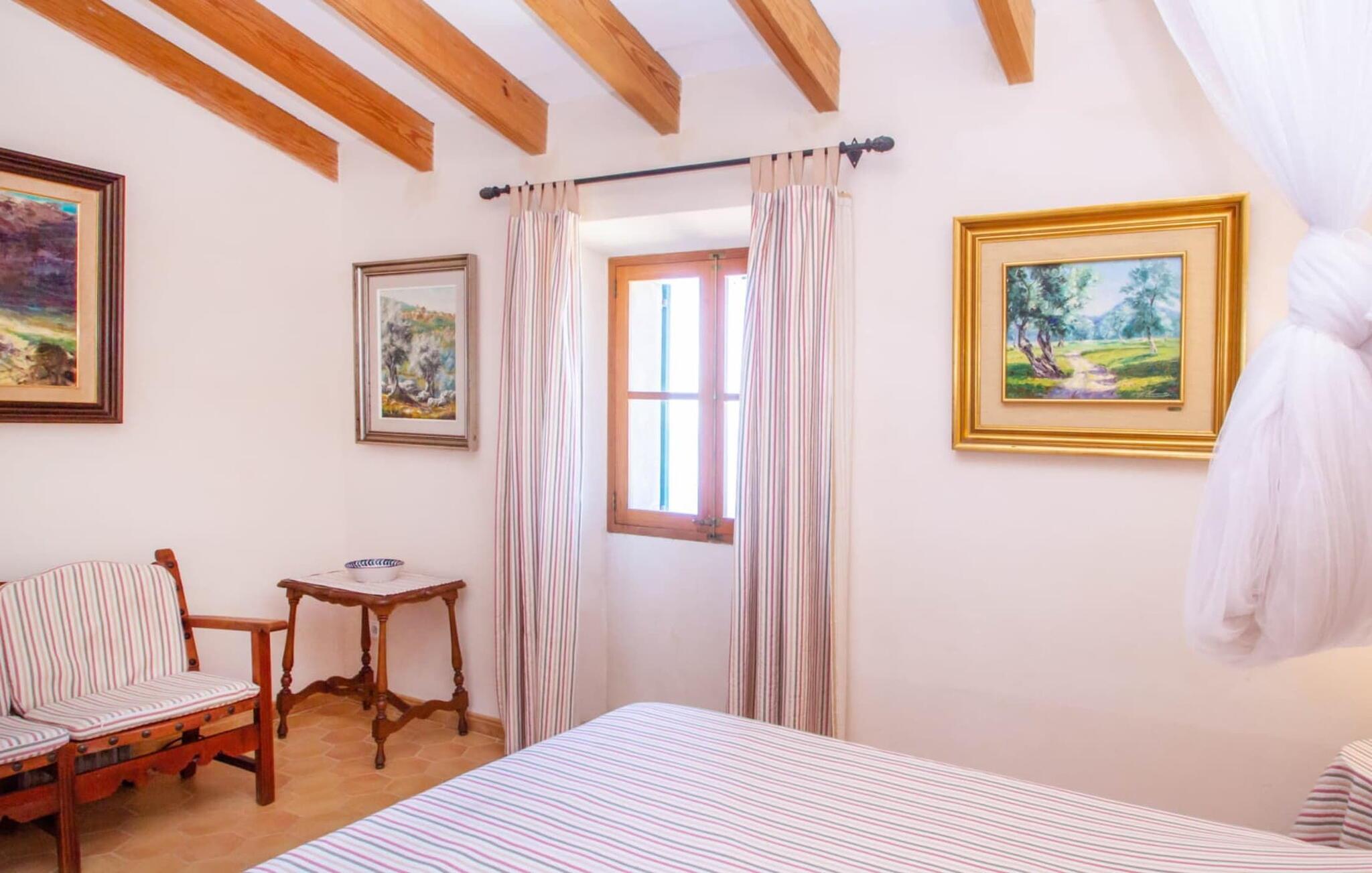Das Haupthaus erstreckt sich über zwei Etagen und verfügt über zwei komfortable Doppelzimmer, ein Badezimmer mit Dusche und eine zusätzliche Toilette. Die offene Küche ist komplett ausgestattet und der Wohn-/Essbereich bietet den perfekten Ort zum Entspannen. Ein Anbau mit separatem Eingang bietet zusätzlichen Wohnraum, ein geräumiges Doppelzimmer mit eigenem Bad und ist somit ideal für Gruppen, die Privatsphäre suchen. Die Klimaanlage sorgt für Komfort in warmen Sommernächten, während die Einrichtung den authentischen mallorquinischen Stil widerspiegelt, perfekt, um in die lokale Kultur einzutauchen.