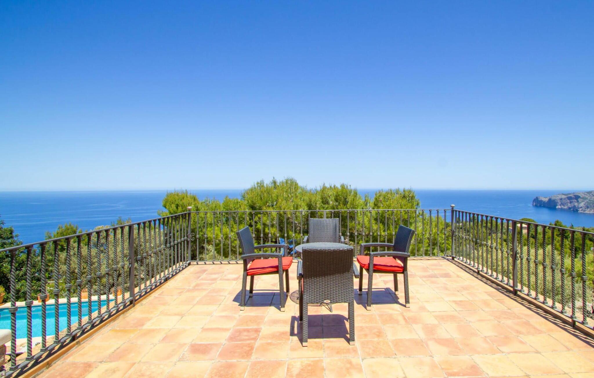Das Anwesen verfügt über eine einzigartige mehrstöckige Terrasse, die sich bis zum Rand einer Klippe erstreckt und einen perfekten Rahmen zum Entspannen bietet. Die teilweise überdachten Sitzbereiche bieten Schatten für Sommertage, während die Außenbereiche Frühstücks- und Poolterrassen mit Liegestühlen umfassen. Genießen Sie ein Bad im Pool, umgeben von weiteren Sitzmöglichkeiten. Ein Highlight ist der Panoramablick auf das Meer, der die beeindruckende Südwestküste Mallorcas zeigt.