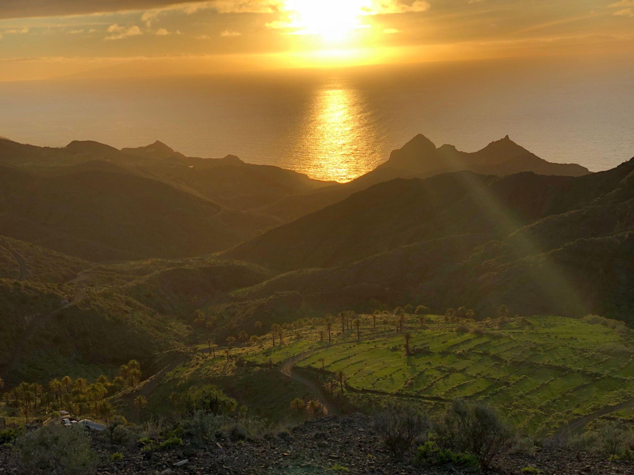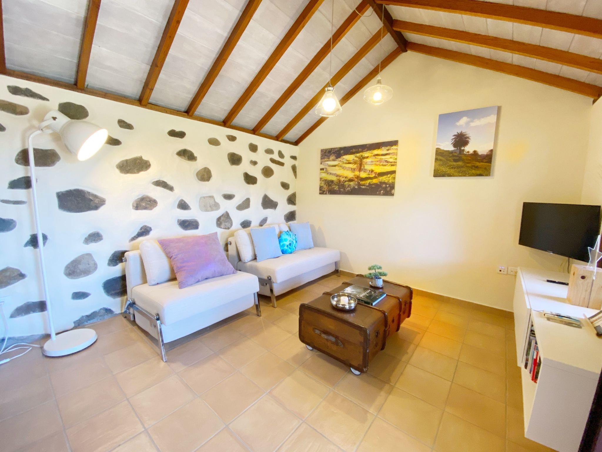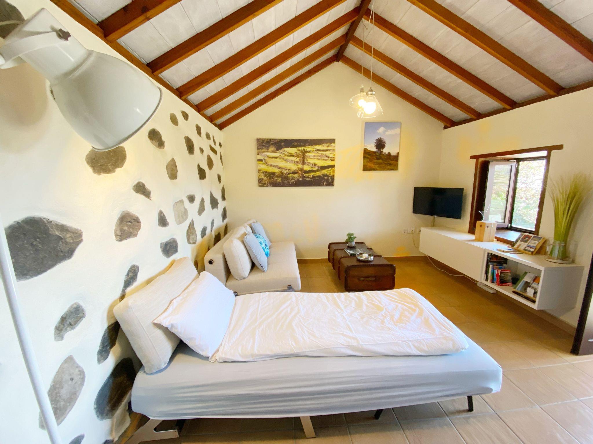Ein jahrhundertealtes Haus, das mit hochwertigen Materialien und allem Komfort des 21. Jahrhunderts restauriert wurde. Jahrhunderts. Umgeben von Palmen und mit unglaublichem Blick auf die Berge und das Meer. Von unserer Terrasse aus können Sie traumhafte Sonnenuntergänge genießen. Das Haus hat eine Etage, die über eine breite Treppe vom Parkplatz aus erreichbar ist. Das Haus hat einen traditionellen gomerischen Grundriss, bei dem alle Räume unter einer Außenveranda zusammenlaufen, die Zimmer sind vom Innenhof des Hauses aus verbunden, so dass die Verbindung mit der Natur und der Landschaft, die uns umgibt, immer präsent ist. Das Hauptschlafzimmer mit Holzdecke hat ein Doppelbett (150x200) mit viskoelastischer Matratze. Kleiderschrank mit Kleiderbügeln und Spiegel. Im Wohn-Esszimmer gibt es zwei Schlafsofas (eines 90 cm breit und das andere 1,40 cm breit). Smart-TV mit Netflix und kostenlosem Internet, Inselführer und Wanderbücher, Brettspiele für Erwachsene und Kinder, Kleiderschrank und Esstisch mit vier Stühlen und Kerzen zur Einstimmung. Die Küche ist komplett ausgestattet mit Backofen, Ceran- und Induktionskochfeld, Geschirrspüler, großem Kühlschrank mit Gefrierfach, Wasserkocher, italienischer und Filterkaffeemaschine, Toaster, Mixer, Milchaufschäumer, Weingläsern, Reinigungsmitteln, Staubsauger, etc. Großes Badezimmer mit Dusche, Haartrockner und Fön, Shampoo, Körpergel, Erste-Hilfe-Kasten, Hygieneartikel für Frauen, usw. 100 Liter elektrischer Boiler. In der Unterkunft gibt es ein Reisebett für kleine Kinder. Waschküche mit Waschmaschine, Wäscheständer.
