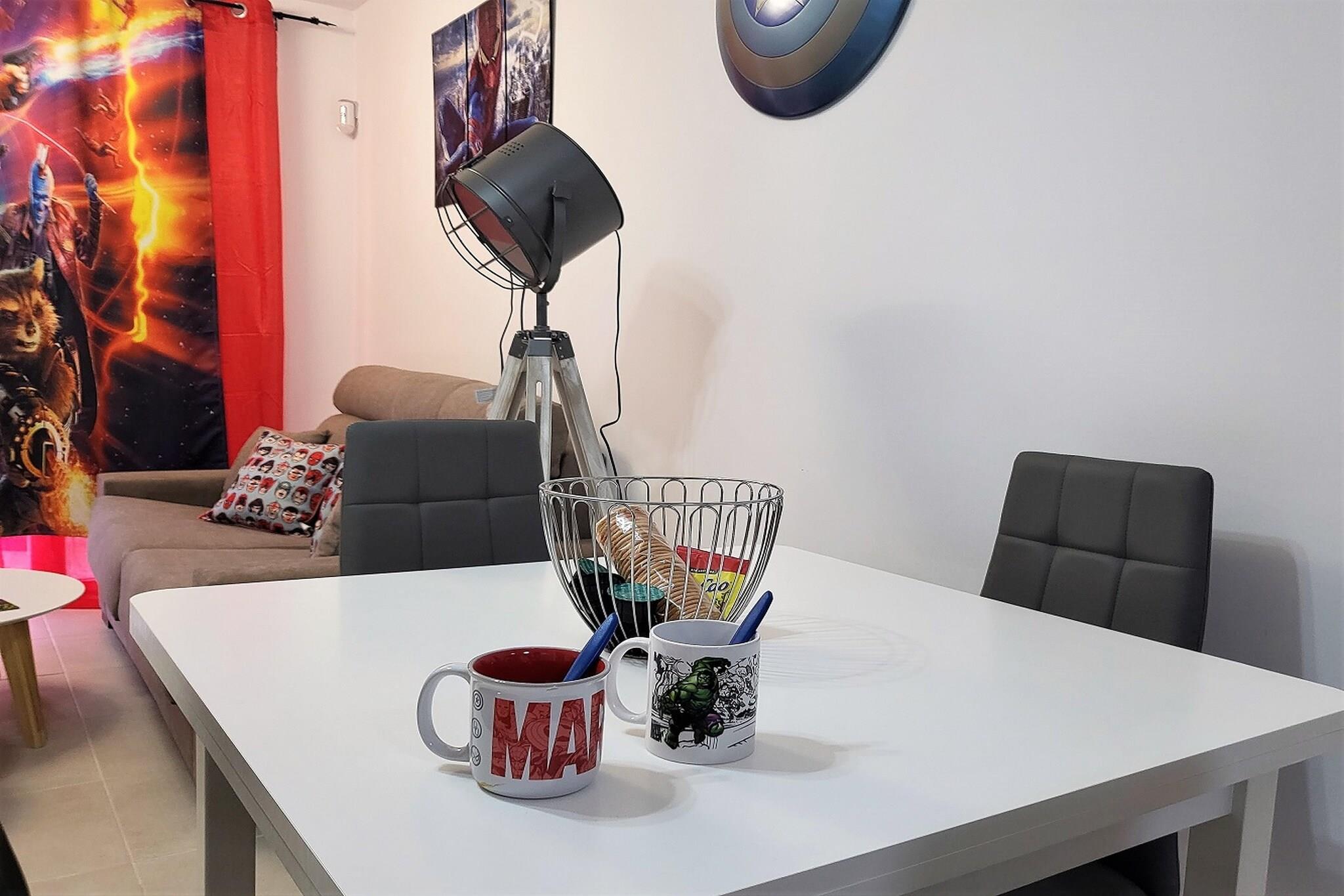 Dieses Marvel-Themenapartment ist ideal für Liebhaber der Marvel-Welt, komplett dekoriert und mit Überraschungen, die Ihnen den Atem rauben werden, wie ein 2 Meter großer Iron Man. Im Obergeschoss finden Sie eine Terrasse mit privatem Pool zum Erfrischen (inklusive Reinigungsservice alle zwei Tage). Die Wohnung ist perfekt für eine Familie mit Kindern. Das Anwesen ist von vielen Meeresstränden in unmittelbarer Nähe umgeben, der nächste ist der 400 m entfernte Strand Playa Vera. Genießen Sie leckere Gerichte aus den Restaurants in unmittelbarer Nähe. Ein Ausflug nach Palomares (2 km), Villaricos (4 km) und Garrucha (9,5 km) ist gut möglich. Dieses üppige Haus hat ein Solarium, eine Dachterrasse, einen Sonnenschirm, eine Hängematte und einen Grill für Ihren Gebrauch. In der offenen Küche, die von Eingang 2 zugänglich ist, können Sie schmackhafte hausgemachte Mahlzeiten zubereiten. Heizung und Klimaanlage halten Sie in den Winter- und Sommermonaten warm bzw. kühl. Parken Sie Ihre Autos in der Garage und für Kinder haben Sie die Spielgeräte (gemeinsam).