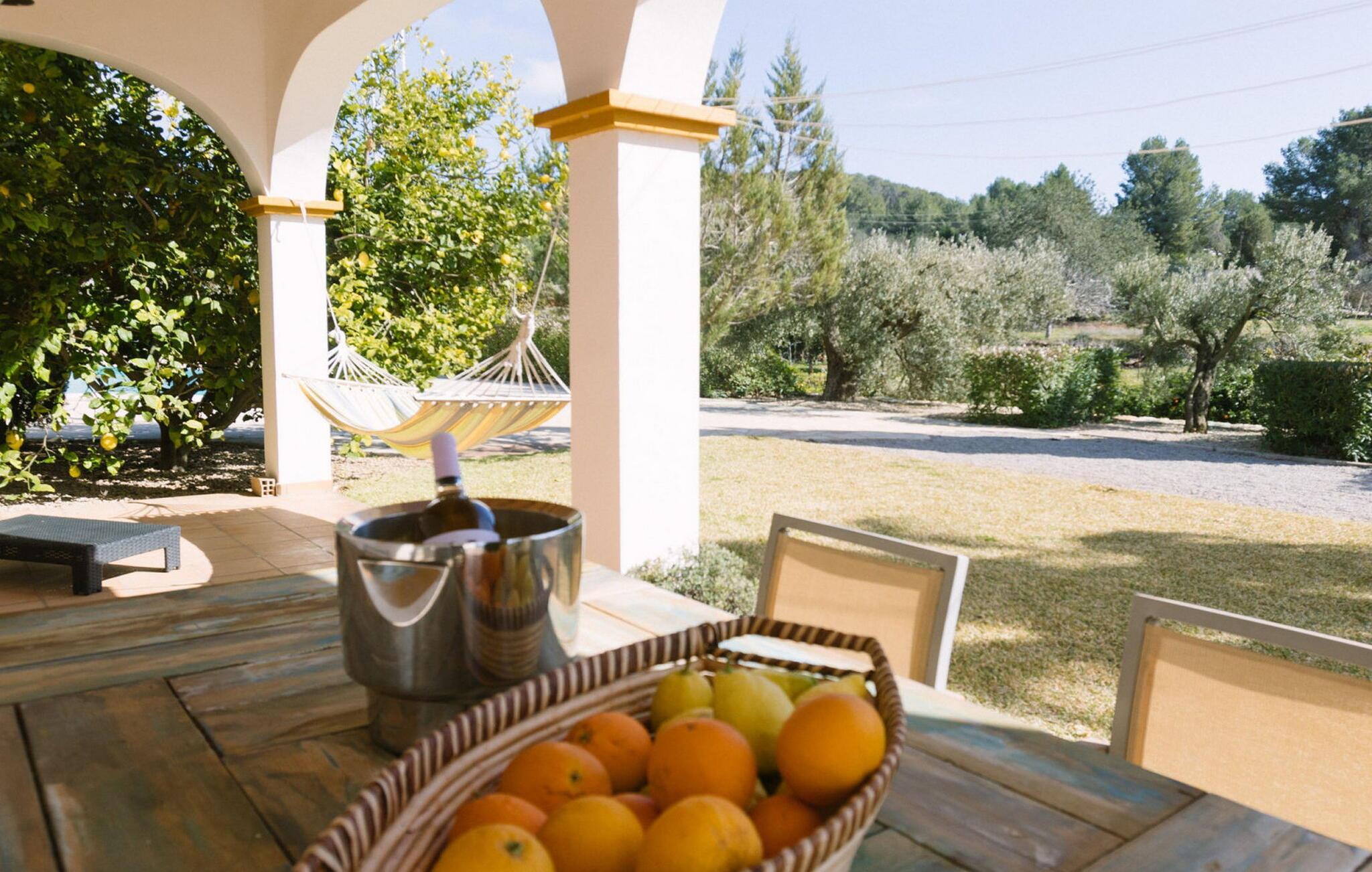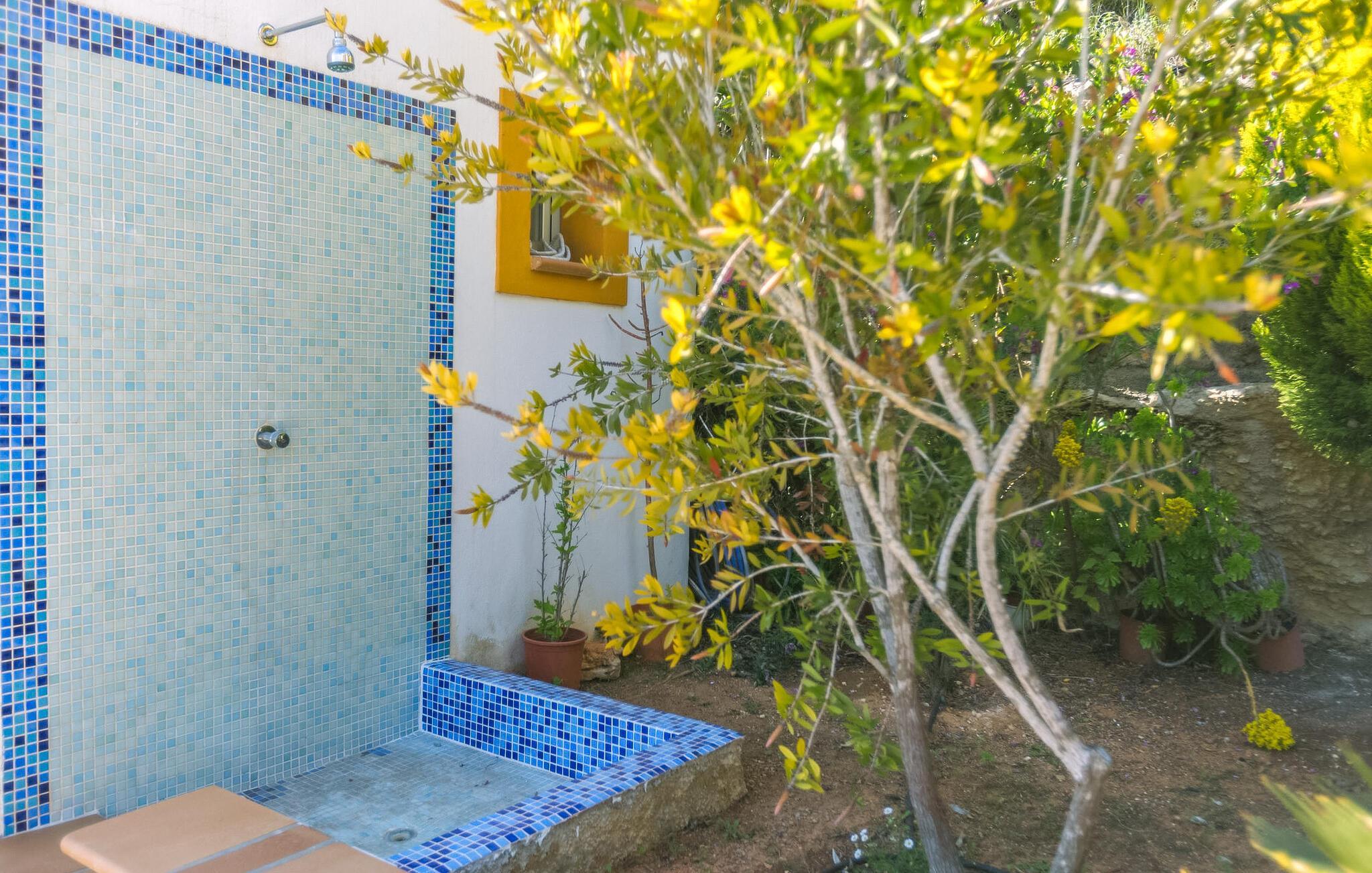 Die Außenbereiche der Villa sind perfekt, um das sonnige Wetter Ibizas zu genießen. Der private Pool ist von einer Terrasse mit einer überdachten Außenküche mit Grill und Kühlschrank umgeben. Ein schattiger Essbereich bietet einen perfekten Ort für Mahlzeiten im Freien, während ein Badezimmer im Freien mit Dusche und WC für zusätzlichen Komfort sorgt.