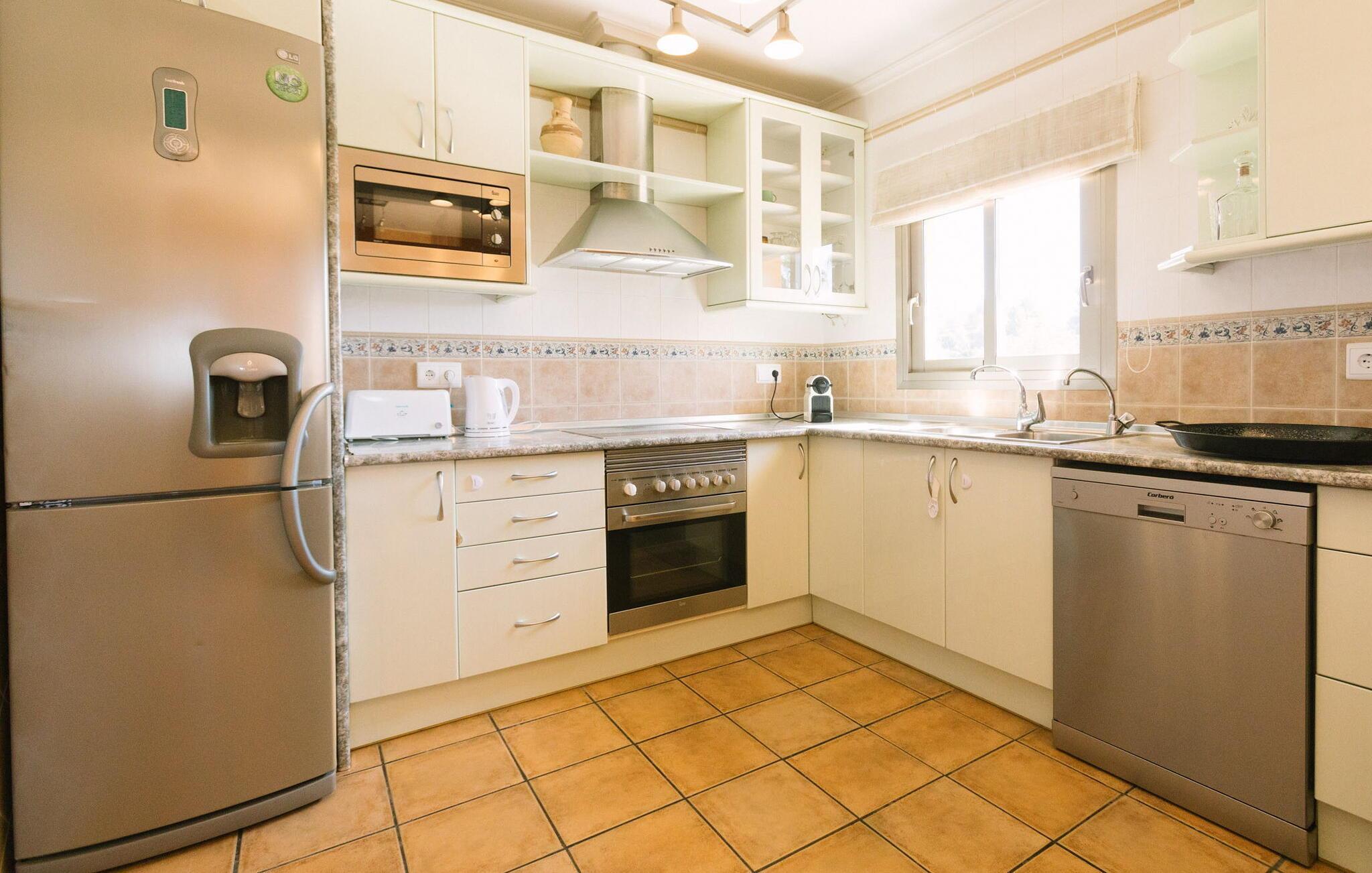 Im Erdgeschoss befindet sich eine offene amerikanische Küche, die komplett mit einem Geschirrspüler, einem Kühlschrank, einem Cerankochfeld, einem Backofen, einer Mikrowelle, einer Nespresso-Kaffeemaschine und einem Toaster ausgestattet ist. Das Wohnzimmer bietet Platz zum Entspannen und die große Terrasse bietet Blick auf die schöne Landschaft. Das Hauptschlafzimmer verfügt über ein eigenes Bad mit Dusche, während sich zwei weitere Doppelzimmer ein Badezimmer teilen und eines der Zimmer Zugang zur Terrasse hat.