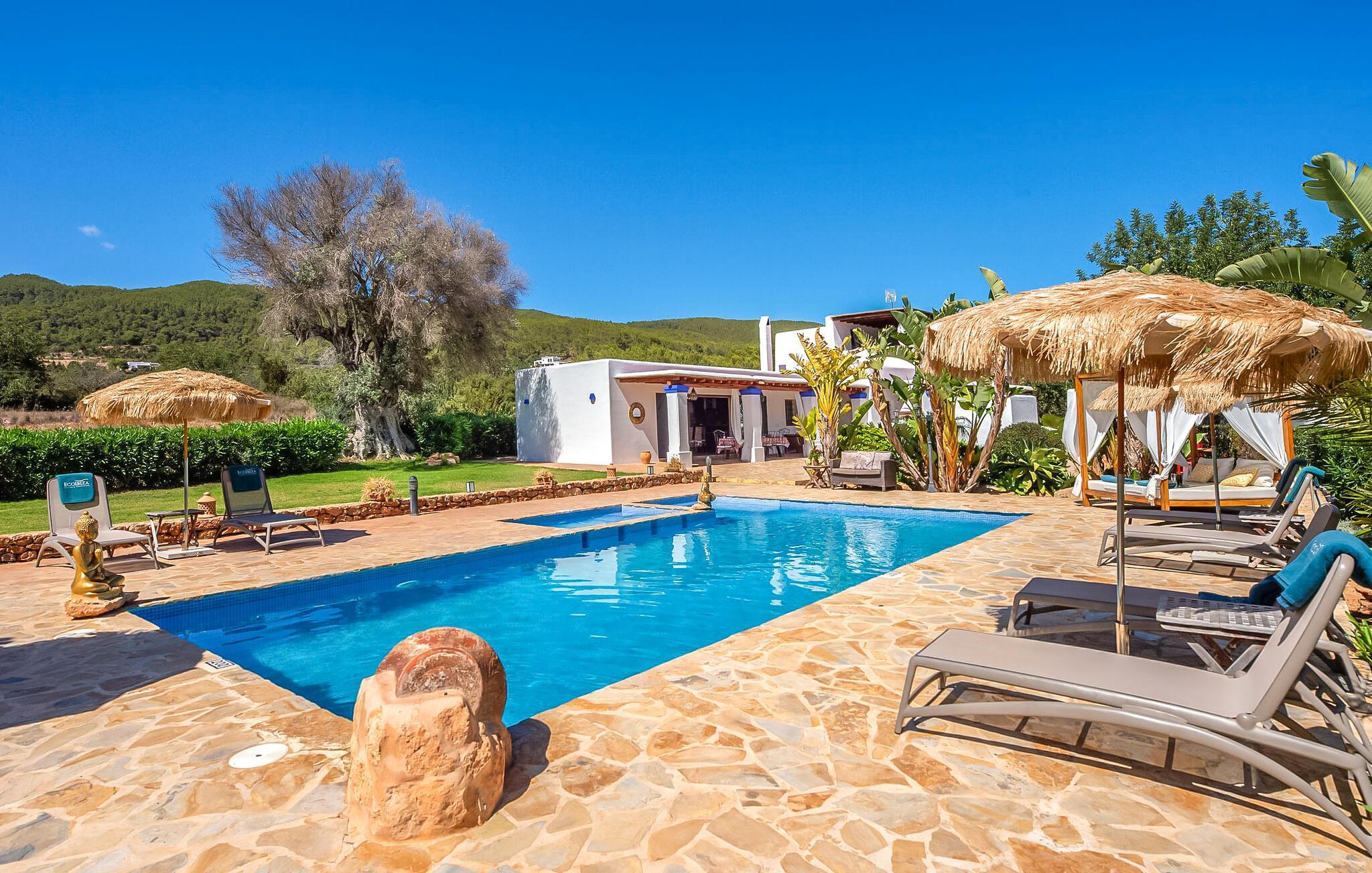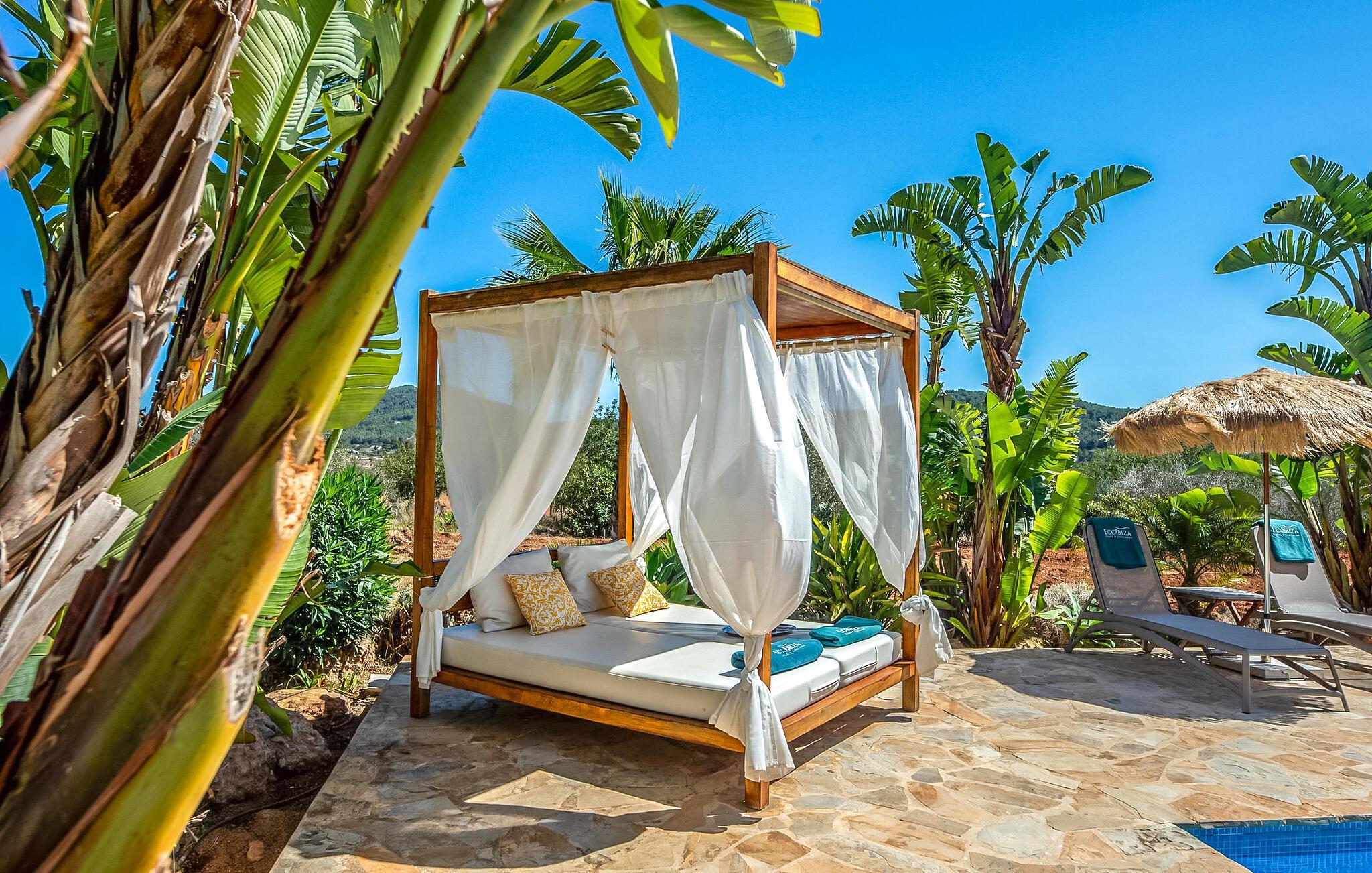 Die Außenoase verfügt über einen 10 x 5 m großen Salzwasserpool mit Whirlpool, ein Kinderbecken und ein balinesisches Bett. Diese Villa verbindet Ibizas natürliche Schönheit mit raffiniertem Komfort und schafft einen inspirierenden Rückzugsort, an dem Sie jeden Moment Ihres Urlaubs genießen können.