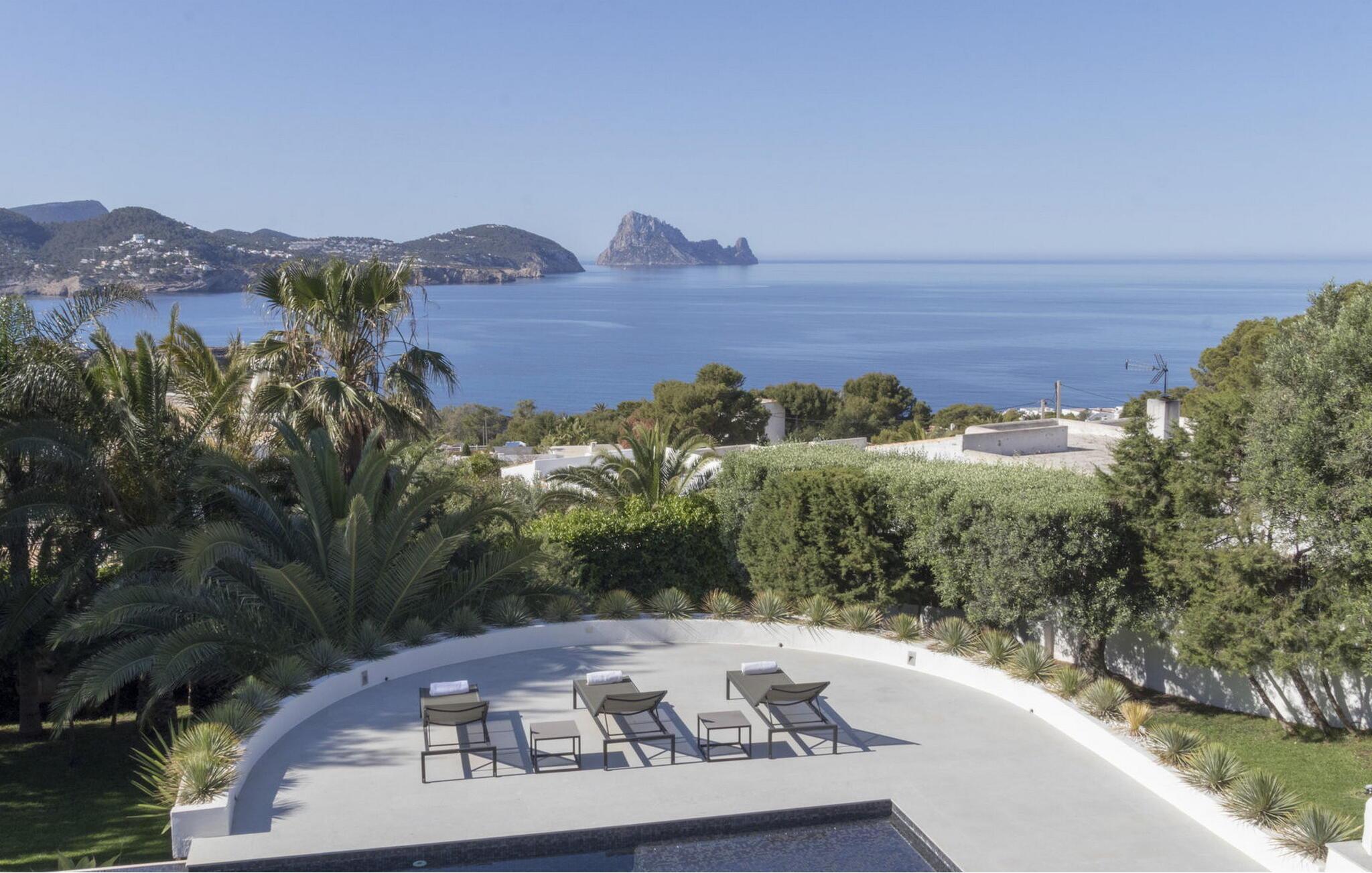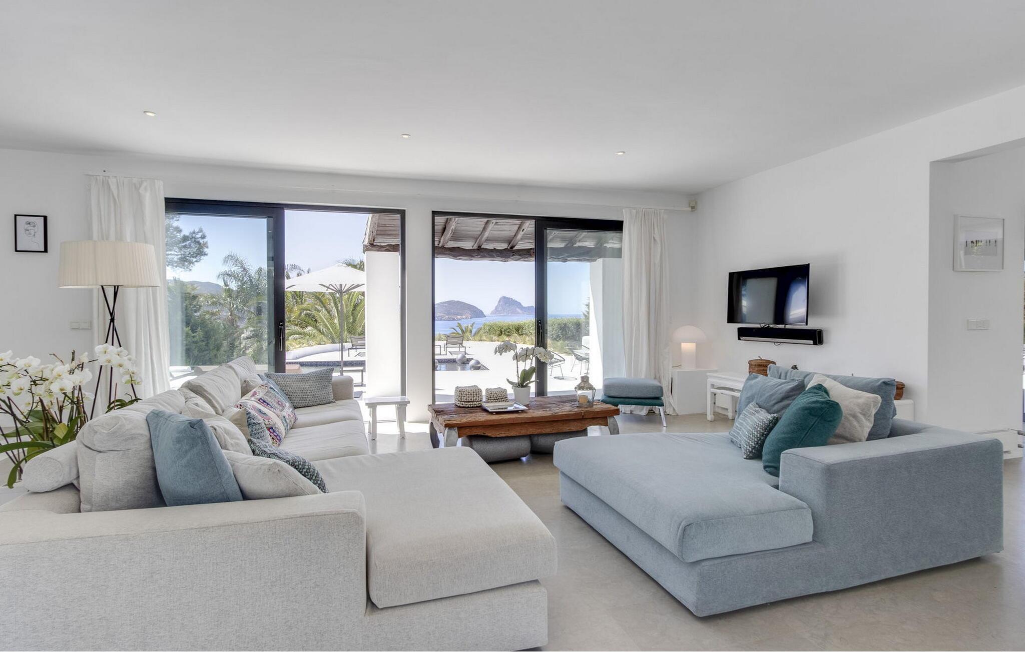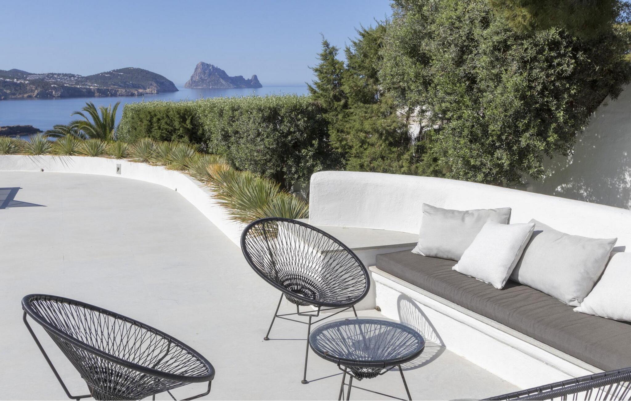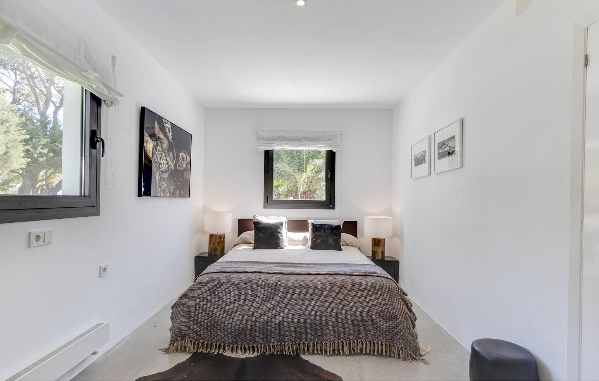 Das Hauptschlafzimmer ist geräumig und befindet sich im ersten Stock mit einem spektakulären Blick auf Es Vedrá. Es verfügt über eine Designer-Badewanne neben dem Bett, und das Badezimmer verfügt über eine Dusche und eine separate Toilette, während das Schlafzimmer mit einem Doppelbett im Erdgeschoss direkten Zugang zur Poolterrasse mit Blick auf das Meer und Es Vedrá hat. Es verfügt über ein eigenes Bad mit Dusche. Das Schlafzimmer mit einem Doppelbett im Erdgeschoss, neben Schlafzimmer 2, hat Blick auf den Garten und Zugang zur Terrasse. Es verfügt über ein eigenes Bad mit Dusche. Es gibt ein Doppelzimmer in der Nähe der Küche und des Flurs, mit eigenem Bad und 2 Schlafzimmer im Nebengebäude mit Doppelbetten. Sie teilen sich ein Badezimmer. Die voll ausgestattete Küche verfügt über eine Nespresso-Kaffeemaschine und die Villa verfügt über 2 Essbereiche im Freien auf der Veranda und im Garten, einen 50-Zoll-Fernseher, Apple TV, ein Sonos-Soundsystem, 100 MB Glasfaser-Internet, WLAN und eine Klimaanlage in den Schlafzimmern (kalt und warm). Zur Ausstattung gehören ein Sicherheitssystem, eine Waschmaschine, ein Trockner und ein Bügelbrett. Das Schwimmbad verfügt über ein Salzchlorierungssystem, der große Garten verfügt über eine Rasenfläche, die ideal für Kinder ist, einen Grill und einen Parkplatz für mehrere Autos.