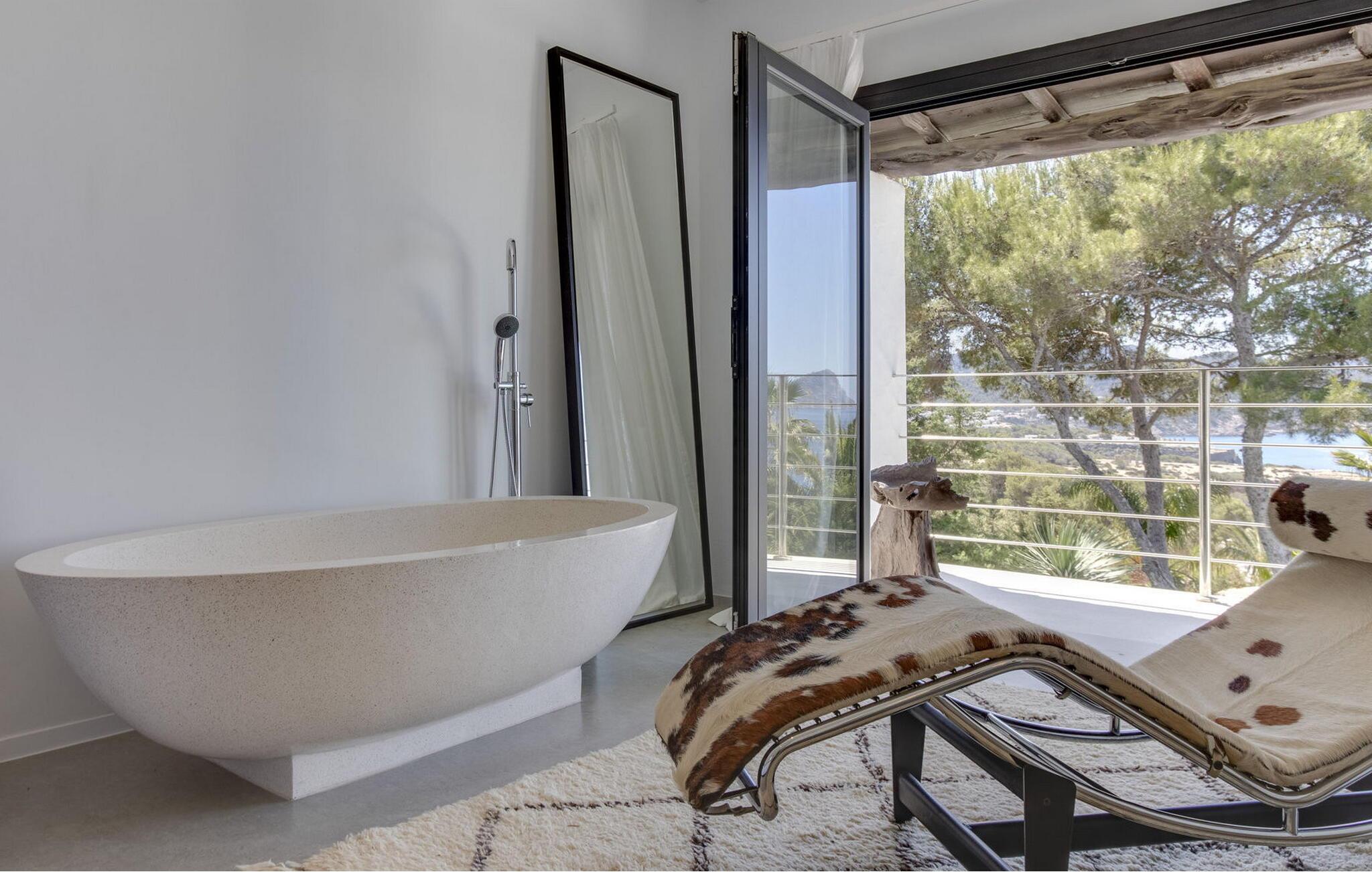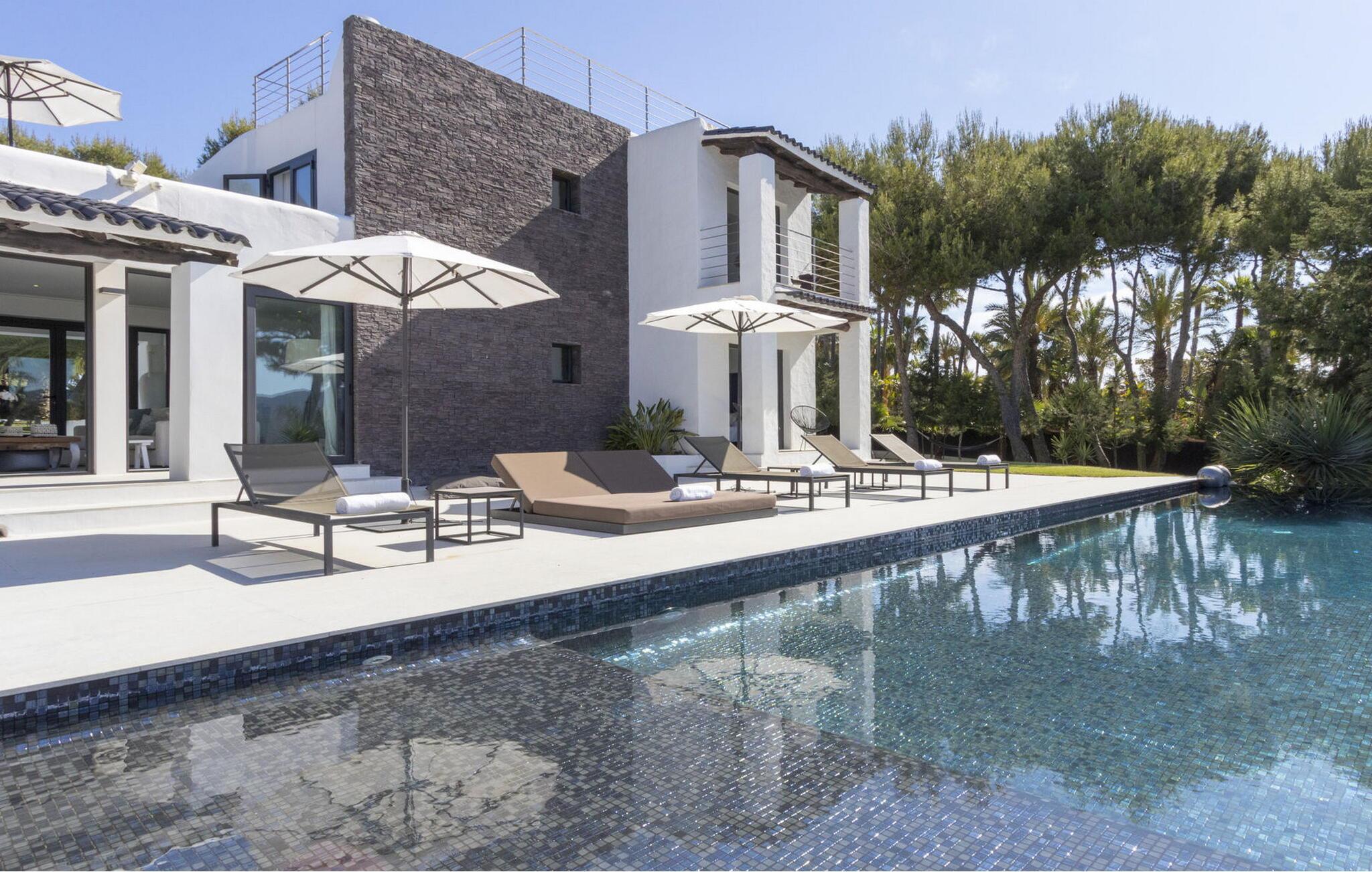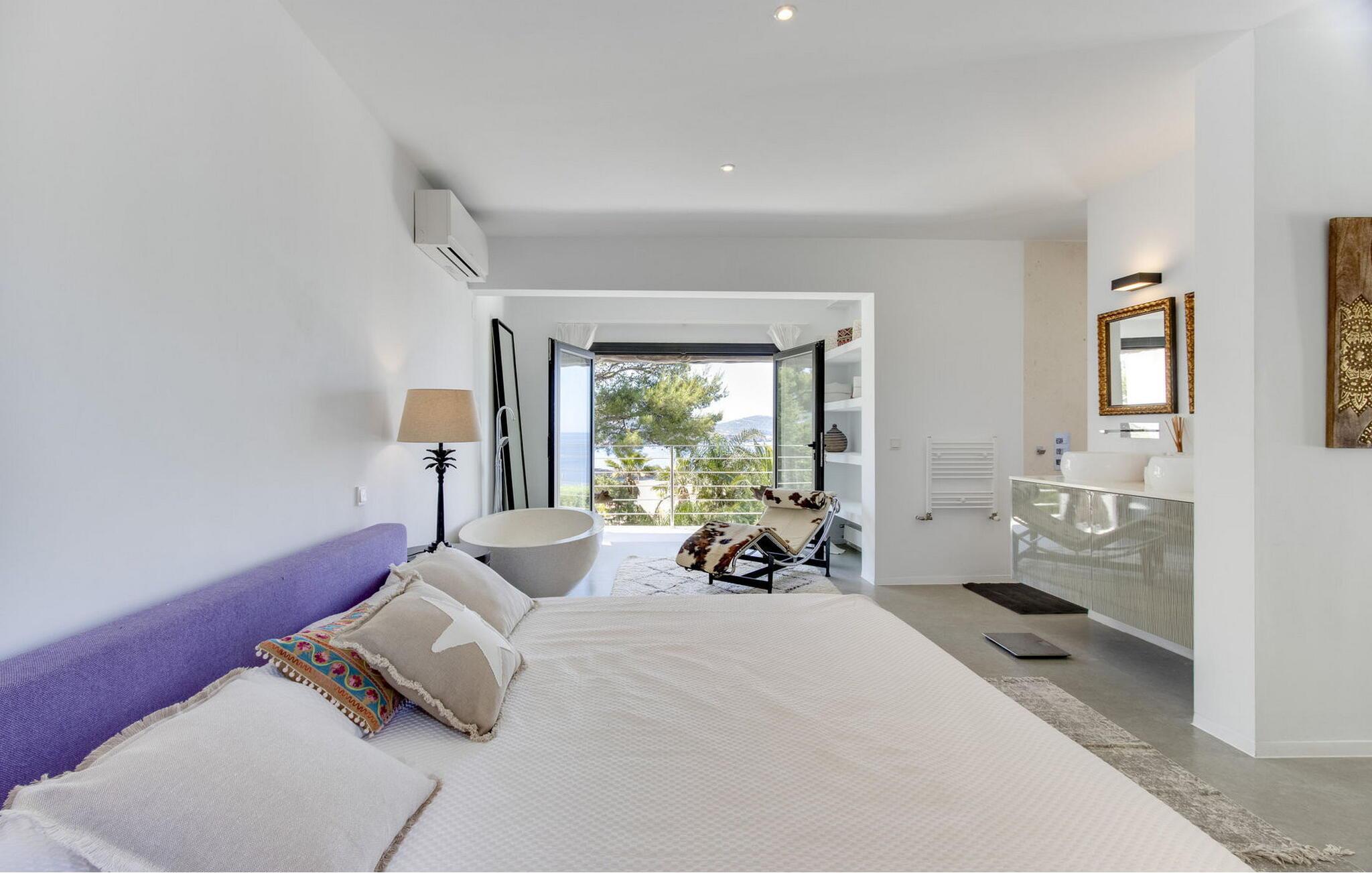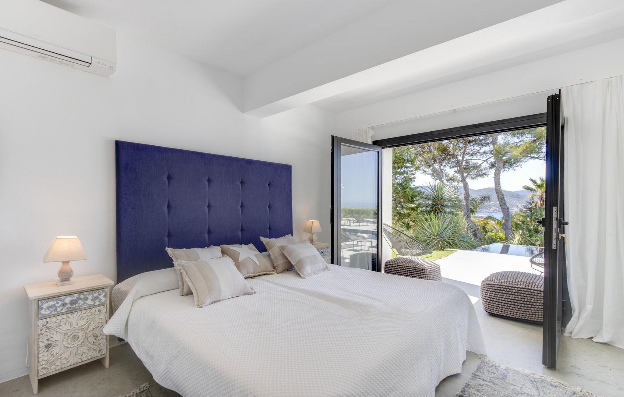 Das Hauptschlafzimmer ist geräumig und befindet sich im ersten Stock mit einem spektakulären Blick auf Es Vedrá. Es verfügt über eine Designer-Badewanne neben dem Bett, und das Badezimmer verfügt über eine Dusche und eine separate Toilette, während das Schlafzimmer mit einem Doppelbett im Erdgeschoss direkten Zugang zur Poolterrasse mit Blick auf das Meer und Es Vedrá hat. Es verfügt über ein eigenes Bad mit Dusche. Das Schlafzimmer mit einem Doppelbett im Erdgeschoss, neben Schlafzimmer 2, hat Blick auf den Garten und Zugang zur Terrasse. Es verfügt über ein eigenes Bad mit Dusche. Es gibt ein Doppelzimmer in der Nähe der Küche und des Flurs, mit eigenem Bad und 2 Schlafzimmer im Nebengebäude mit Doppelbetten. Sie teilen sich ein Badezimmer. Die voll ausgestattete Küche verfügt über eine Nespresso-Kaffeemaschine und die Villa verfügt über 2 Essbereiche im Freien auf der Veranda und im Garten, einen 50-Zoll-Fernseher, Apple TV, ein Sonos-Soundsystem, 100 MB Glasfaser-Internet, WLAN und eine Klimaanlage in den Schlafzimmern (kalt und warm). Zur Ausstattung gehören ein Sicherheitssystem, eine Waschmaschine, ein Trockner und ein Bügelbrett. Das Schwimmbad verfügt über ein Salzchlorierungssystem, der große Garten verfügt über eine Rasenfläche, die ideal für Kinder ist, einen Grill und einen Parkplatz für mehrere Autos.