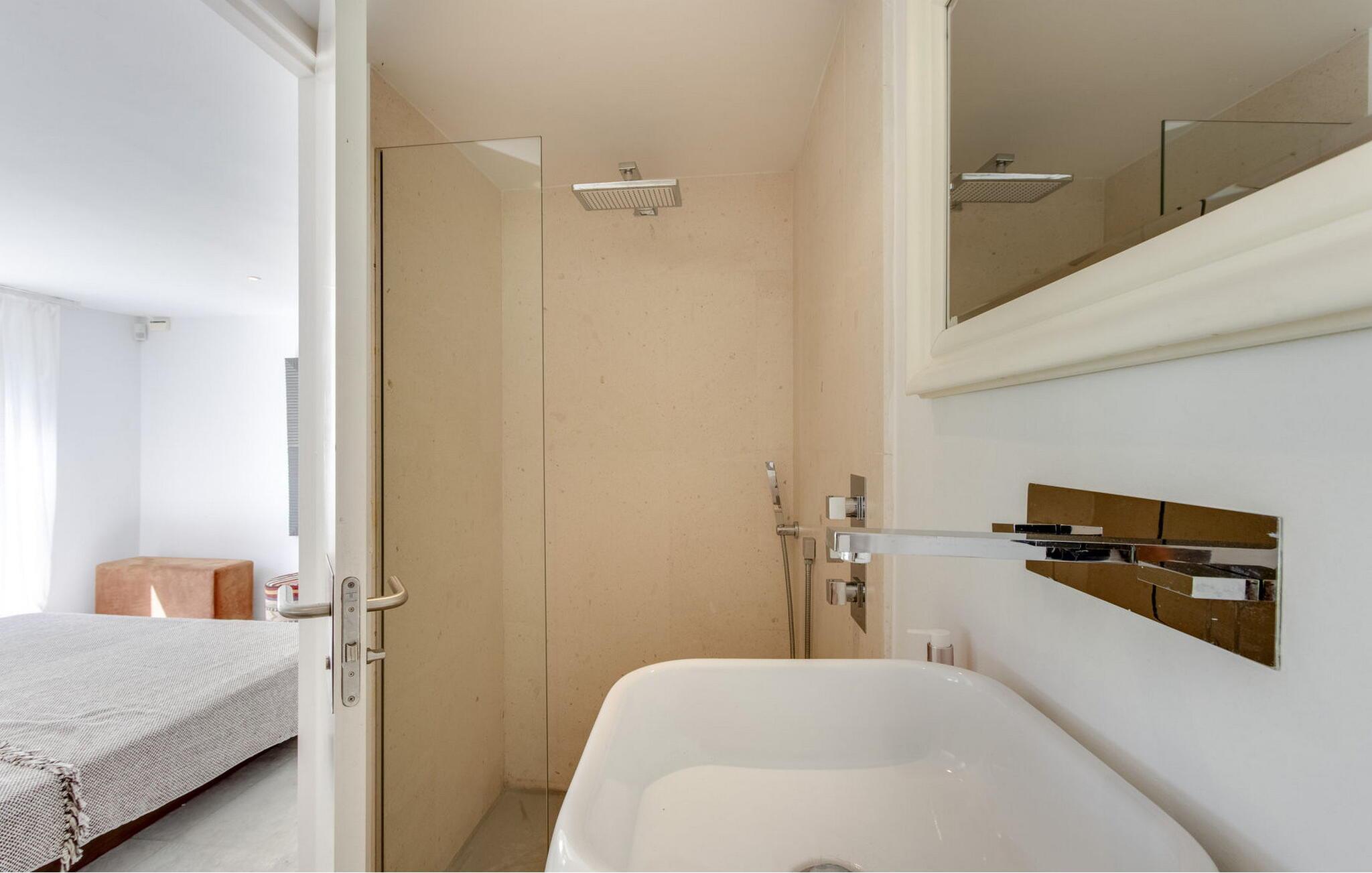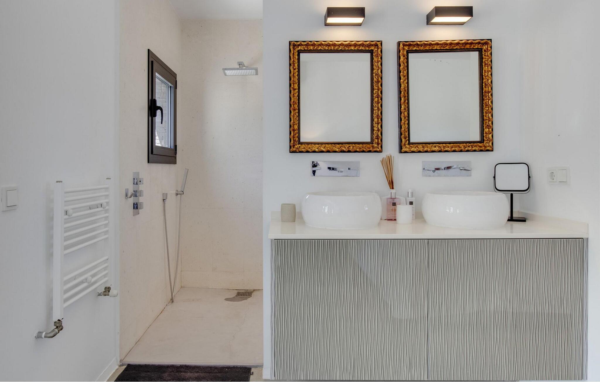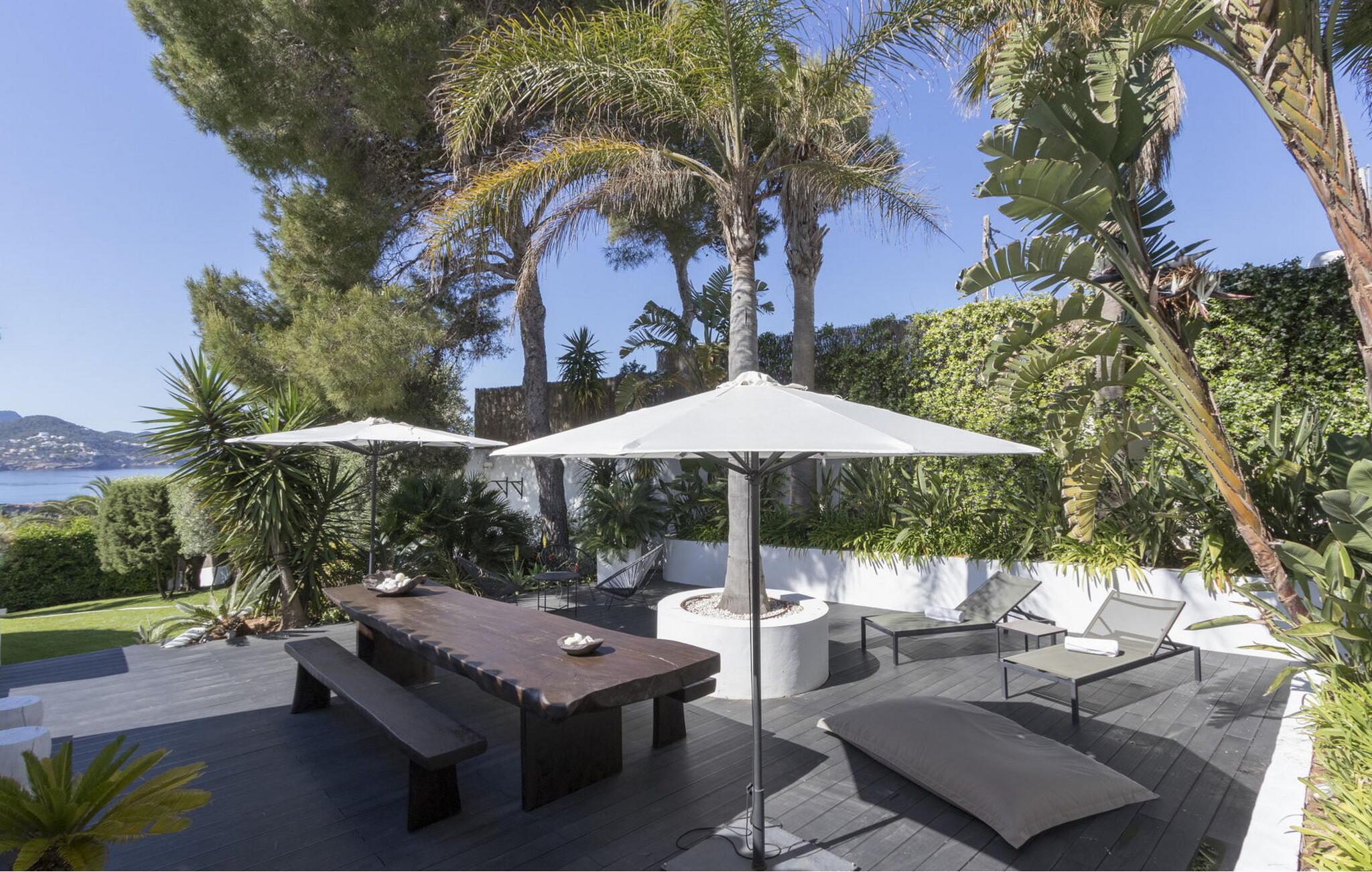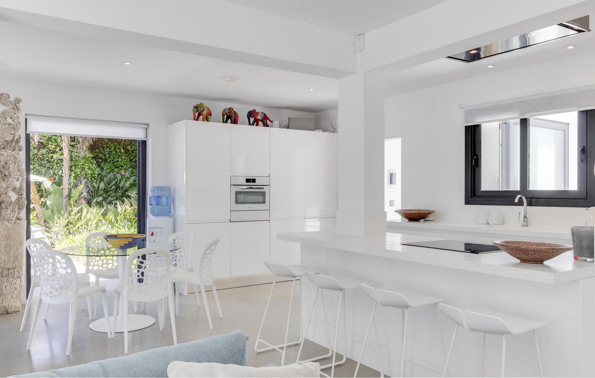 Das Hauptschlafzimmer ist geräumig und befindet sich im ersten Stock mit einem spektakulären Blick auf Es Vedrá. Es verfügt über eine Designer-Badewanne neben dem Bett, und das Badezimmer verfügt über eine Dusche und eine separate Toilette, während das Schlafzimmer mit einem Doppelbett im Erdgeschoss direkten Zugang zur Poolterrasse mit Blick auf das Meer und Es Vedrá hat. Es verfügt über ein eigenes Bad mit Dusche. Das Schlafzimmer mit einem Doppelbett im Erdgeschoss, neben Schlafzimmer 2, hat Blick auf den Garten und Zugang zur Terrasse. Es verfügt über ein eigenes Bad mit Dusche. Es gibt ein Doppelzimmer in der Nähe der Küche und des Flurs, mit eigenem Bad und 2 Schlafzimmer im Nebengebäude mit Doppelbetten. Sie teilen sich ein Badezimmer. Die voll ausgestattete Küche verfügt über eine Nespresso-Kaffeemaschine und die Villa verfügt über 2 Essbereiche im Freien auf der Veranda und im Garten, einen 50-Zoll-Fernseher, Apple TV, ein Sonos-Soundsystem, 100 MB Glasfaser-Internet, WLAN und eine Klimaanlage in den Schlafzimmern (kalt und warm). Zur Ausstattung gehören ein Sicherheitssystem, eine Waschmaschine, ein Trockner und ein Bügelbrett. Das Schwimmbad verfügt über ein Salzchlorierungssystem, der große Garten verfügt über eine Rasenfläche, die ideal für Kinder ist, einen Grill und einen Parkplatz für mehrere Autos.