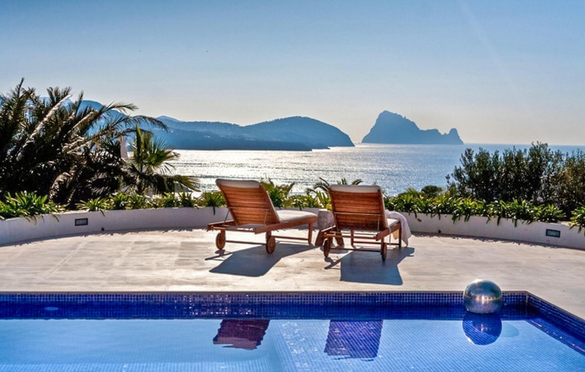 Diese unglaubliche 340 m2 große Villa befindet sich auf einem 3.300 m2 großen Grundstück, nur 250 m vom Meer entfernt und bietet einen spektakulären Blick auf das Meer und Es Vedrá. Es befindet sich in einer ruhigen Gegend ganz in der Nähe von Cala Codolar und den Stränden von Cala Comte, die nur einen kurzen Spaziergang vom Haus entfernt sind.