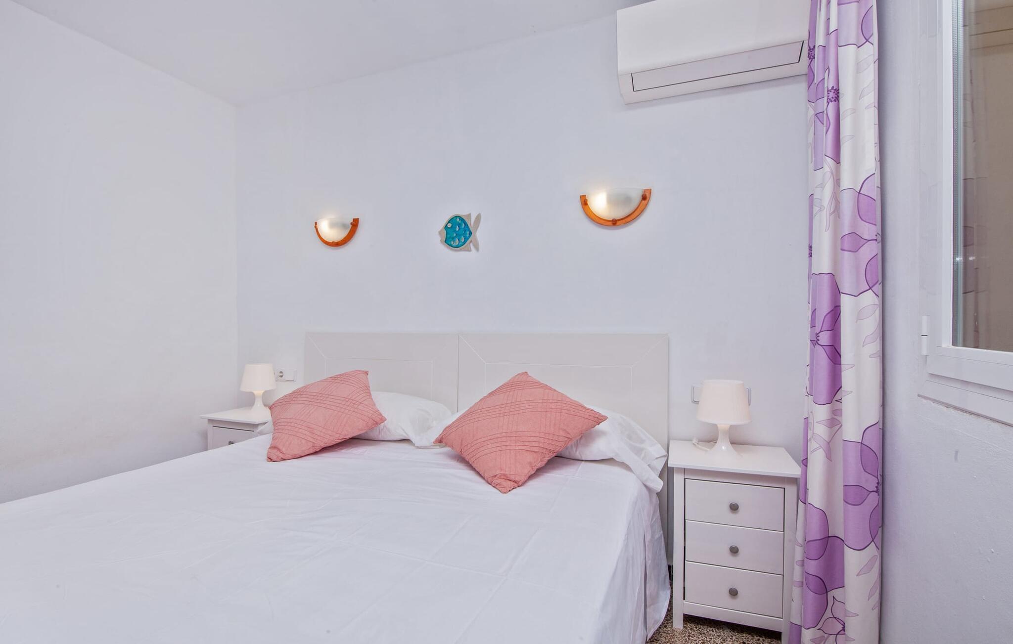 Die Villa verfügt über vier Schlafzimmer und ist für bis zu acht Personen und zwei Babys geeignet. Im Erdgeschoss befinden sich ein großes Wohn- und Esszimmer, die offene Küche, zwei Schlafzimmer mit je zwei Einzelbetten, ein Schlafzimmer mit einem Doppelbett und zwei Badezimmer. Ein weiteres Doppelzimmer mit Einzelbetten und ein Badezimmer befinden sich im Obergeschoss. Von hier aus haben Sie auch Zugang zu einer großzügigen Dachterrasse, die sich perfekt zum Sonnenbaden eignet. Alle Zimmer sind hell gestrichen und funktional eingerichtet. Im Wohnzimmer können Sie auf zwei gemütlichen Sofas entspannen oder in einem der bequemen Schaukelsessel entspannen und Ihr Urlaubsbuch lesen. Ein großer Flachbildfernseher an der Wand sorgt dafür, dass entspannten Filmabenden nichts im Wege steht. In der kühleren Jahreszeit können Sie es sich mithilfe des Kamins gemütlich und warm machen. Die Küche ist komplett ausgestattet mit Kühl-Gefrierkombination, Herd, Backofen, Mikrowelle, Geschirrspüler, Kaffeemaschine und Toaster und bietet zudem viel Stauraum. Die Badezimmer sind funktional und modern. Sie müssen keinen Haartrockner mitbringen, da Ihnen zwei zur Verfügung stehen.