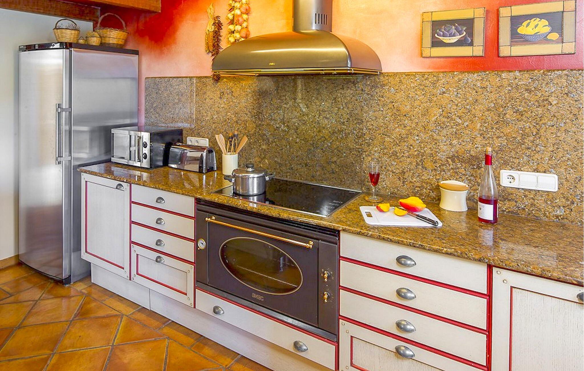 Das Haupthaus hat zwei Etagen. Das Hauptgebäude verfügt über eine voll ausgestattete Küche, die zum Wohnzimmer hin offen ist, mit Sat-TV und WLAN. Ein Flur führt zu drei Schlafzimmern, einem Hauptschlafzimmer mit eigenem Bad und TV und zwei Doppelzimmern mit jeweils zwei Betten und einem gemeinsamen Badezimmer mit Badewanne. Eine Treppe verbindet uns mit dem vierten Schlafzimmer, in diesem Fall zwei Einzelbetten mit Bad mit Außendusche und Balkon in der obersten Etage.