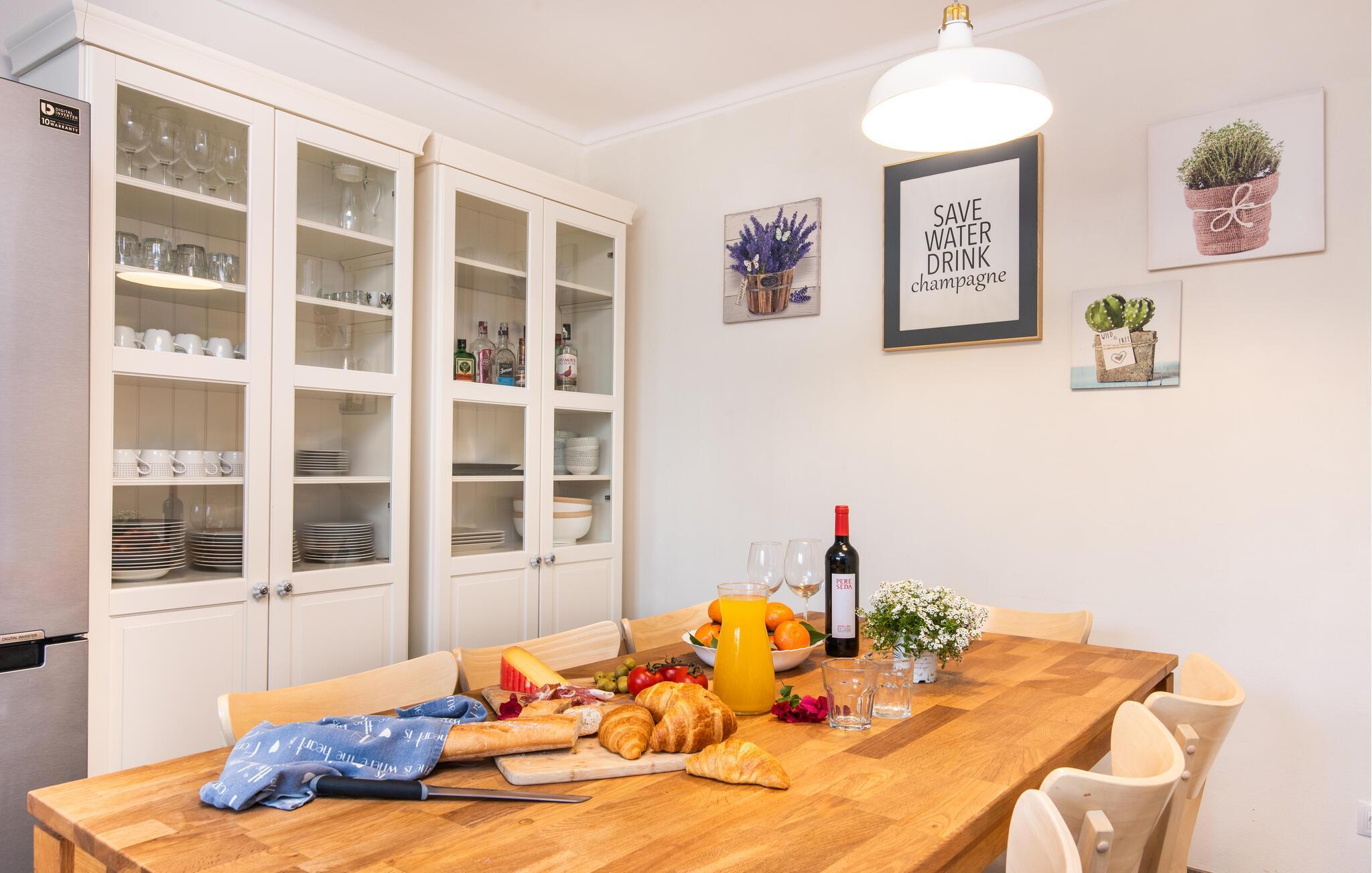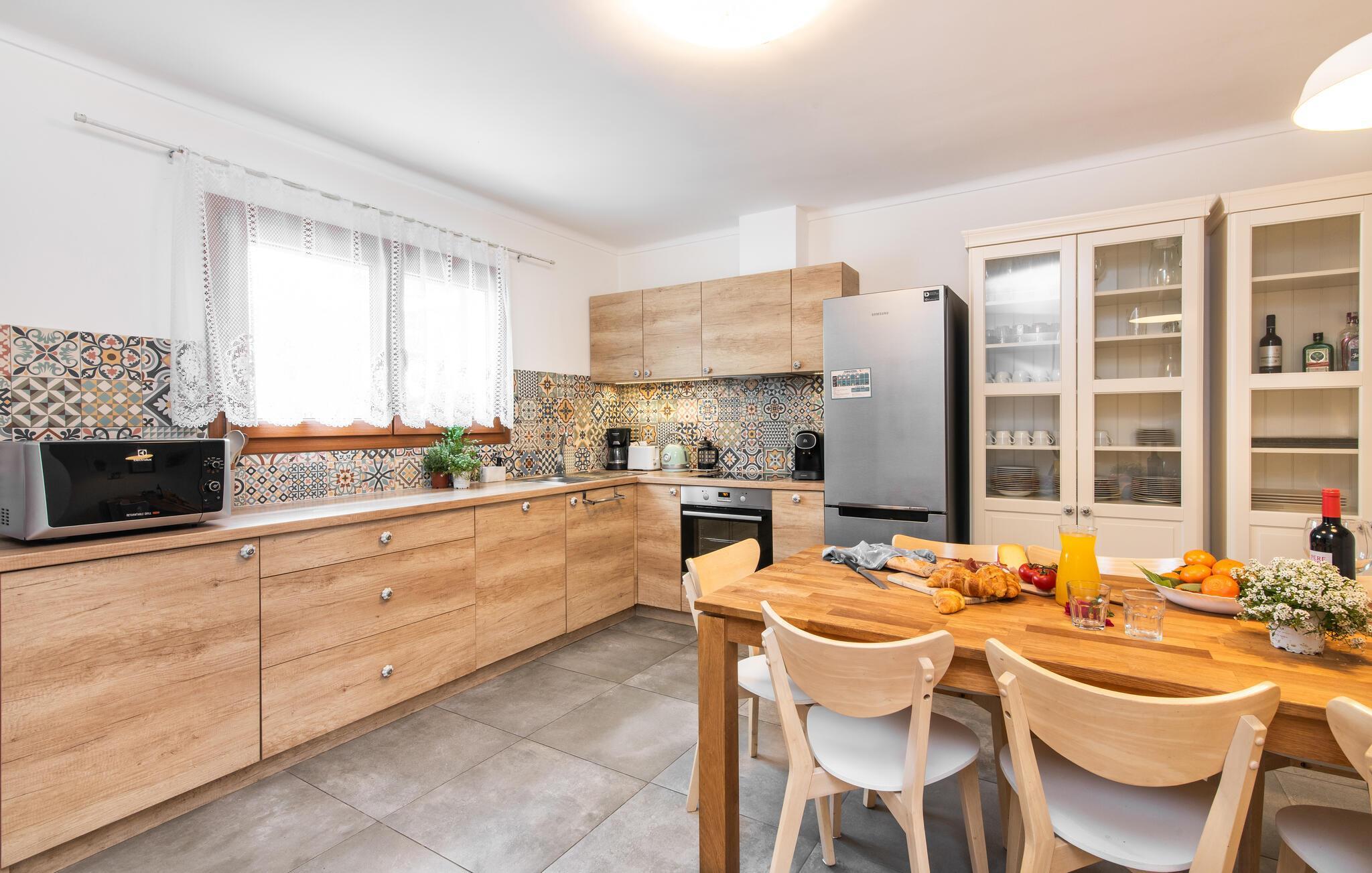 Erleben Sie entspannte Ferientage in diesem charmanten und geräumigen Ferienhaus. Das Haus vereint mallorquinisches Ambiente mit modernem Komfort und bietet alles, was Sie für einen erholsamen Aufenthalt benötigen. Der Wohnbereich mit offenem Holzdach und großen Fenstern ist hell und freundlich gestaltet. Nehmen Sie auf dem bequemen Sofa Platz, genießen Sie den Blick in den Garten oder entspannen Sie bei einem Film. Die geschmackvoll eingerichtete Küche mit Holzmöbeln, farbenfrohen Fliesen und einem großen Esstisch lädt dazu ein, gemeinsam zu kochen und lange Mahlzeiten zu genießen. In einem separaten Bereich steht Ihnen zudem eine kleine zweite Küchenzeile mit Sitzgelegenheit zur Verfügung – ideal für Familien oder Freunde, die etwas mehr Platz wünschen.