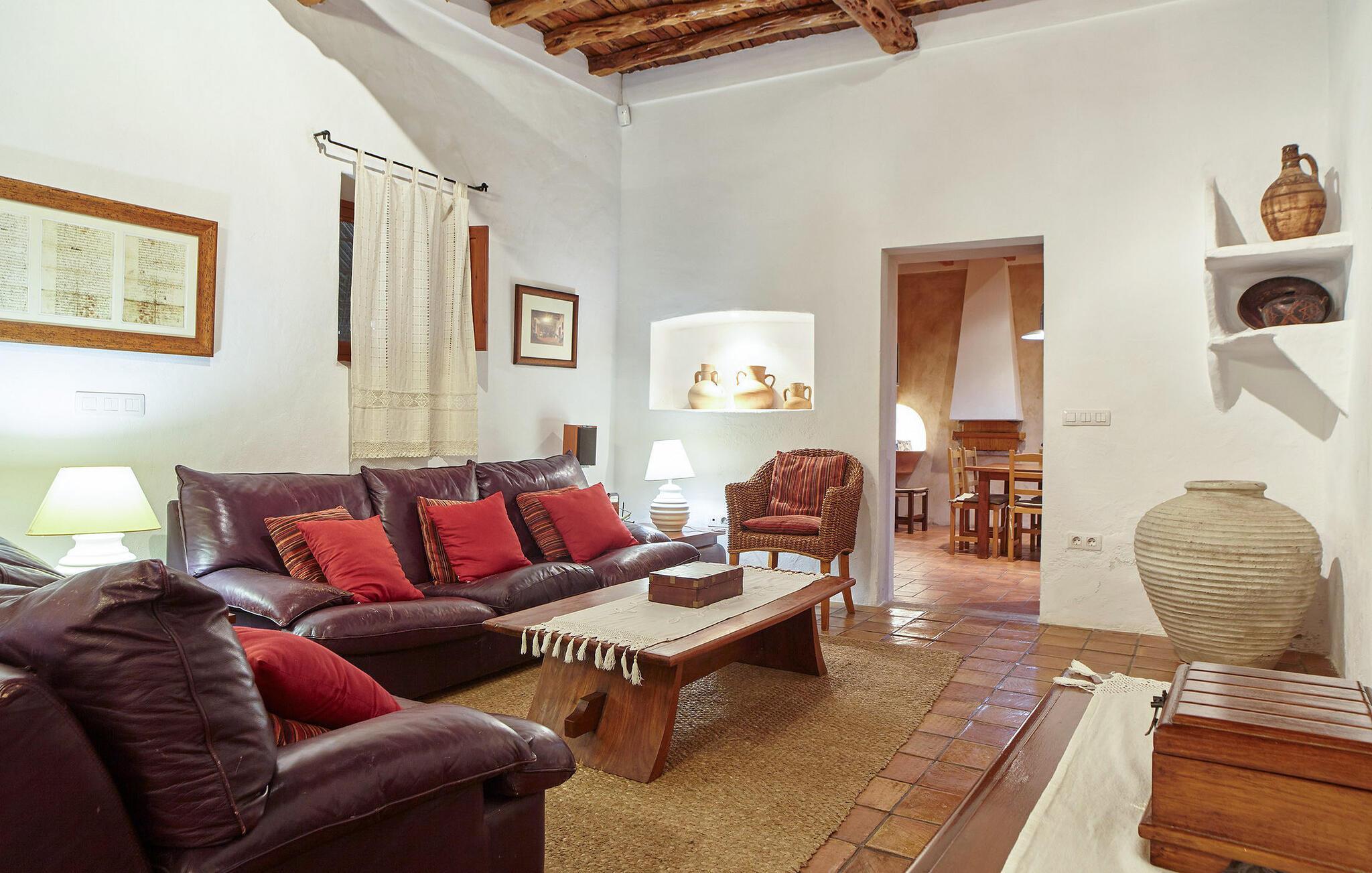 Es handelt sich um ein typisch ibizenkisches Anwesen aus dem Jahr 1790, das mit allen Errungenschaften des 21. Jahrhunderts renoviert wurde, aber seinen rustikalen ibizenkischen Geist bewahrt hat. Die Villa verfügt über ein privates Grundstück von 20.000 m2, davon 800 m2 mit 6 Doppelzimmern und 5 Bädern. Es bietet einen großen Garten mit Außenpool, Meerblick und eine Terrasse mit Grill und zwei langen Esstischen für 12 Personen (einer draußen und einer innen). Die Villa verfügt über einen großen Wohnbereich mit Sofas, Kamin, 40-Zoll-Smart-TV und Heimkino mit Surround-Sound im Wohnzimmer und einen Kamin im Esszimmer. Die Küche verfügt über ein Cerankochfeld, eine Mikrowelle, eine Saftpresse, eine Espressomaschine , einen Geschirrspüler, eine Waschmaschine und einen Trockner.