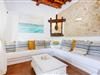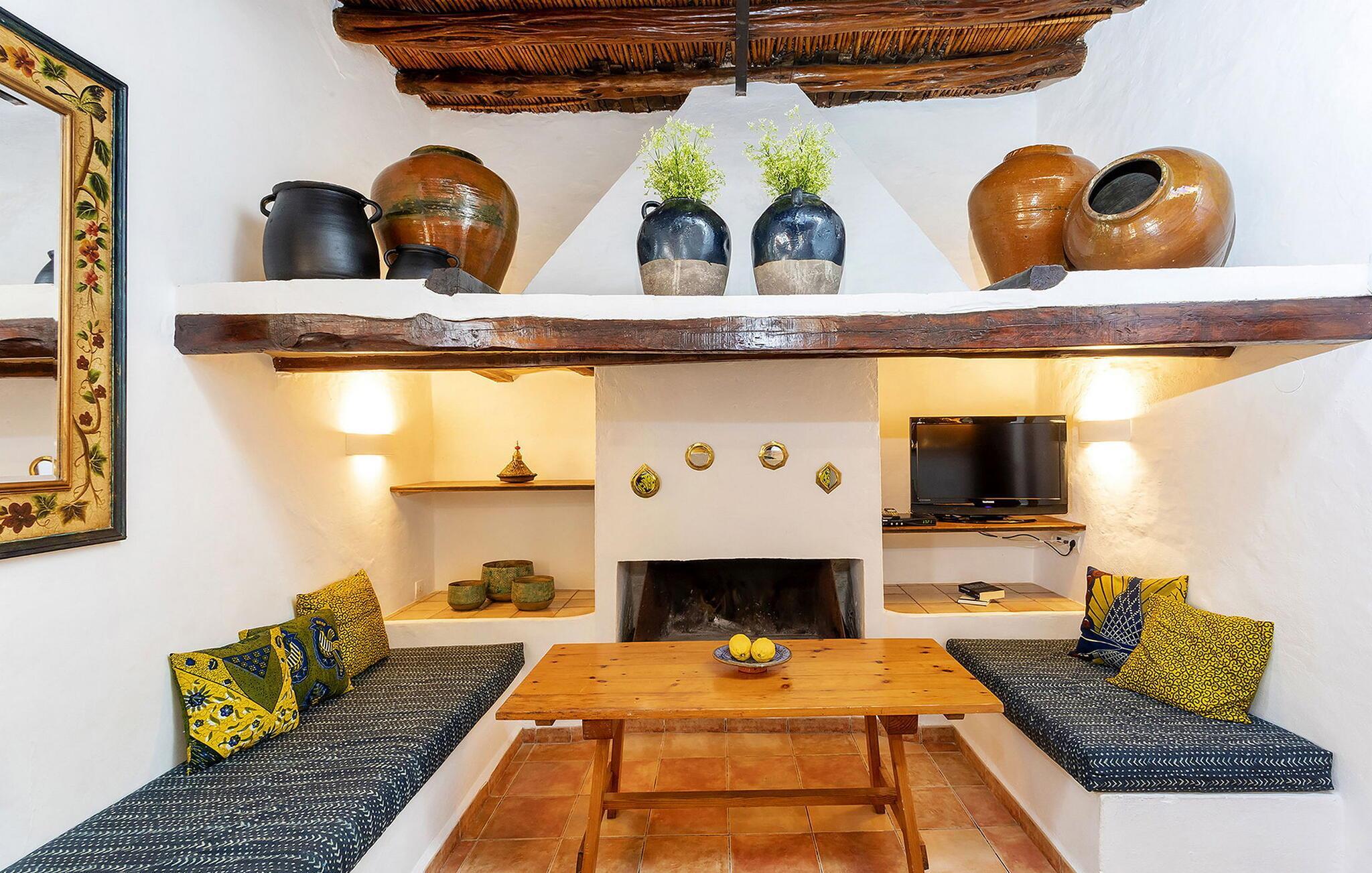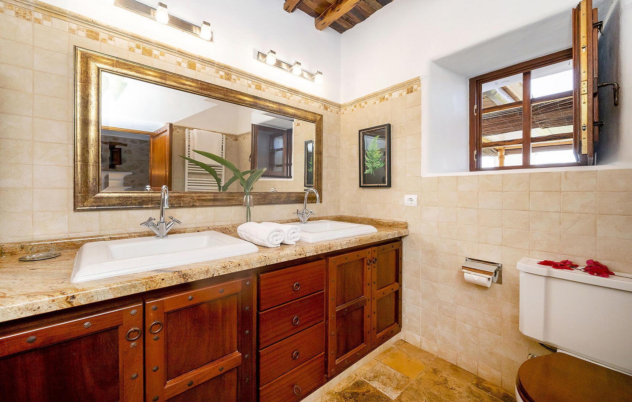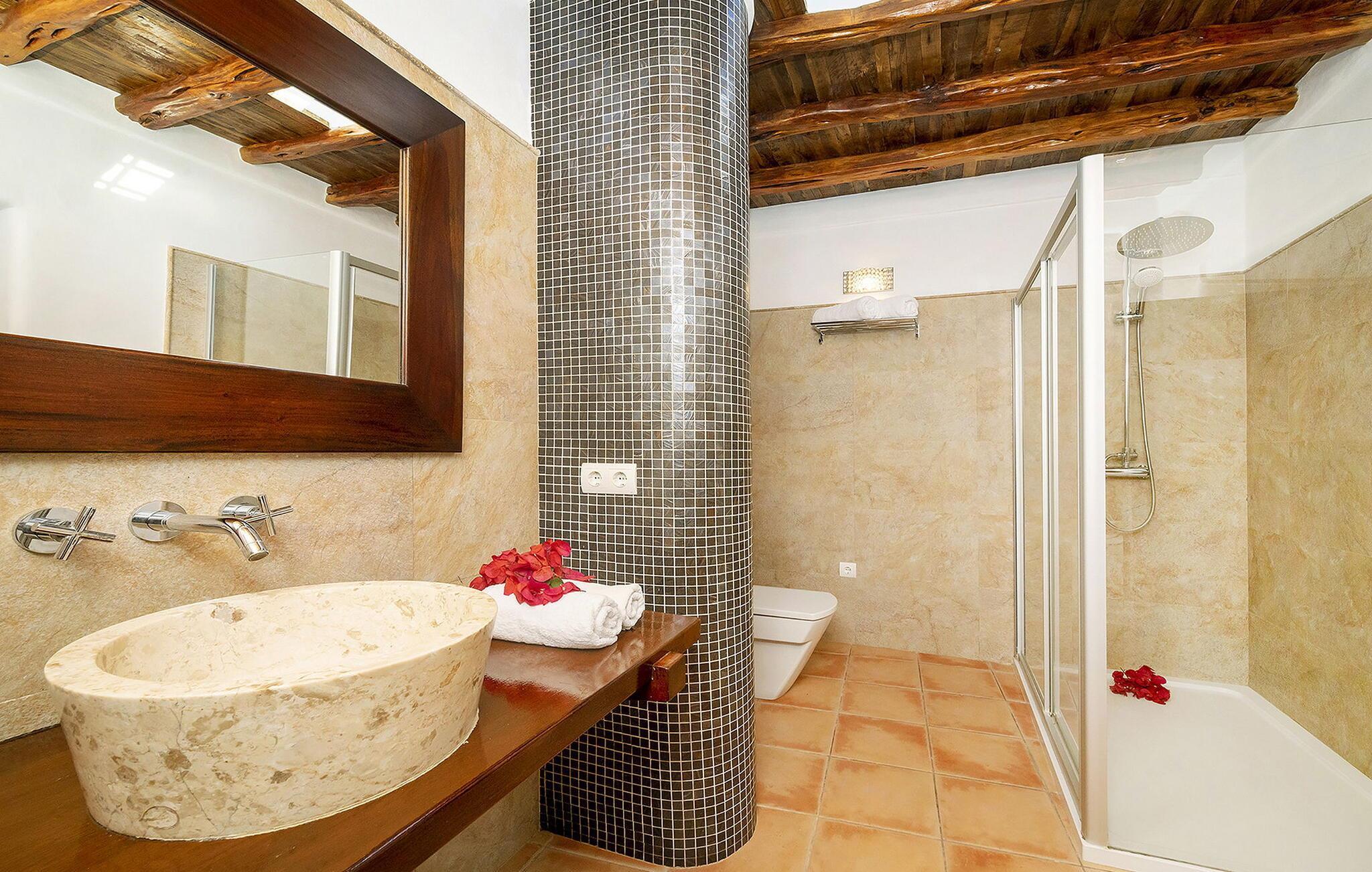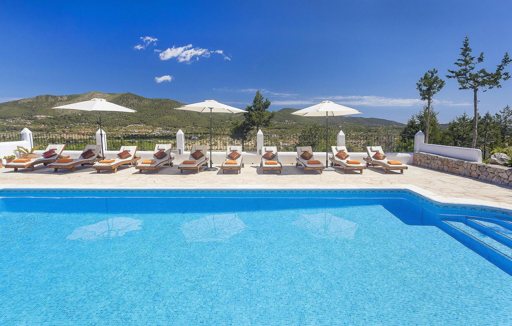 Das Anwesen ist alt, aber wirklich mit allen Annehmlichkeiten ausgestattet. Das Haus ist in Familienbesitz und man merkt, dass der Besitzer das Haus liebt. Jedes Jahr wird das Haus renoviert und verbessert. Diese Familie besitzt auch Sitges und Morna Valley, die in der Nähe liegen. Aber das Haus bleibt traditionell und ibizenkisch, ohne Kompromisse beim Komfort einzugehen. Atzaro ist um die Ecke und Strände wie Aguas Blancas und Es Figueral sind eine 15-minütige Fahrt entfernt. Um das Haus zu erreichen, müssen Sie ein schmales Stück Straße hinauffahren (große Vans sind nicht ratsam, obwohl dies möglich ist, wenn Sie gut fahren können). Oben angekommen, betreten Sie das Gebäude durch ein elektrisches Tor. Sie werden sofort von der atemberaubenden Aussicht begrüßt. Es gibt einen Swimmingpool mit Holzliegestühlen mit Kissen, es gibt eine Außenküche (die größer ist als die Küche im Inneren!) und einen Esstisch mit Schatten. Und natürlich ein großer Swimmingpool und ein Grill. Das Innere des Hauses ist ordnungsgemäß fertiggestellt. Jedes der 6 Schlafzimmer verfügt über ein eigenes Bad und einige verfügen über Himmelbetten. Außerdem gibt es in jedem Zimmer eine Klimaanlage. Darüber hinaus gibt es WLAN in der Küche (aufgrund der dicken Wände ist dies nicht überall zugänglich), es gibt eine Hausalarmanlage, zwei Kinderbetten und zwei Schließfächer.
