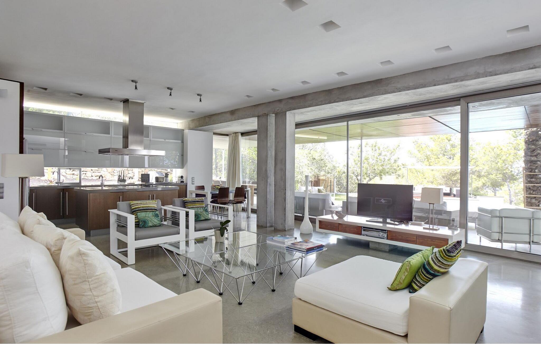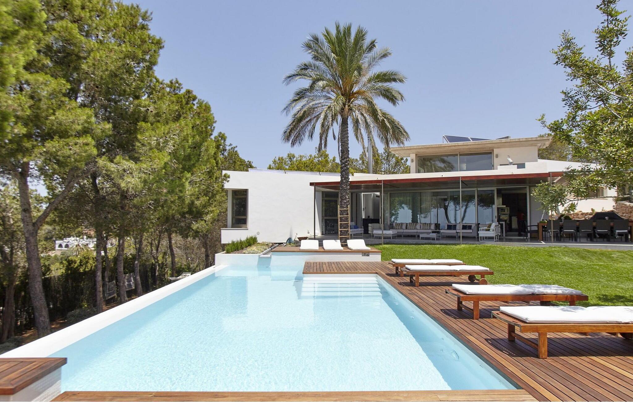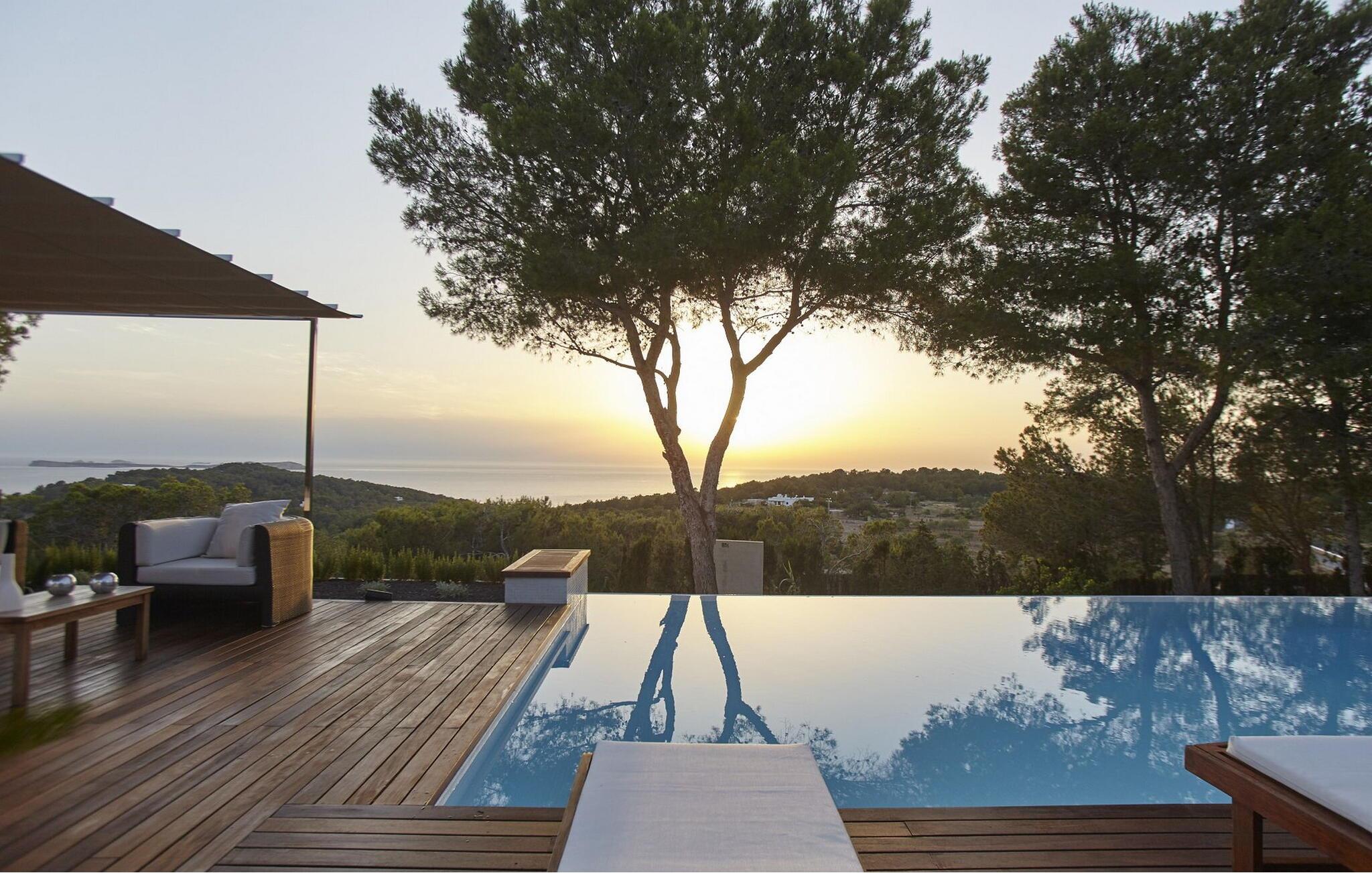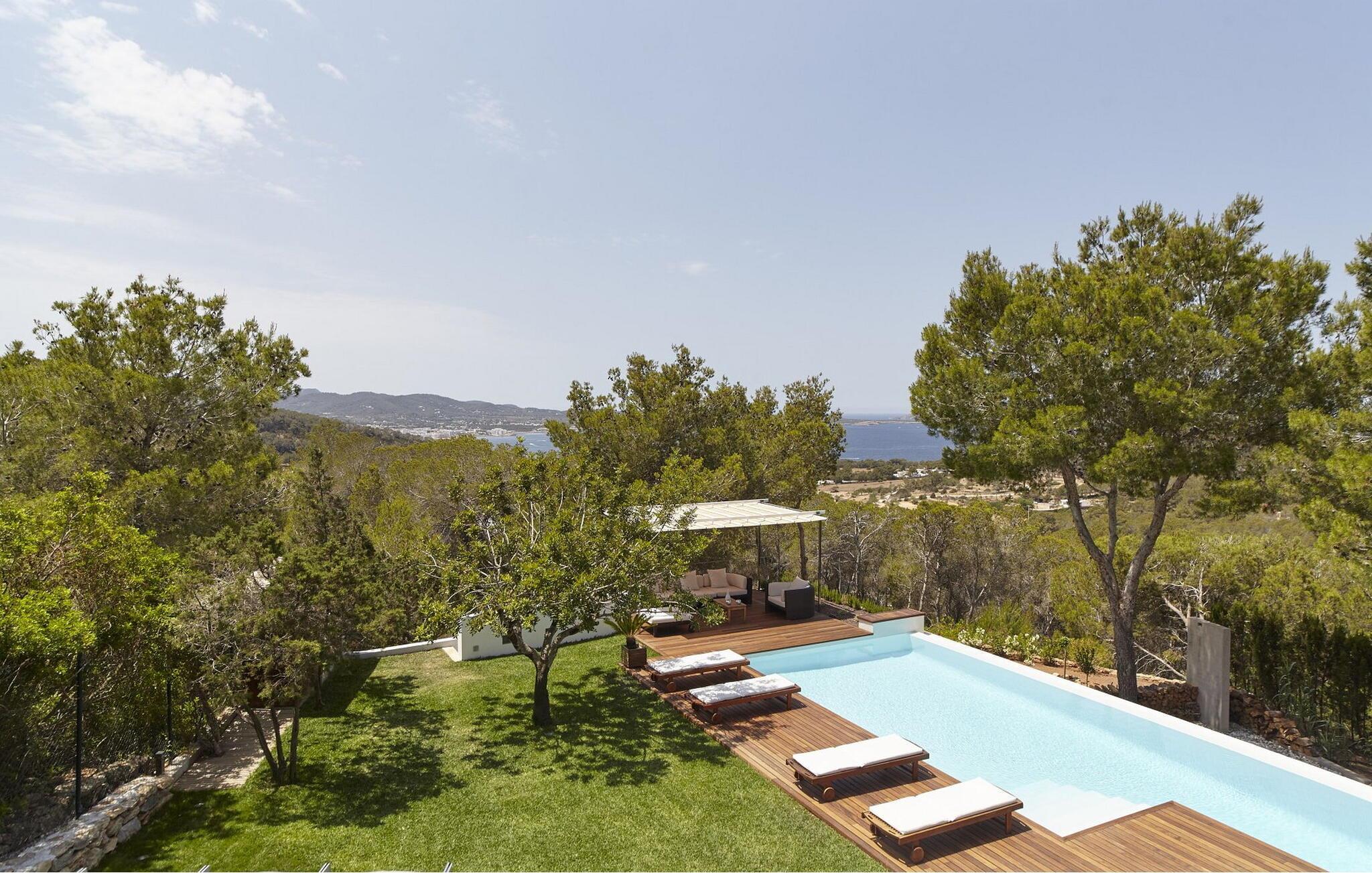 Minimalistische Villa mit 5 Schlafzimmern, nicht weit vom schönen Strand Cala Salada entfernt, auf einem Hügel, mit herrlichem Blick auf das Meer und den Sonnenuntergang vom Garten aus.