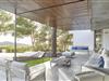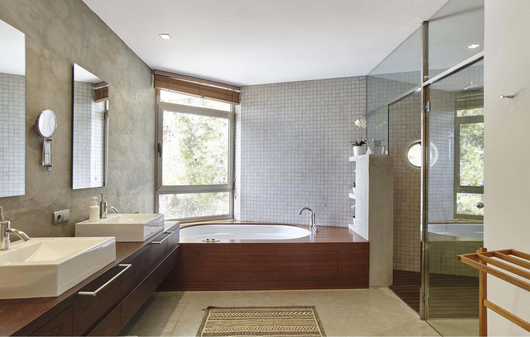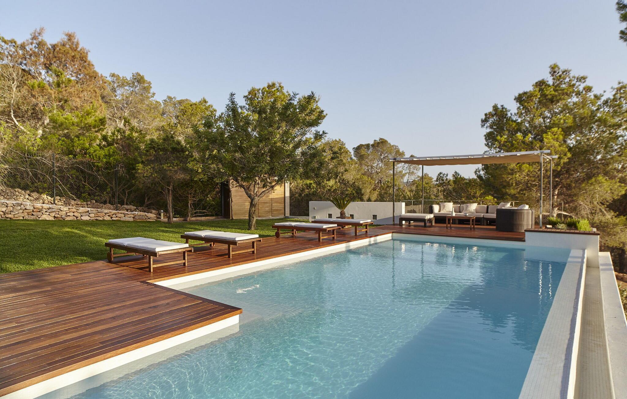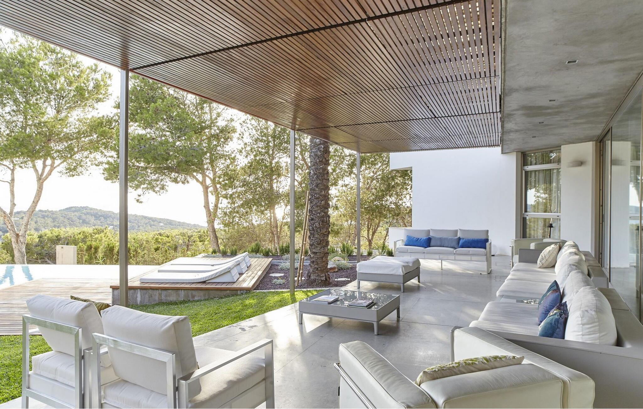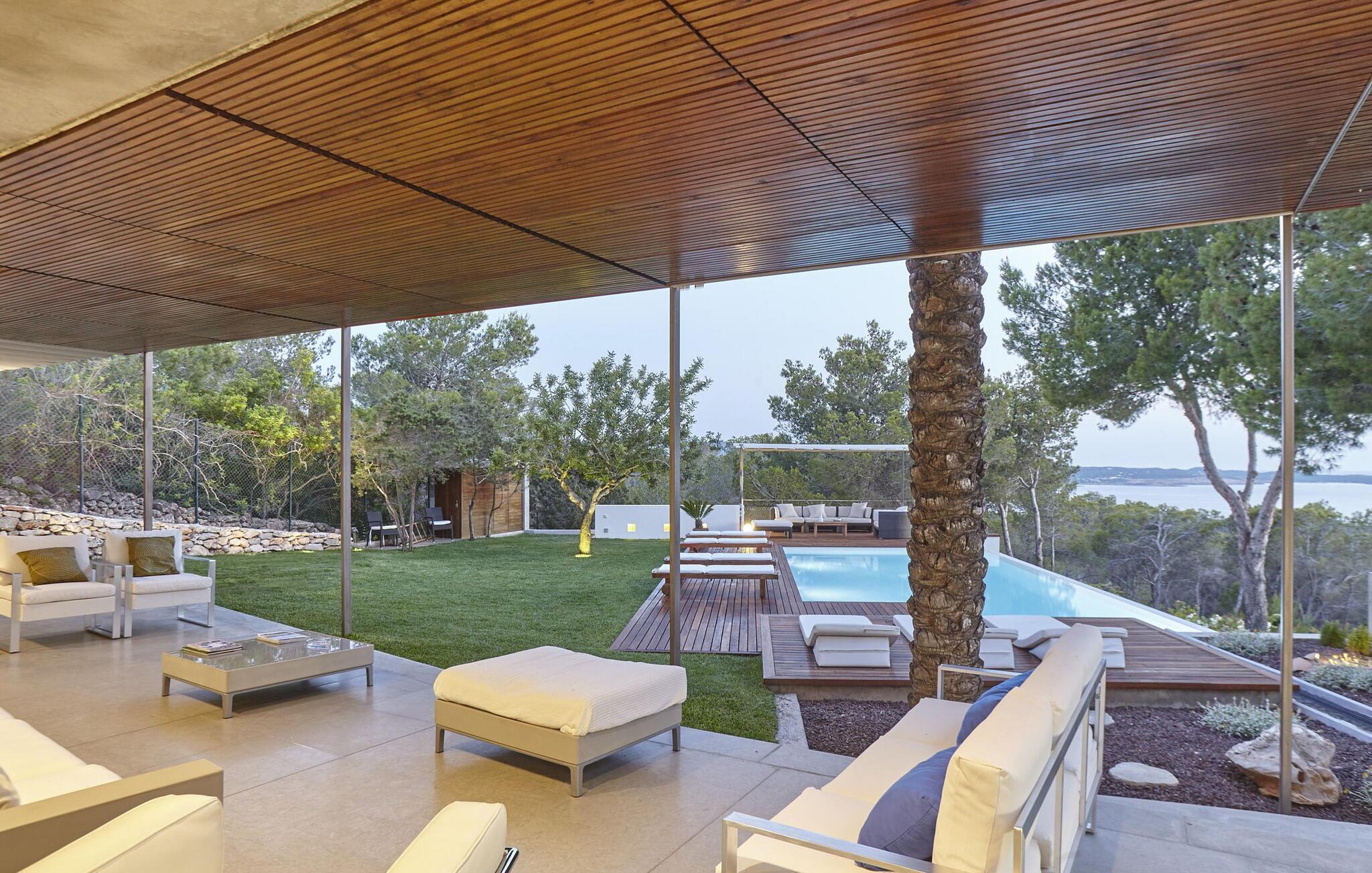 Minimalistische Villa mit 5 Schlafzimmern, nicht weit vom schönen Strand Cala Salada entfernt, auf einem Hügel, mit herrlichem Blick auf das Meer und den Sonnenuntergang vom Garten aus.