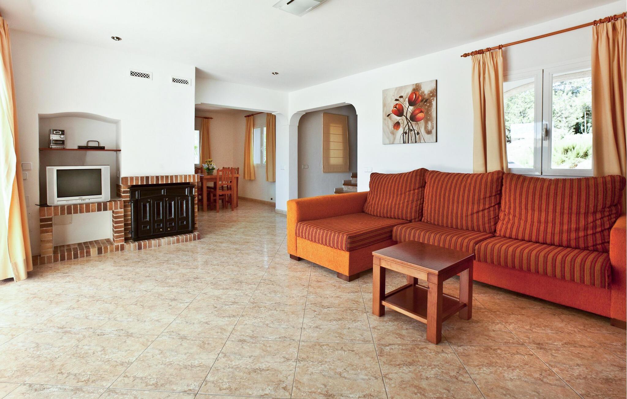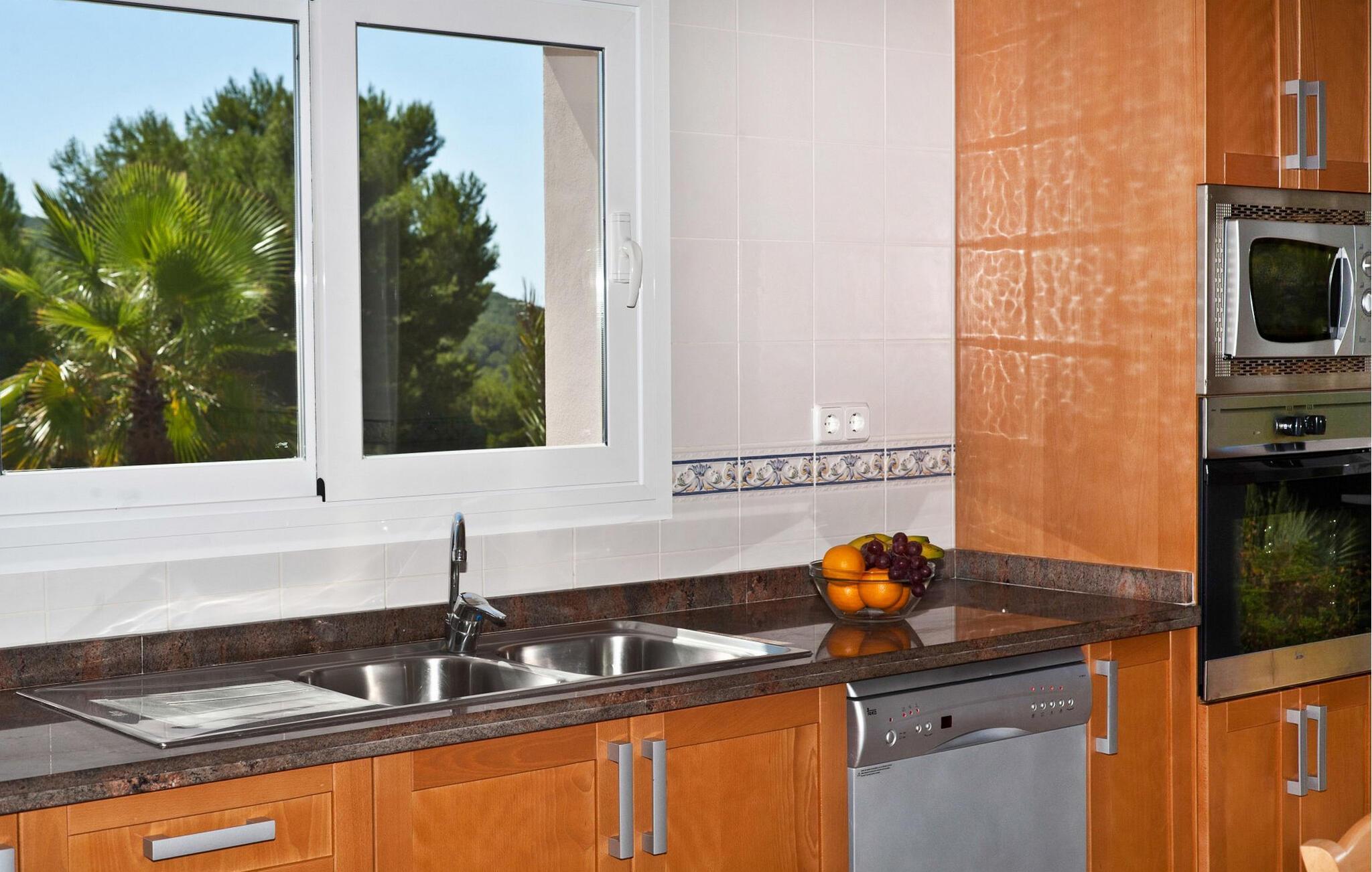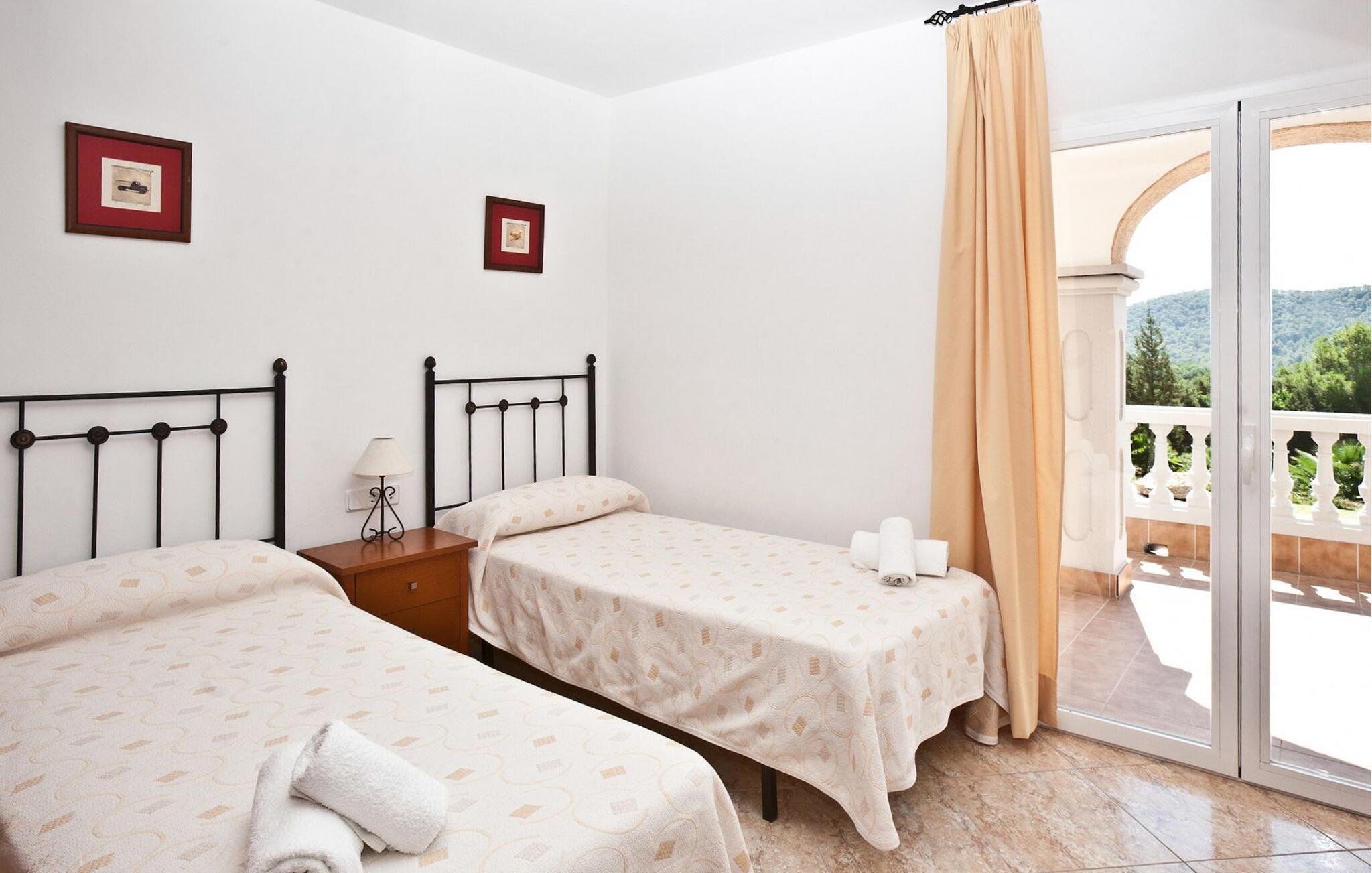 Die Villa erstreckt sich über zwei Ebenen und verfügt über insgesamt 4 Schlafzimmer und 3 Badezimmer im Inneren der Villa sowie 1 zusätzliches Badezimmer im Freien. Im Erdgeschoss finden Sie zwei Schlafzimmer mit zwei Einzelbetten, ein Badezimmer mit Badewanne und eine voll ausgestattete Küche mit modernen Geräten wie Kühlschrank mit Gefrierfach, Geschirrspüler, Backofen, Mikrowelle, Cerankochfeld, Toaster, Wasserkocher, Waschmaschine und Trockner. Die Küche öffnet sich direkt in den Garten und verfügt über einen Tisch für vier Personen. Das Wohnzimmer mit Fernseher, Stereoanlage und kostenlosem WLAN bietet direkten Zugang zum Pool.