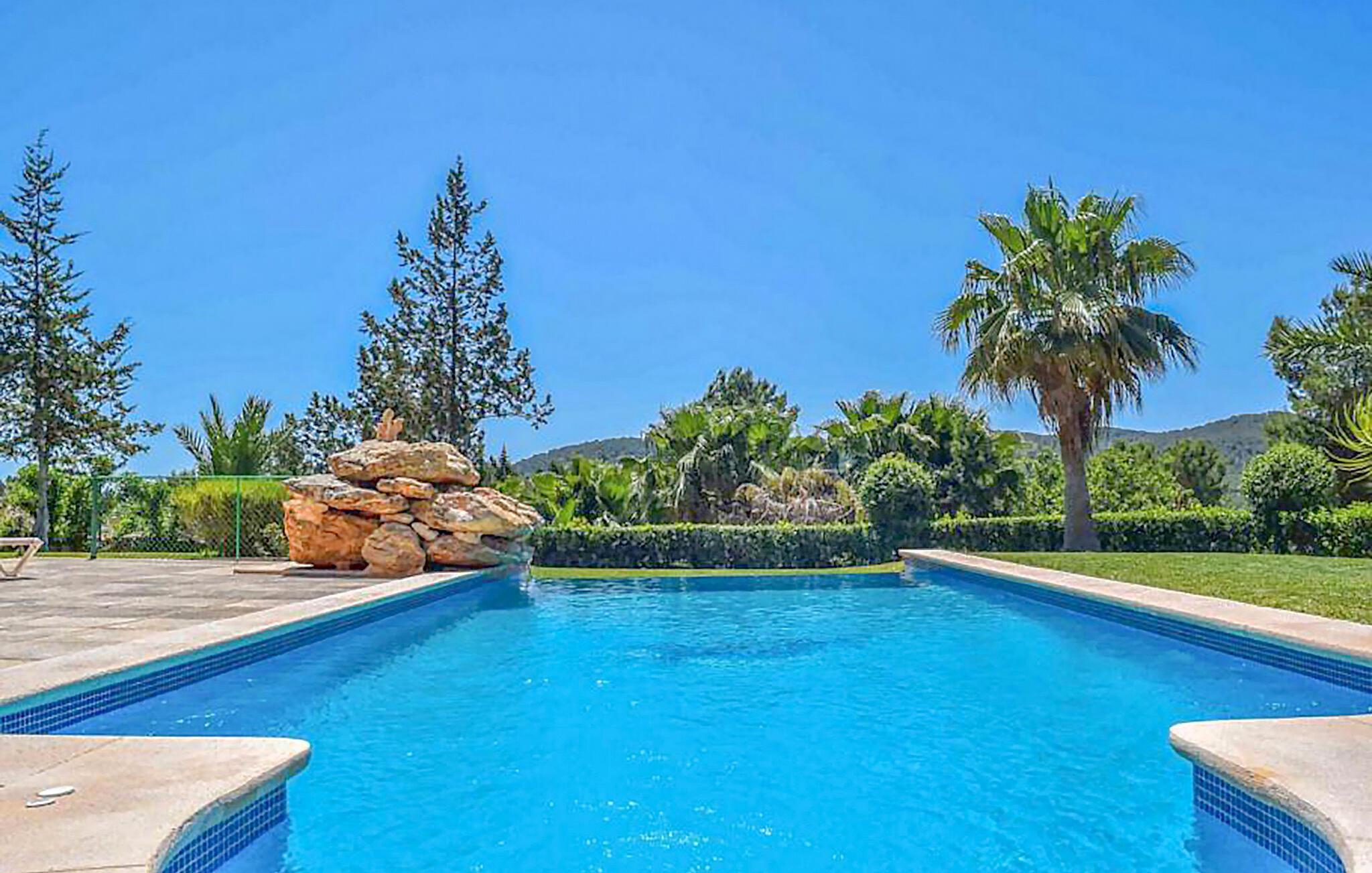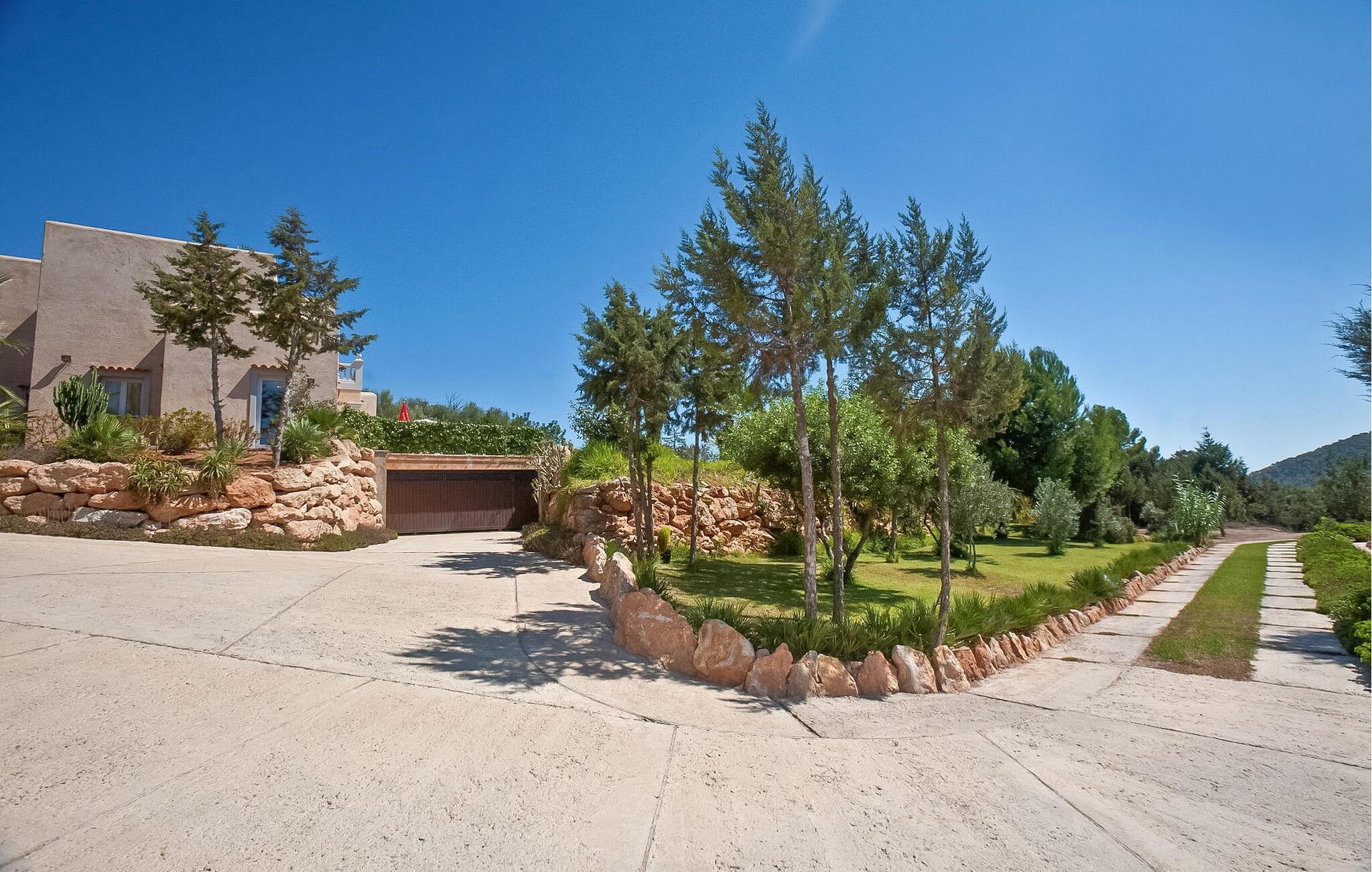 Diese moderne Villa befindet sich in idealer Lage zwischen Ibiza, San José und Cala Jondal auf einem 7.000 m² großen Grundstück mit elektrischem Tor. Das Anwesen ist von üppigen Gärten und Vegetation umgeben und bietet eine ruhige Atmosphäre zum Entspannen.