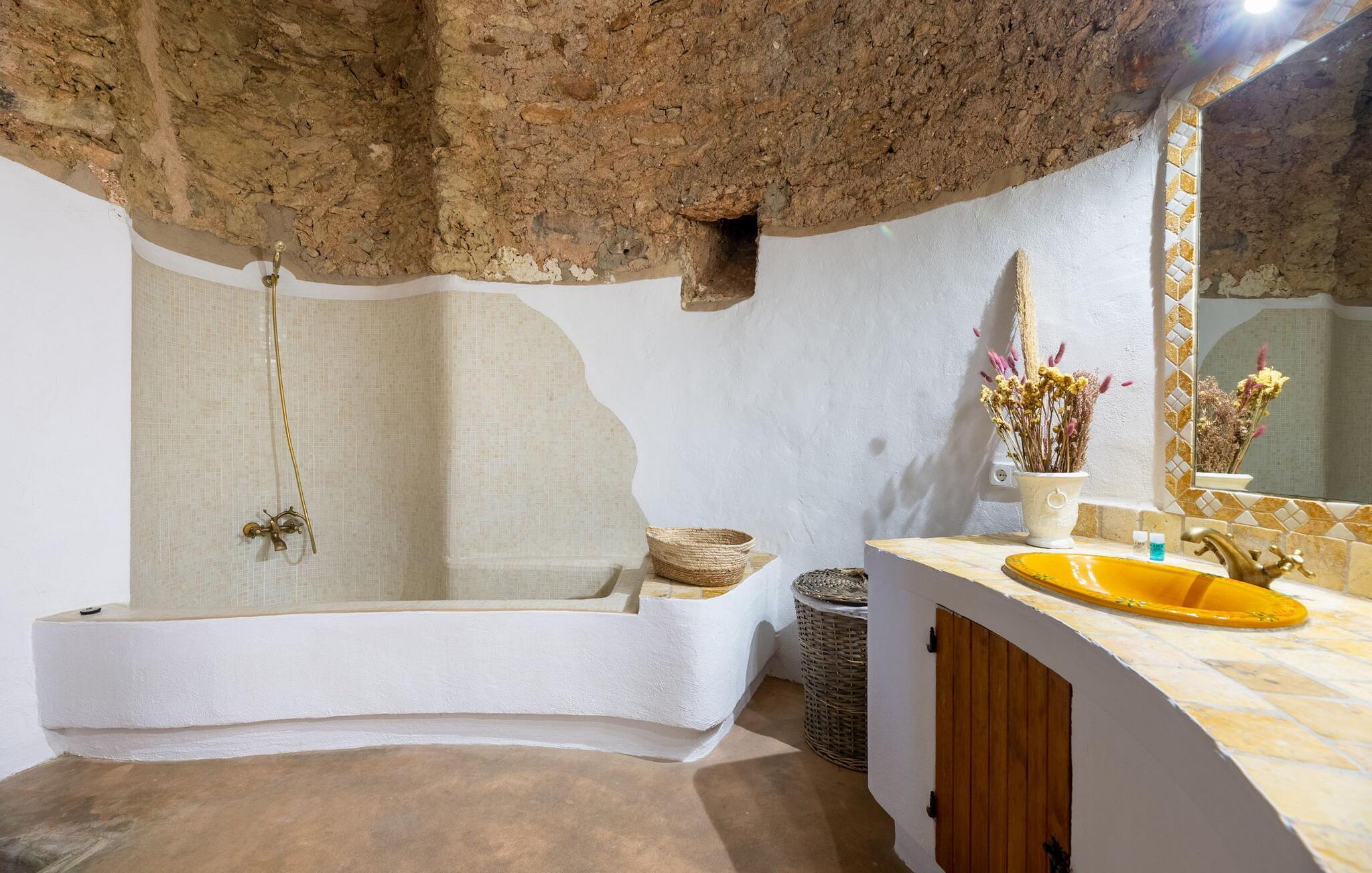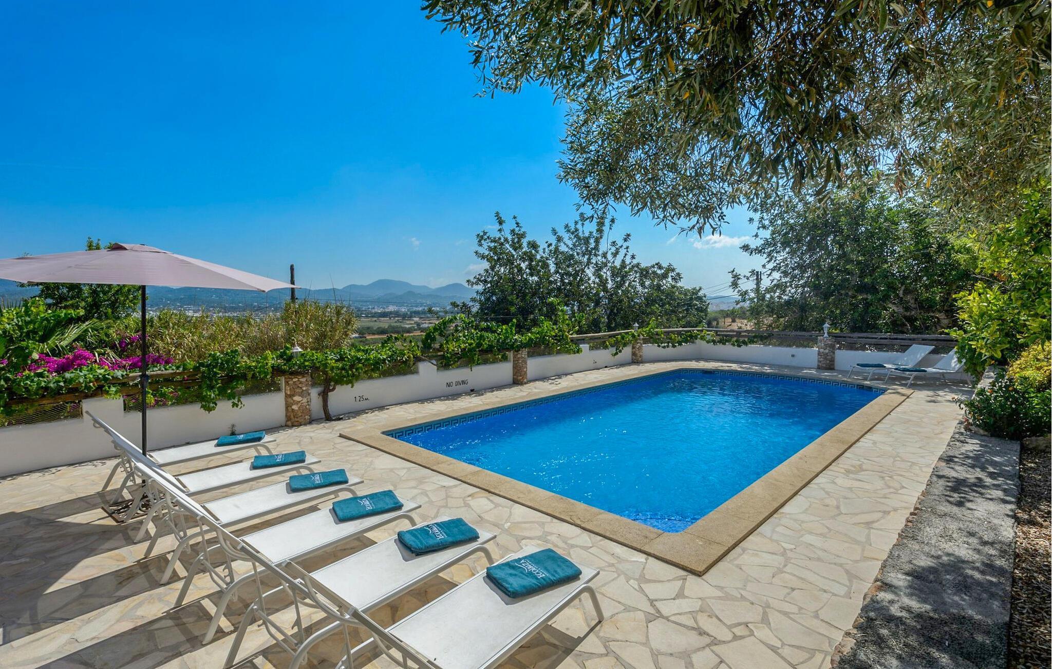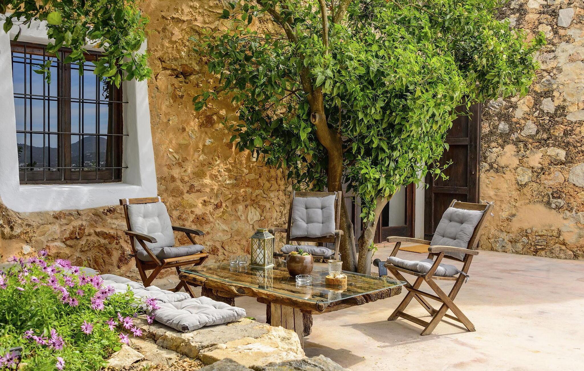 Draußen ist der einladende Poolbereich mit einer Außendusche, Sonnenliegen und zwei Ebenen Gartenbereich ausgestattet, darunter eine Chill-out-Zone, ein Essbereich und ein Grill. Mit Parkplätzen für zwei Autos, Klimaanlage in allen Schlafzimmern und Deckenventilatoren für zusätzlichen Komfort bietet dieses Bauernhaus sowohl Charme als auch Bequemlichkeit für einen entspannenden Rückzugsort auf Ibiza.