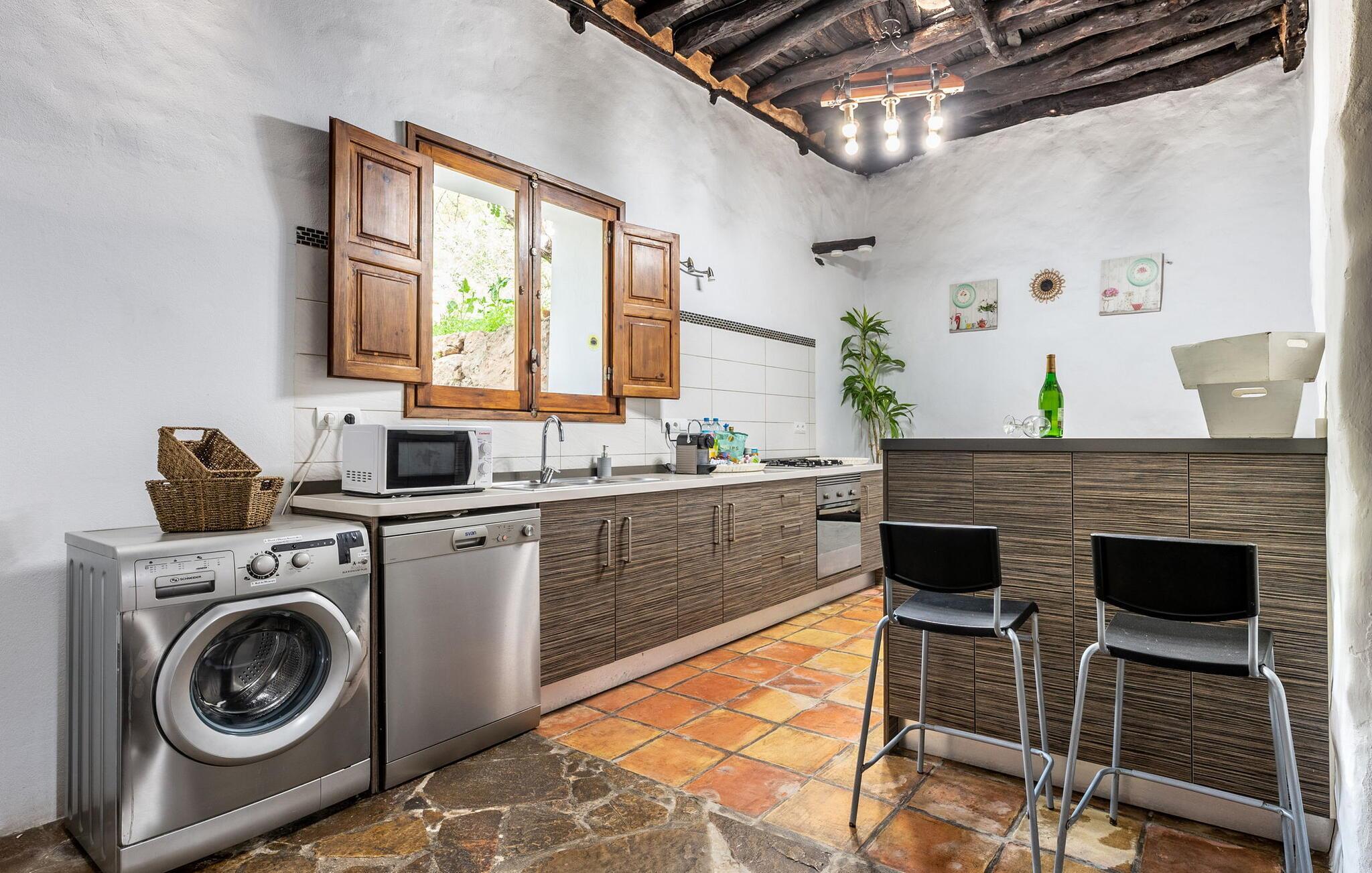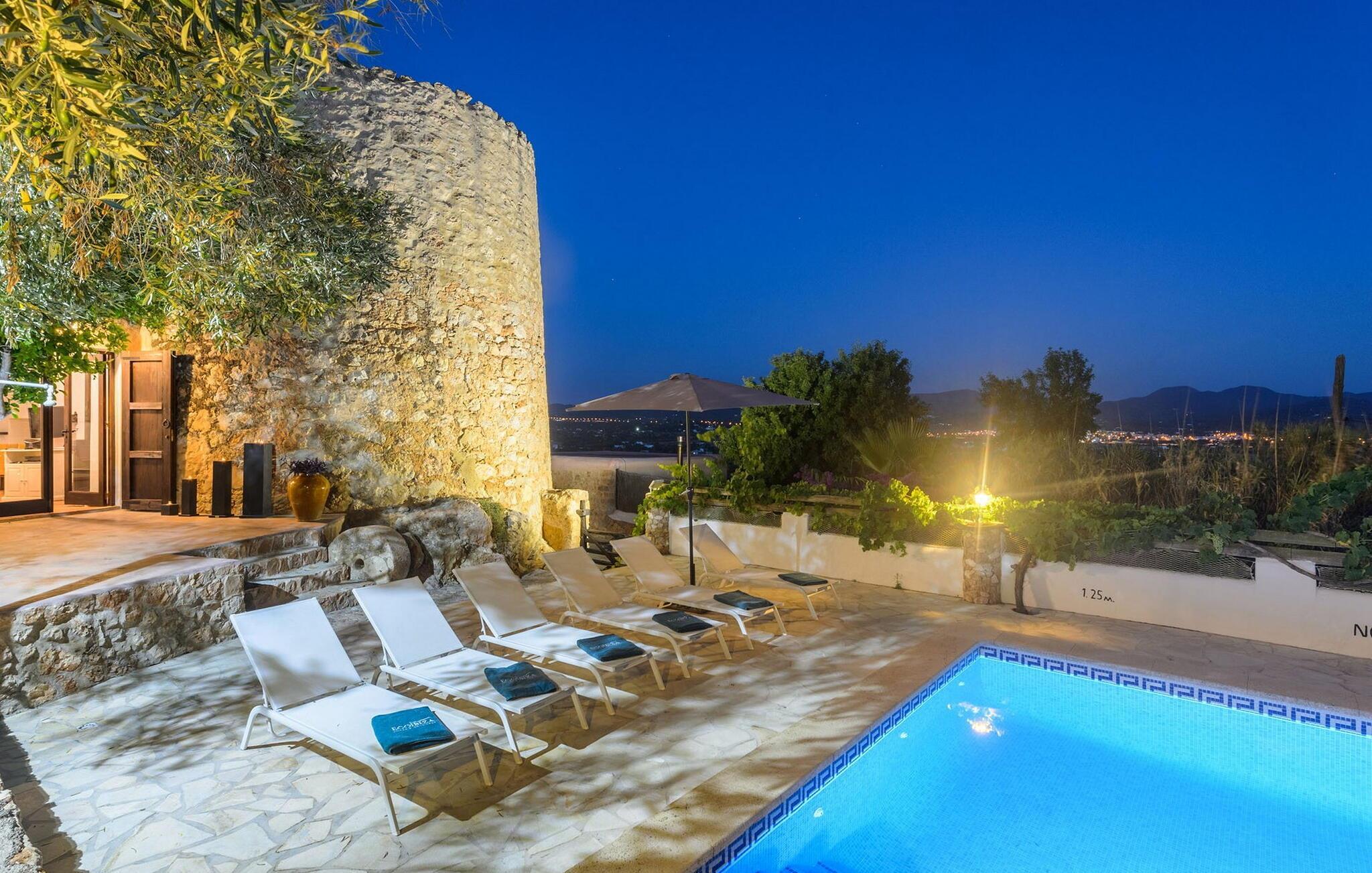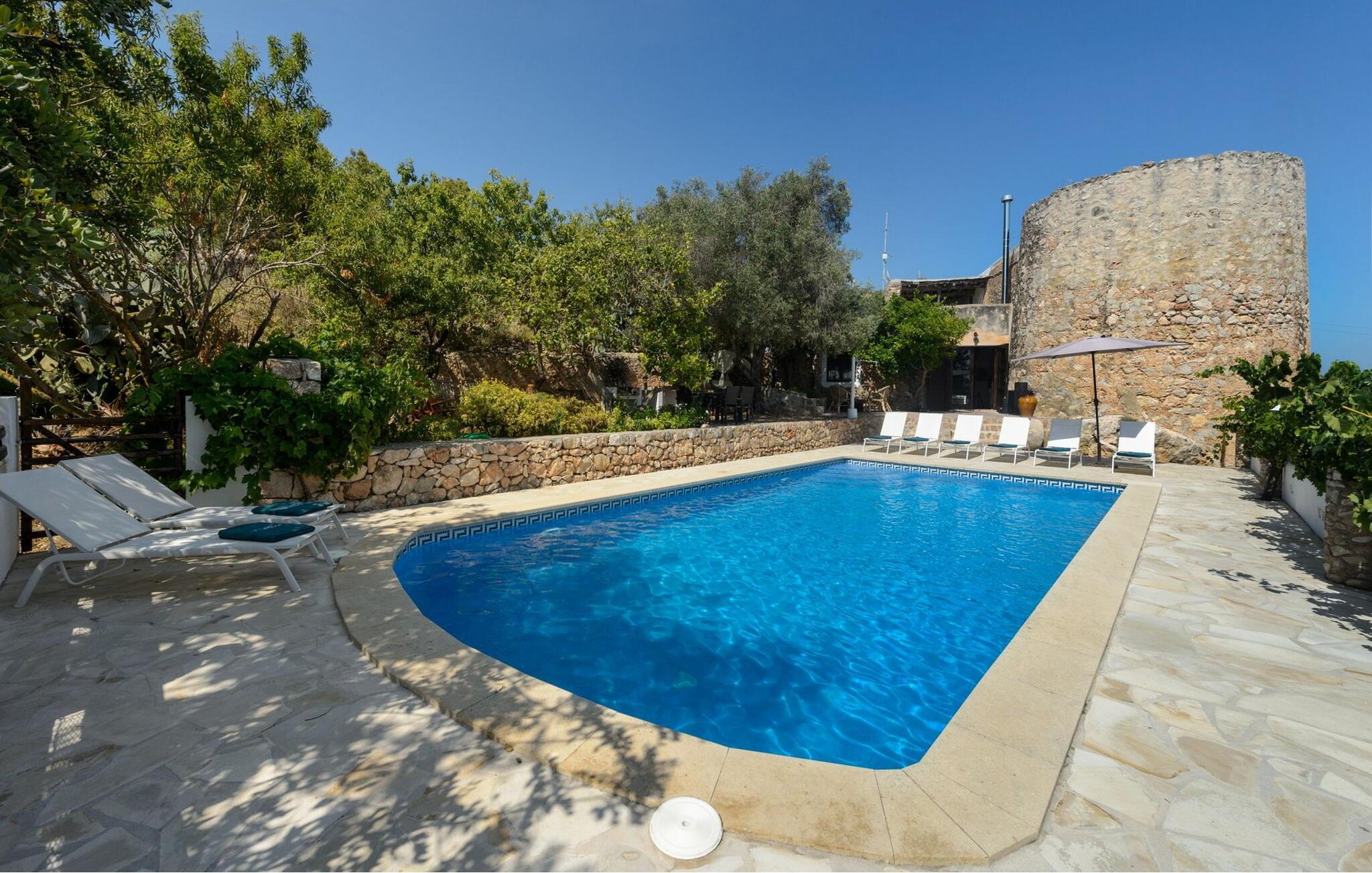 Draußen ist der einladende Poolbereich mit einer Außendusche, Sonnenliegen und zwei Ebenen Gartenbereich ausgestattet, darunter eine Chill-out-Zone, ein Essbereich und ein Grill. Mit Parkplätzen für zwei Autos, Klimaanlage in allen Schlafzimmern und Deckenventilatoren für zusätzlichen Komfort bietet dieses Bauernhaus sowohl Charme als auch Bequemlichkeit für einen entspannenden Rückzugsort auf Ibiza.