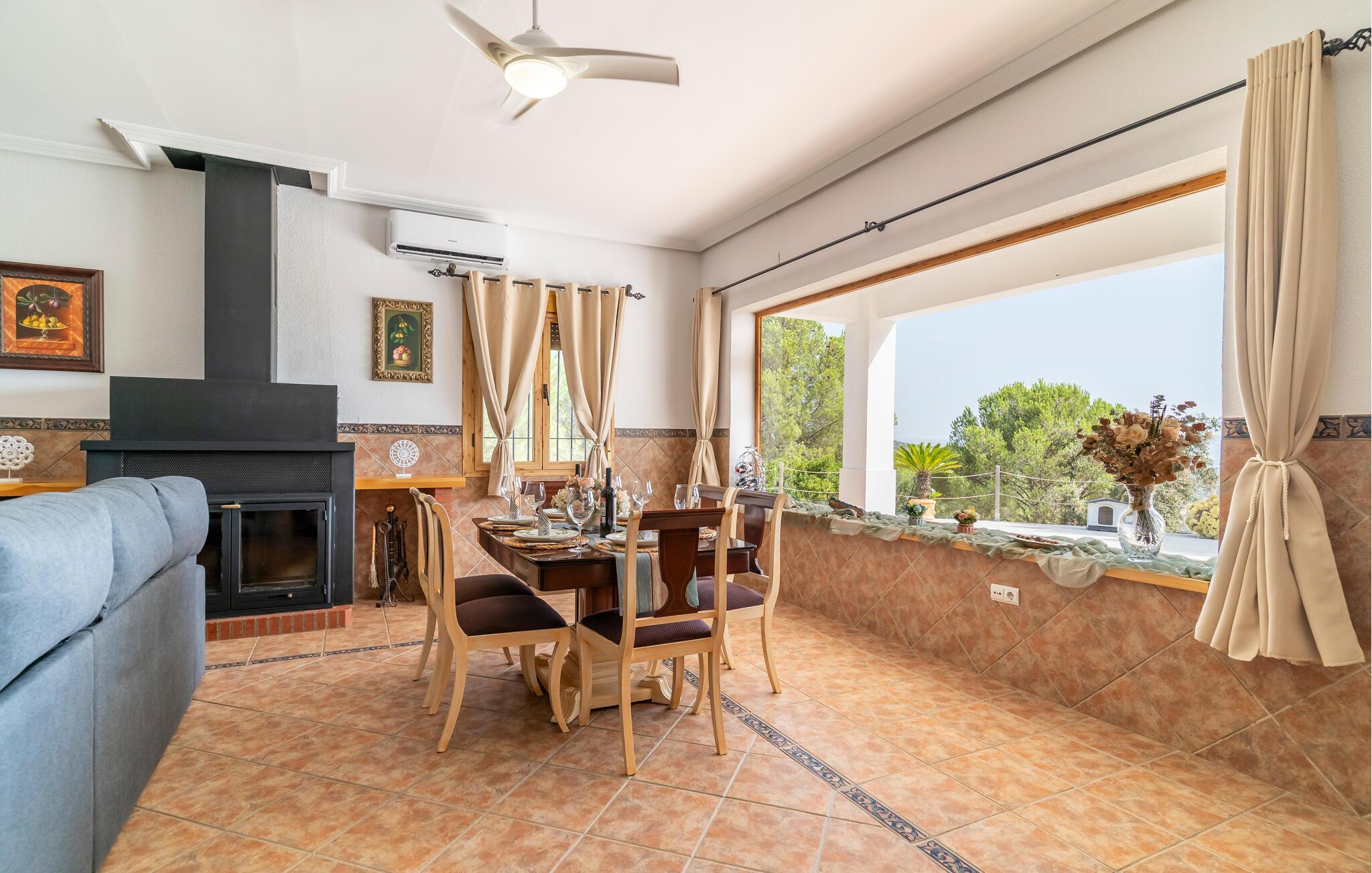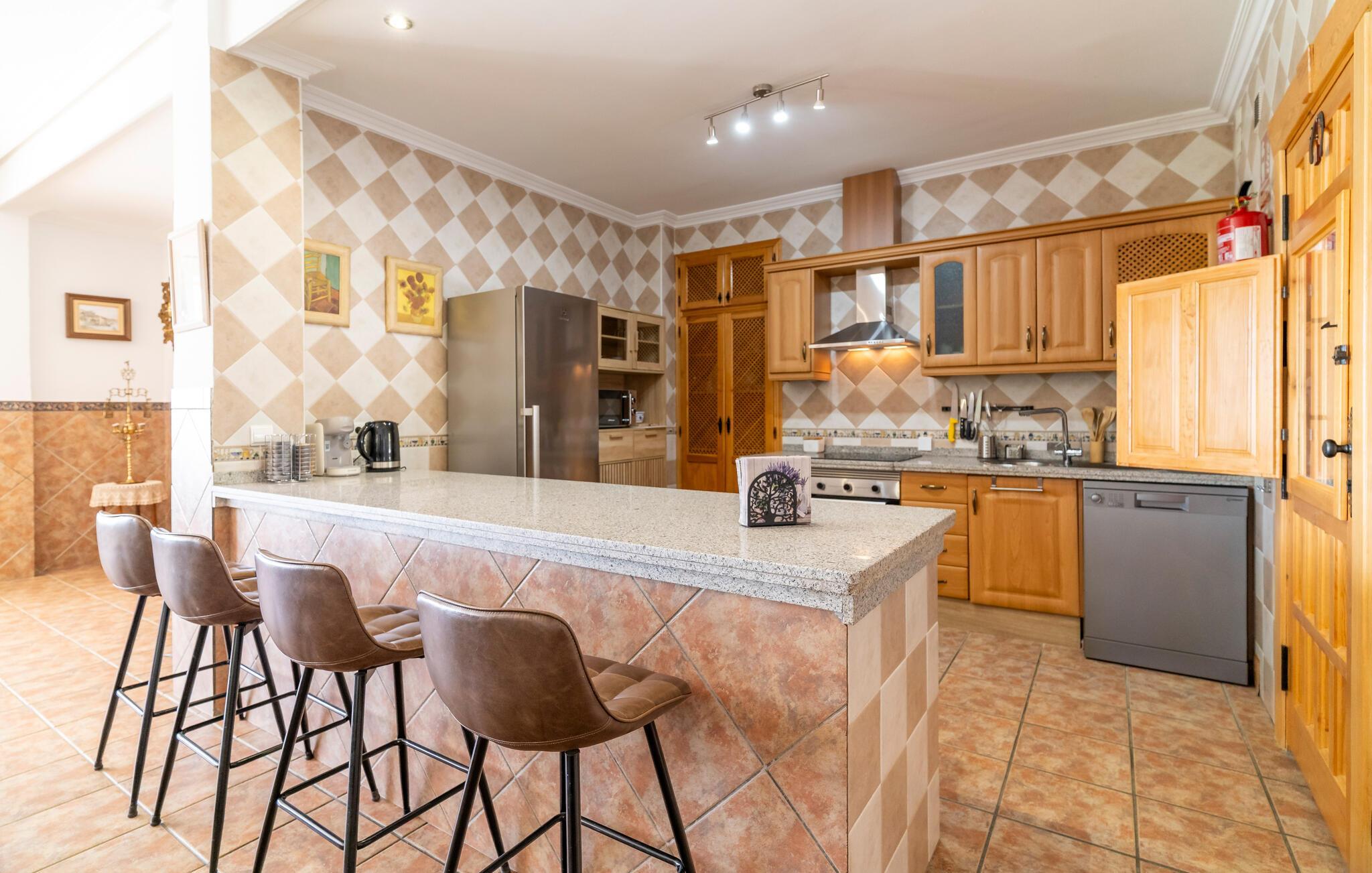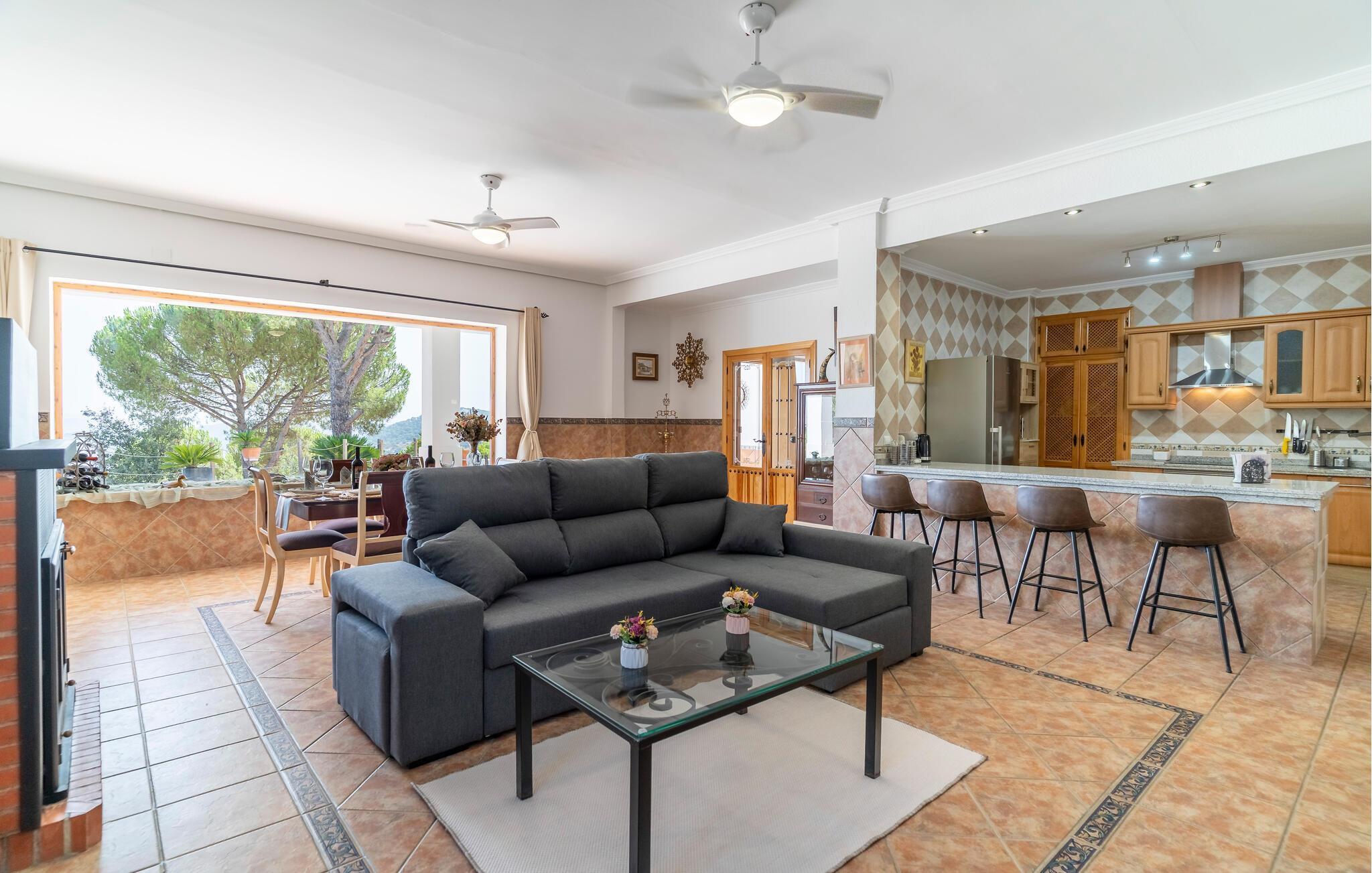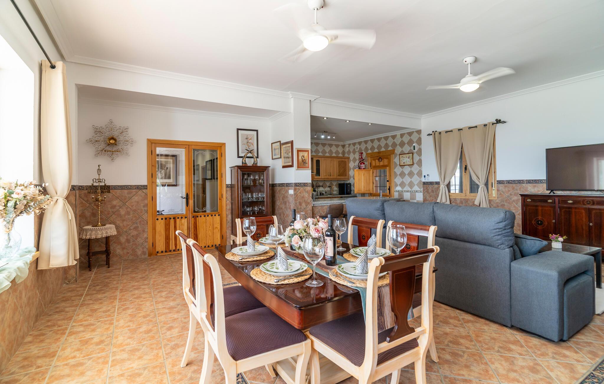 Freuen Sie sich auf eine entspannte Auszeit in diesem charmanten Ferienhaus, eingebettet in eine idyllische Landschaft. Treten Sie ein in den Wohnbereich, der mit schönen Möbeln und mediterranen Akzenten überzeugt. Machen Sie es sich auf dem komfortablen Sofa gemütlich oder genießen Sie ein gutes Buch im lichtdurchfluteten Raum. Bereiten Sie in der Küche unkompliziert Ihre Lieblingsgerichte zu. Nutzen Sie den angrenzenden Essbereich für gemeinsame Mahlzeiten.