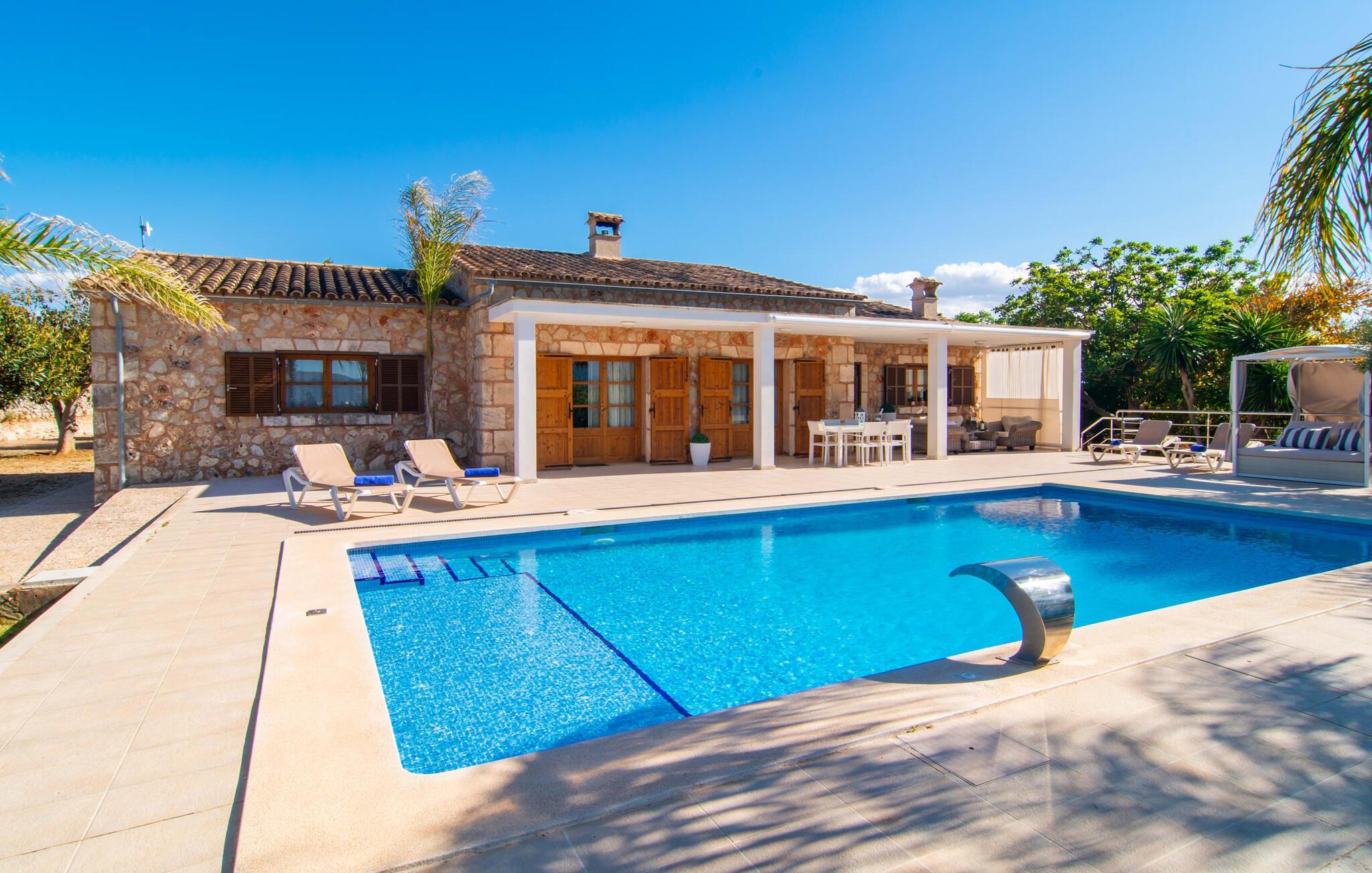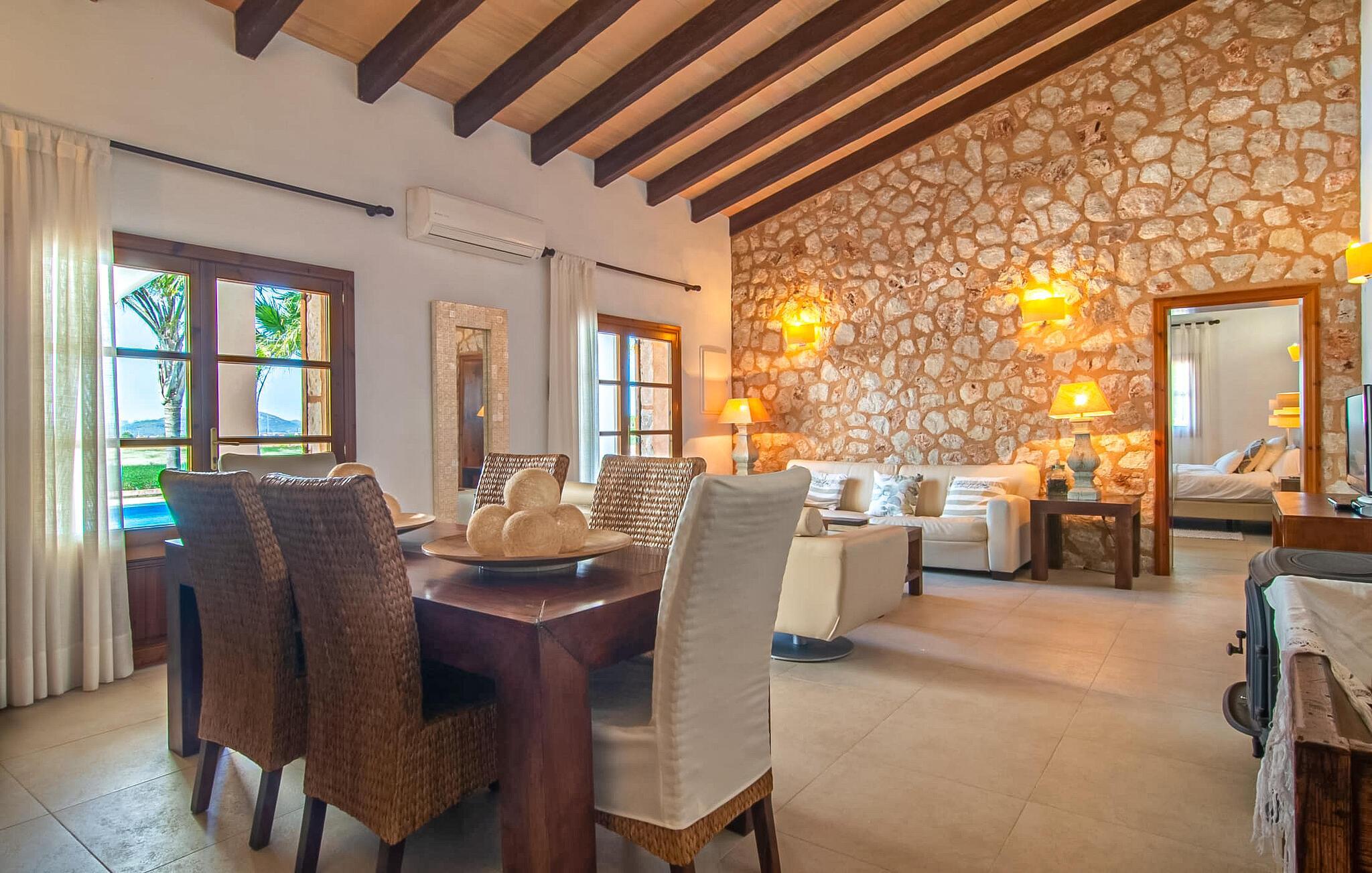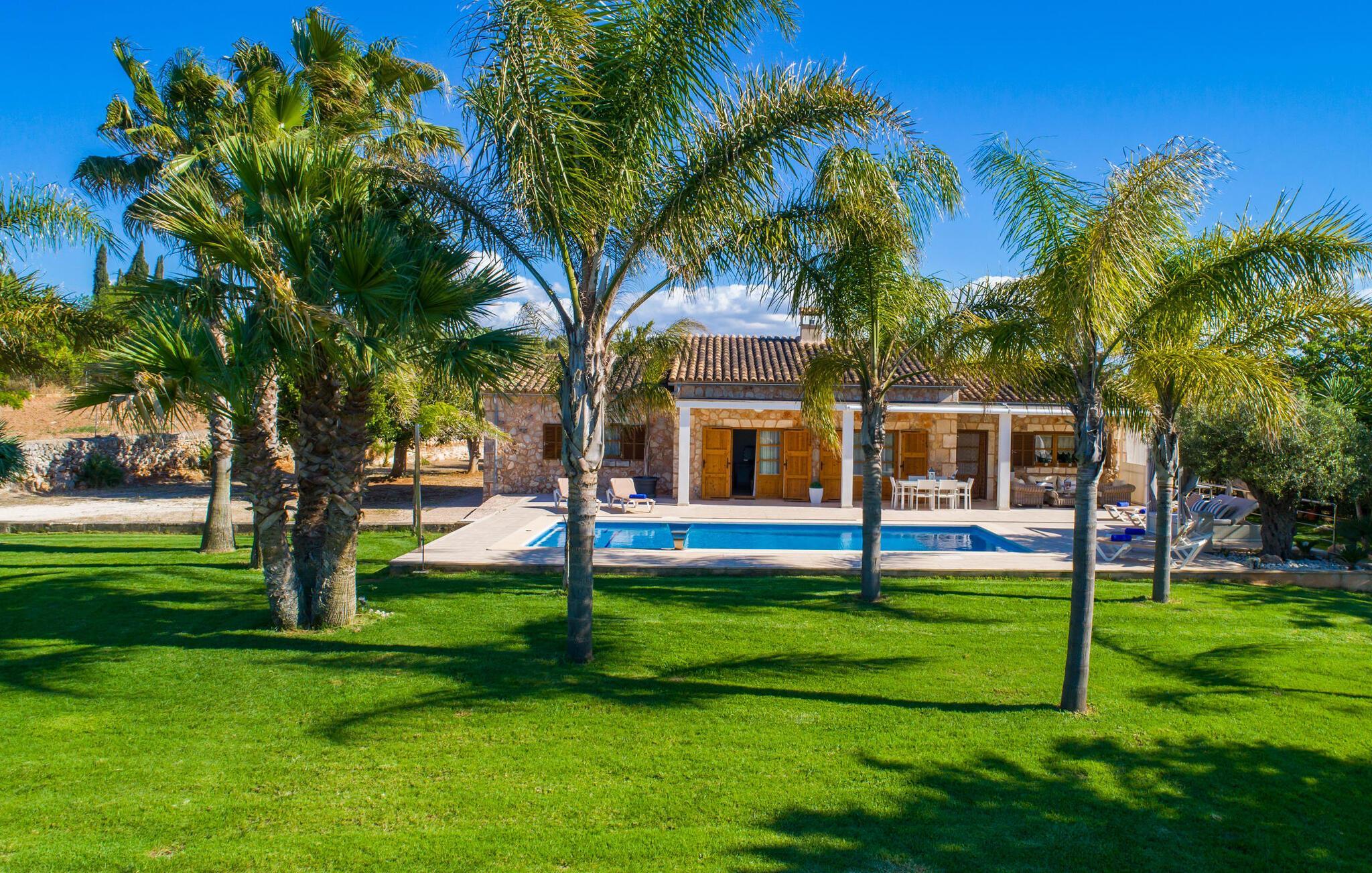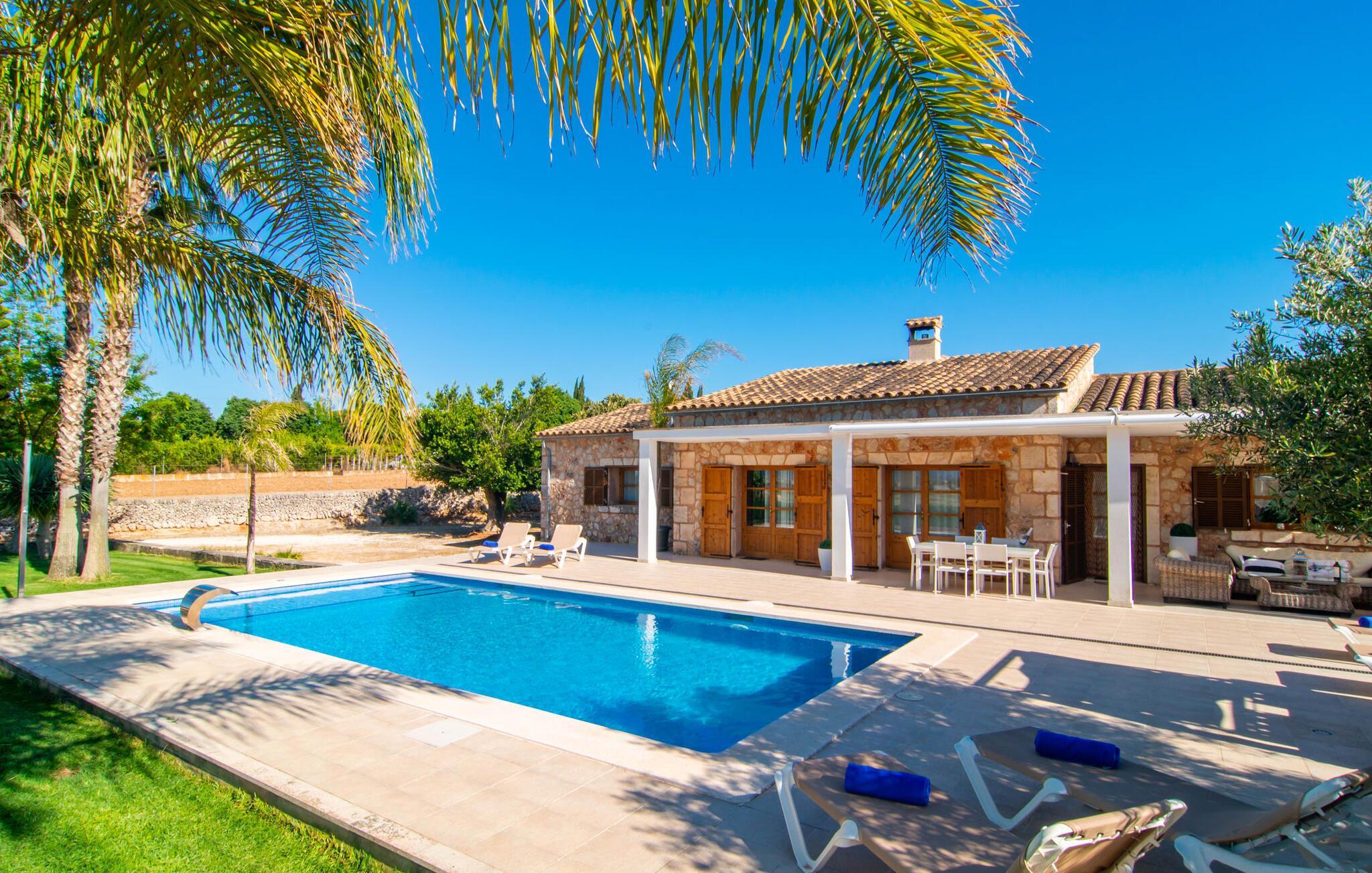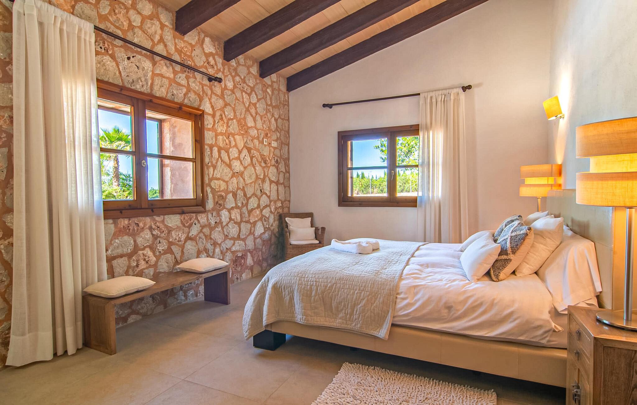 Das Landleben ist nicht zwangsläufig entbehrungsreich – im Gegenteil: Wenn Sie von einem naturnahen Villenurlaub in ruhiger, aber nicht abgeschiedener Lage mit allen Annehmlichkeiten eines modernen Ferienhauses träumen, dann ist „Vinroma“ genau das Richtige für Sie perfekte Wahl für Sie! Das ebenerdige Natursteinhaus liegt auf einem wunderschön begrünten, liebevoll angelegten Grundstück und bietet einen herrlichen Blick auf die umliegenden Felder und Berge in der Ferne. Hinter dem Haus befindet sich nicht nur eine überdachte Terrasse mit Esstisch, Stühlen und bequemen Gartenmöbeln, sondern auch ein großer, flacher Pool mit integriertem Whirlpool und einem angenehm klingenden, stilvollen Wasserfall. Hier können Sie sich in absoluter Privatsphäre so richtig verwöhnen lassen und nach einem erfrischenden Bad im kühlen Nass eine wohlverdiente Siesta auf einer der einladenden Sonnenliegen genießen. Wenn Sie dann noch verschlafen über Ihre Sonnenbrille blicken, sehen Sie nur noch die beeindruckenden, hohen Palmen, die an der Längsseite des Pools gepflanzt sind – ein Traum!
