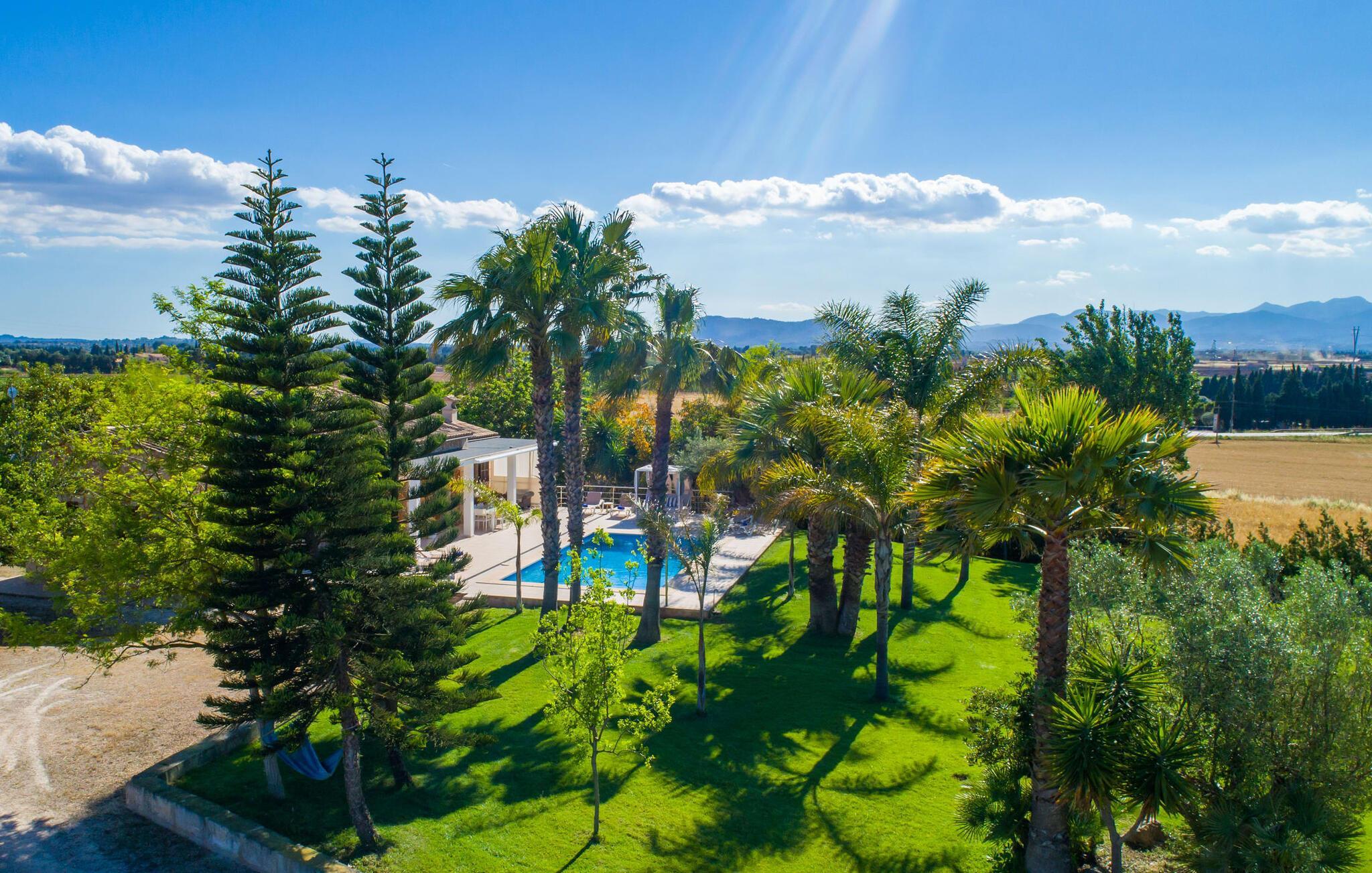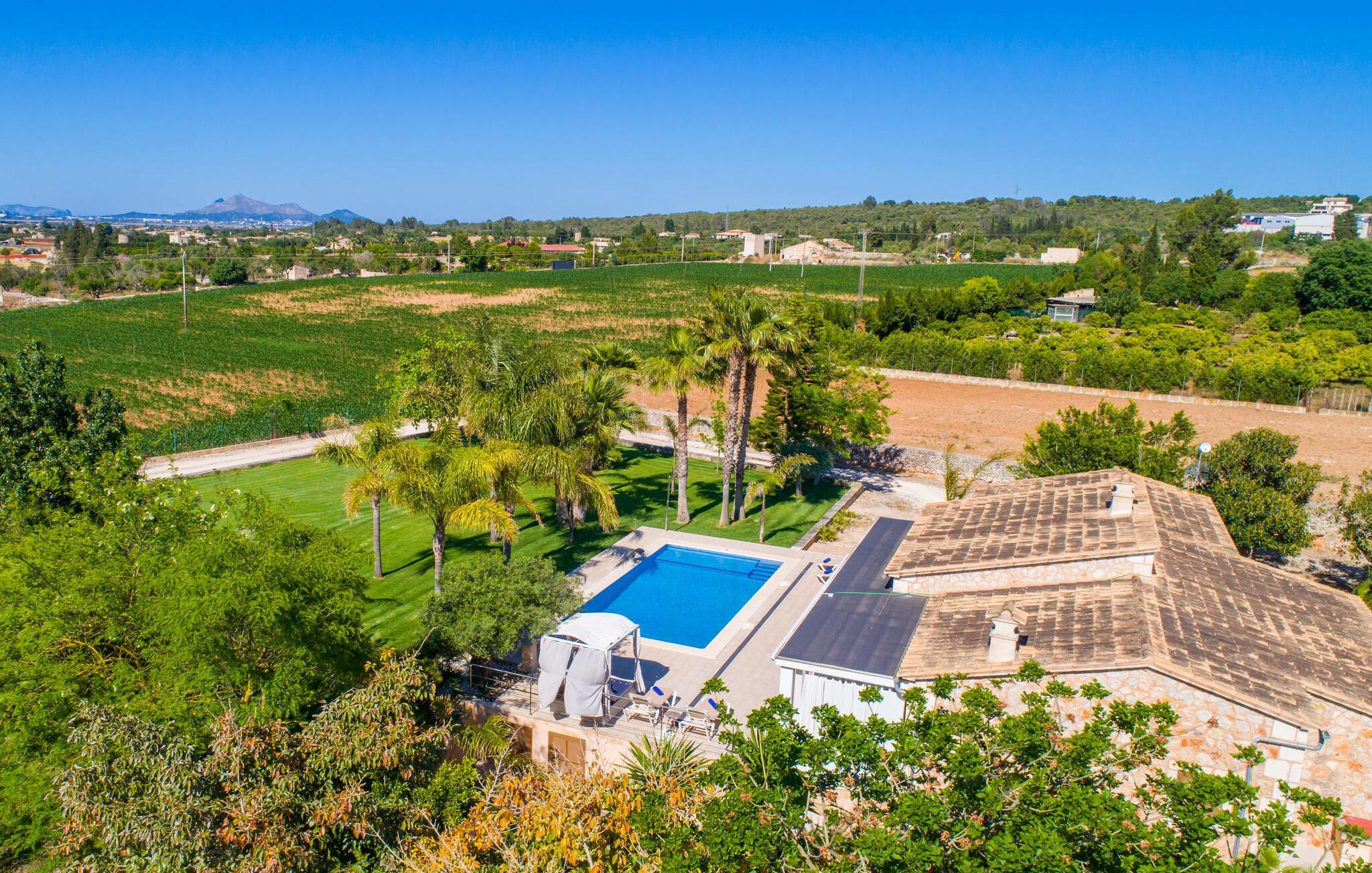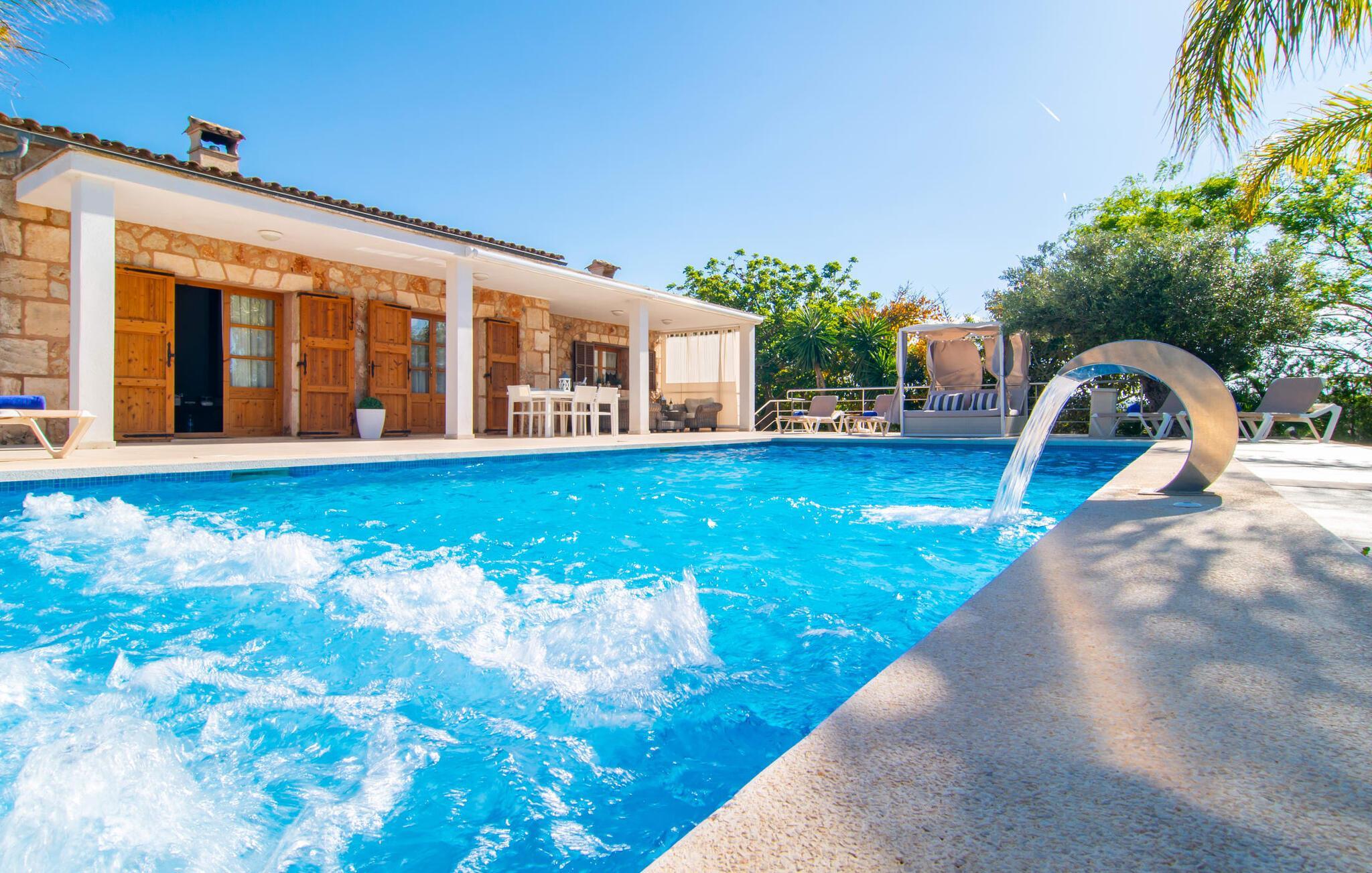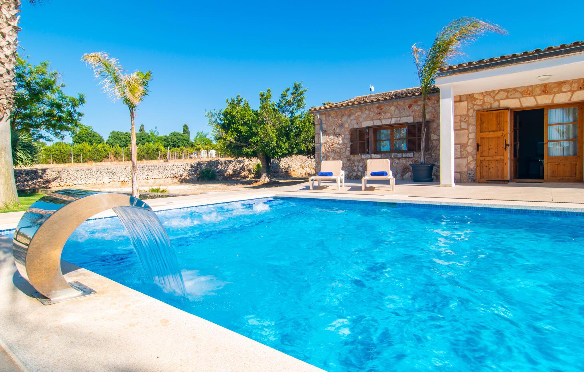 Das Landleben ist nicht zwangsläufig entbehrungsreich – im Gegenteil: Wenn Sie von einem naturnahen Villenurlaub in ruhiger, aber nicht abgeschiedener Lage mit allen Annehmlichkeiten eines modernen Ferienhauses träumen, dann ist „Vinroma“ genau das Richtige für Sie perfekte Wahl für Sie! Das ebenerdige Natursteinhaus liegt auf einem wunderschön begrünten, liebevoll angelegten Grundstück und bietet einen herrlichen Blick auf die umliegenden Felder und Berge in der Ferne. Hinter dem Haus befindet sich nicht nur eine überdachte Terrasse mit Esstisch, Stühlen und bequemen Gartenmöbeln, sondern auch ein großer, flacher Pool mit integriertem Whirlpool und einem angenehm klingenden, stilvollen Wasserfall. Hier können Sie sich in absoluter Privatsphäre so richtig verwöhnen lassen und nach einem erfrischenden Bad im kühlen Nass eine wohlverdiente Siesta auf einer der einladenden Sonnenliegen genießen. Wenn Sie dann noch verschlafen über Ihre Sonnenbrille blicken, sehen Sie nur noch die beeindruckenden, hohen Palmen, die an der Längsseite des Pools gepflanzt sind – ein Traum!