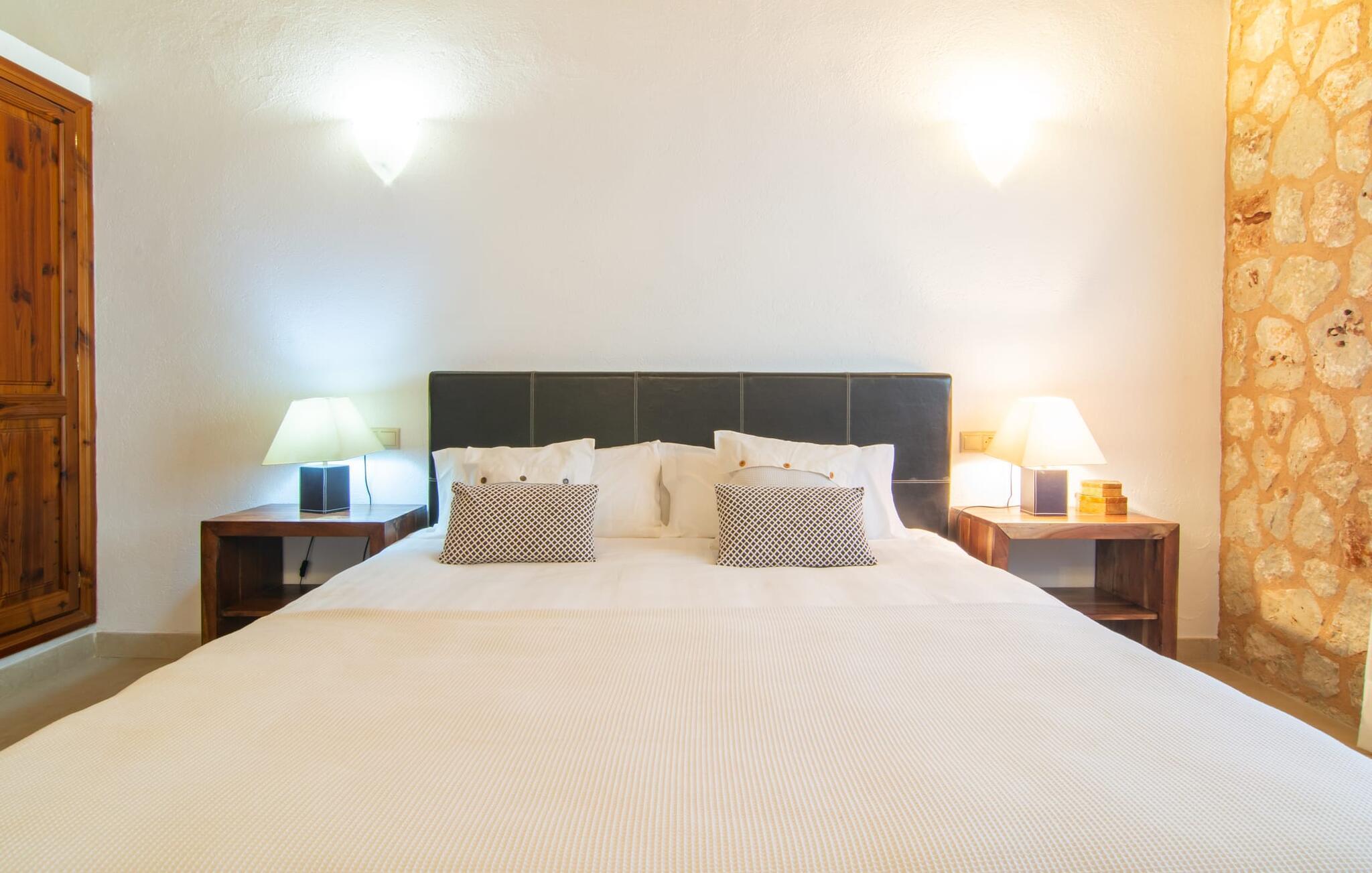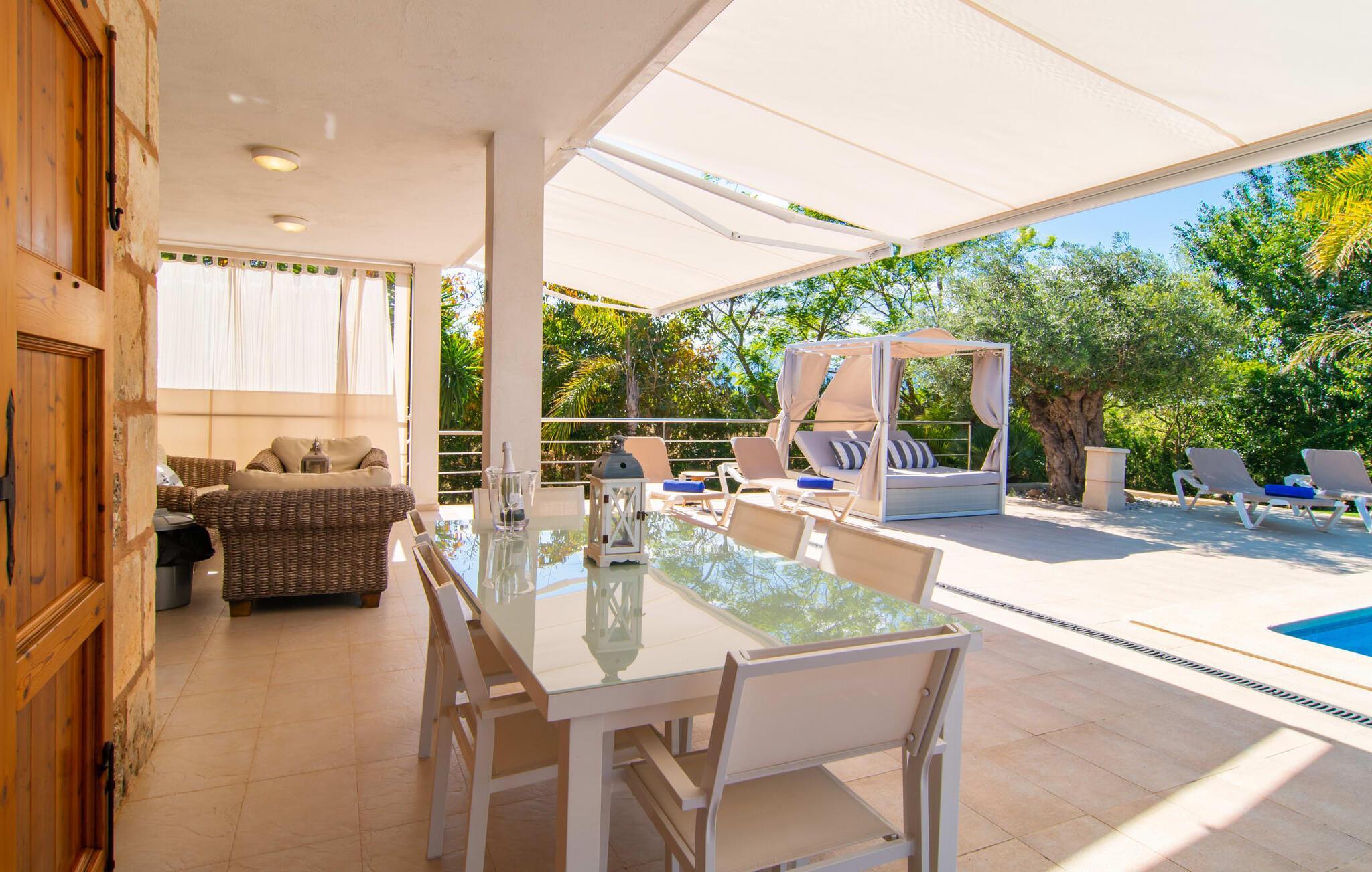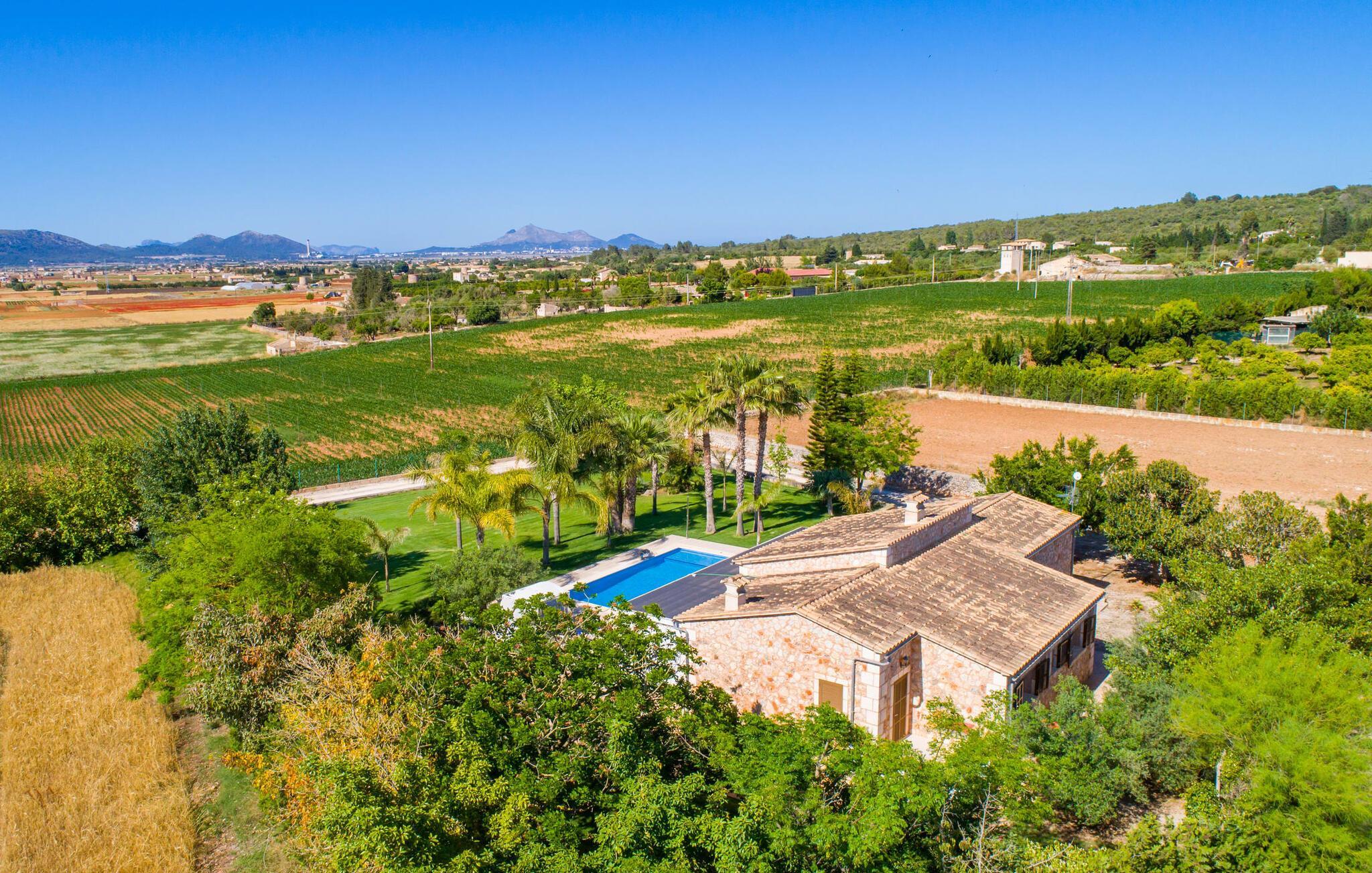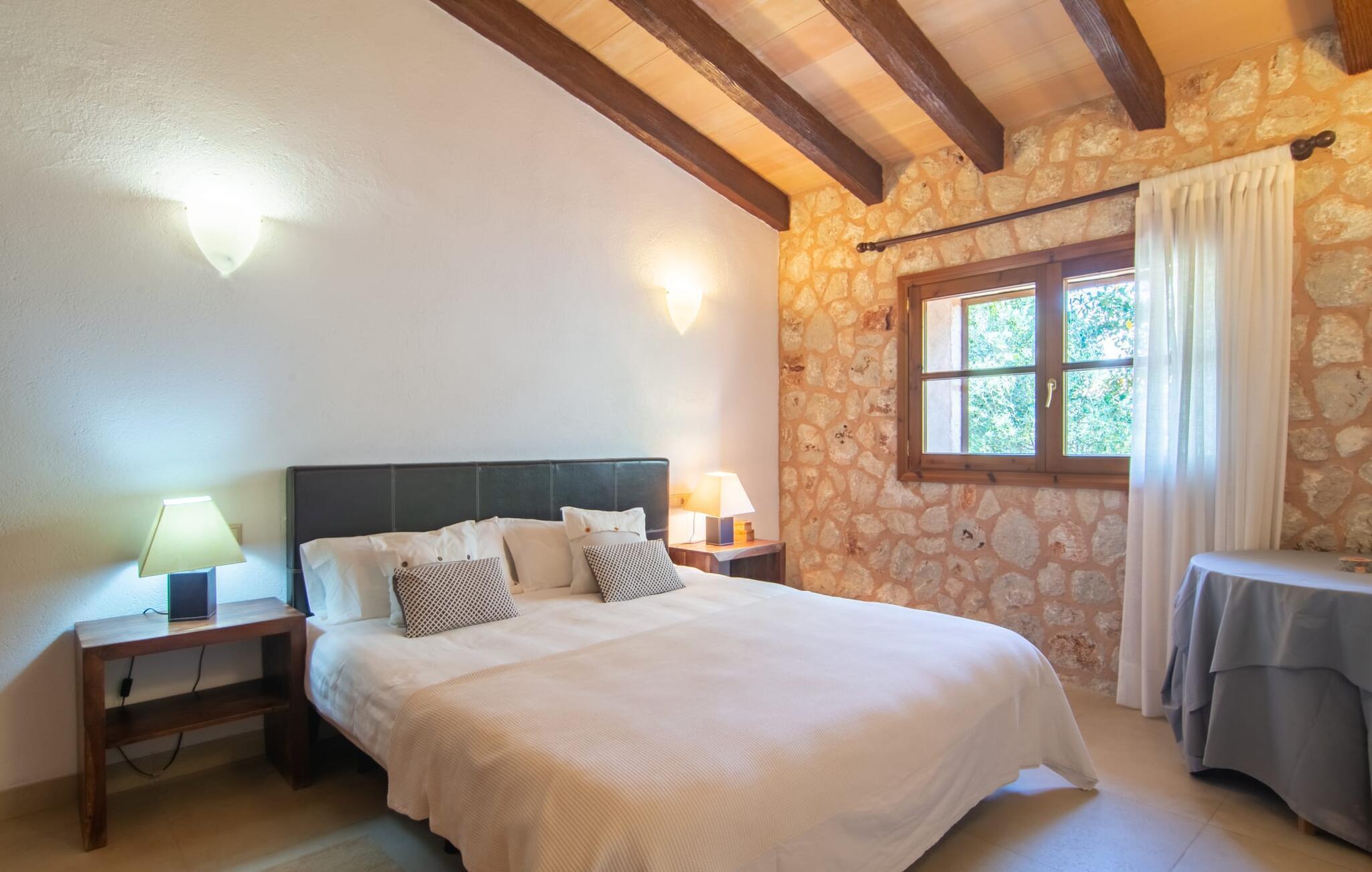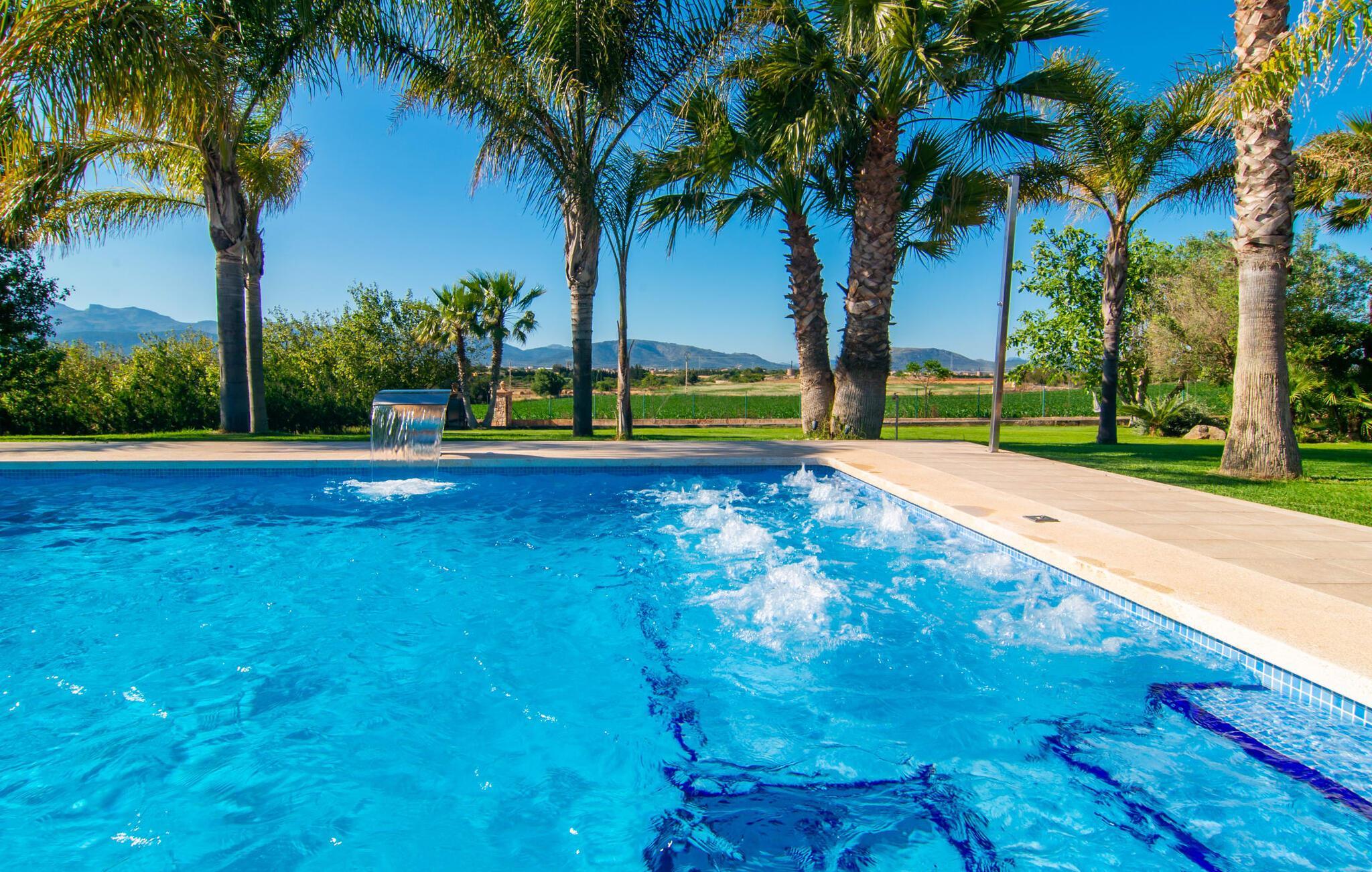 Das Landleben ist nicht zwangsläufig entbehrungsreich – im Gegenteil: Wenn Sie von einem naturnahen Villenurlaub in ruhiger, aber nicht abgeschiedener Lage mit allen Annehmlichkeiten eines modernen Ferienhauses träumen, dann ist „Vinroma“ genau das Richtige für Sie perfekte Wahl für Sie! Das ebenerdige Natursteinhaus liegt auf einem wunderschön begrünten, liebevoll angelegten Grundstück und bietet einen herrlichen Blick auf die umliegenden Felder und Berge in der Ferne. Hinter dem Haus befindet sich nicht nur eine überdachte Terrasse mit Esstisch, Stühlen und bequemen Gartenmöbeln, sondern auch ein großer, flacher Pool mit integriertem Whirlpool und einem angenehm klingenden, stilvollen Wasserfall. Hier können Sie sich in absoluter Privatsphäre so richtig verwöhnen lassen und nach einem erfrischenden Bad im kühlen Nass eine wohlverdiente Siesta auf einer der einladenden Sonnenliegen genießen. Wenn Sie dann noch verschlafen über Ihre Sonnenbrille blicken, sehen Sie nur noch die beeindruckenden, hohen Palmen, die an der Längsseite des Pools gepflanzt sind – ein Traum!