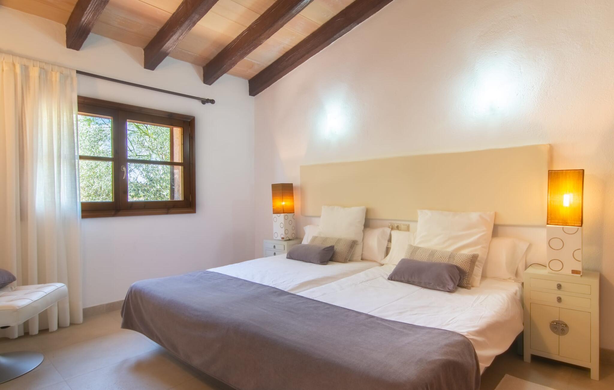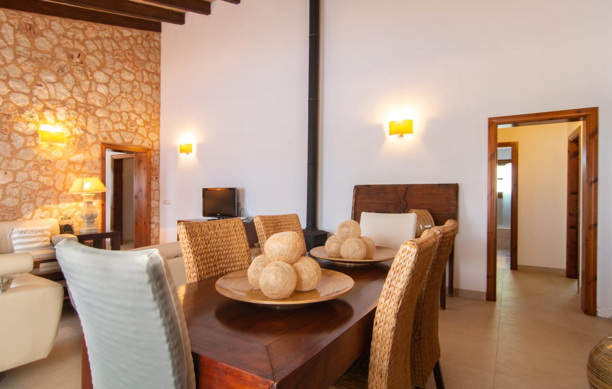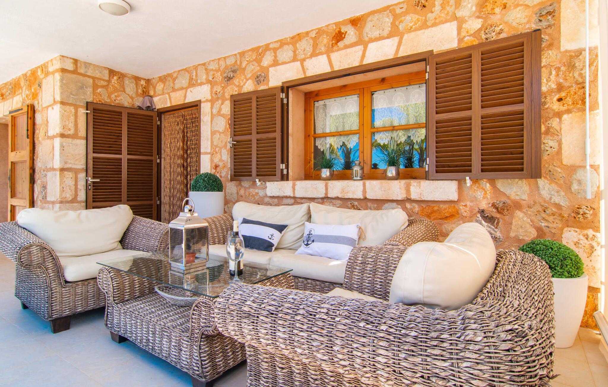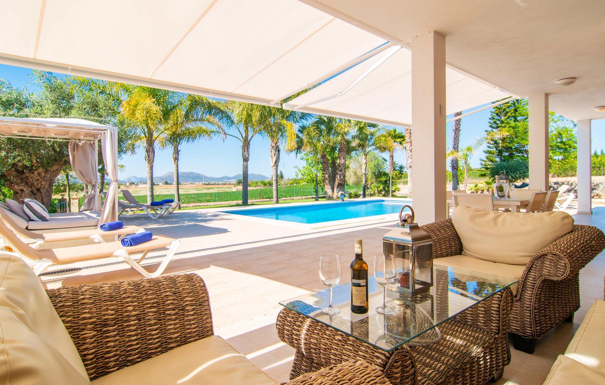 Das Landleben ist nicht zwangsläufig entbehrungsreich – im Gegenteil: Wenn Sie von einem naturnahen Villenurlaub in ruhiger, aber nicht abgeschiedener Lage mit allen Annehmlichkeiten eines modernen Ferienhauses träumen, dann ist „Vinroma“ genau das Richtige für Sie perfekte Wahl für Sie! Das ebenerdige Natursteinhaus liegt auf einem wunderschön begrünten, liebevoll angelegten Grundstück und bietet einen herrlichen Blick auf die umliegenden Felder und Berge in der Ferne. Hinter dem Haus befindet sich nicht nur eine überdachte Terrasse mit Esstisch, Stühlen und bequemen Gartenmöbeln, sondern auch ein großer, flacher Pool mit integriertem Whirlpool und einem angenehm klingenden, stilvollen Wasserfall. Hier können Sie sich in absoluter Privatsphäre so richtig verwöhnen lassen und nach einem erfrischenden Bad im kühlen Nass eine wohlverdiente Siesta auf einer der einladenden Sonnenliegen genießen. Wenn Sie dann noch verschlafen über Ihre Sonnenbrille blicken, sehen Sie nur noch die beeindruckenden, hohen Palmen, die an der Längsseite des Pools gepflanzt sind – ein Traum!