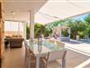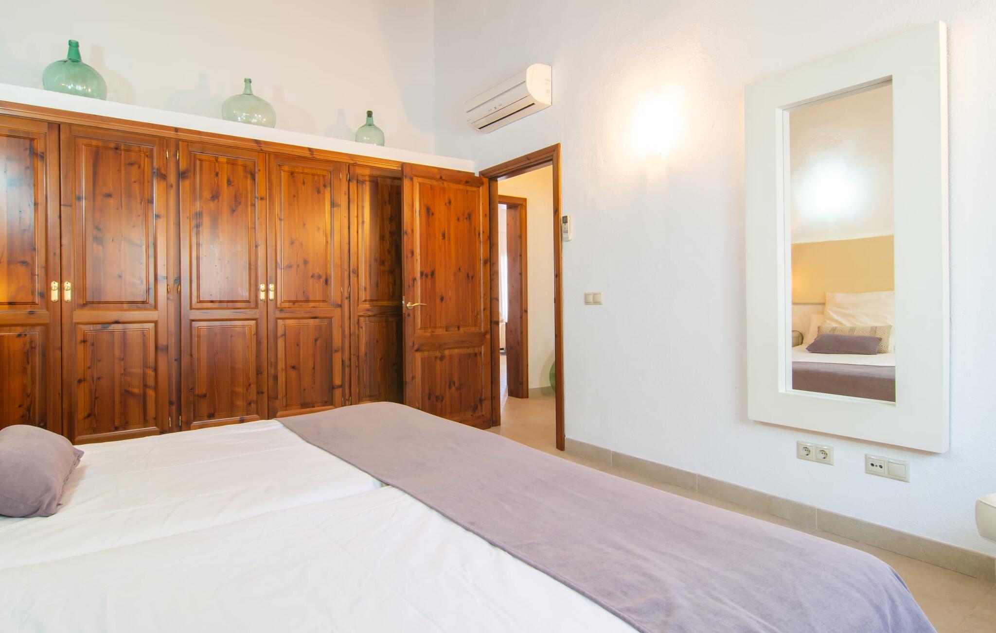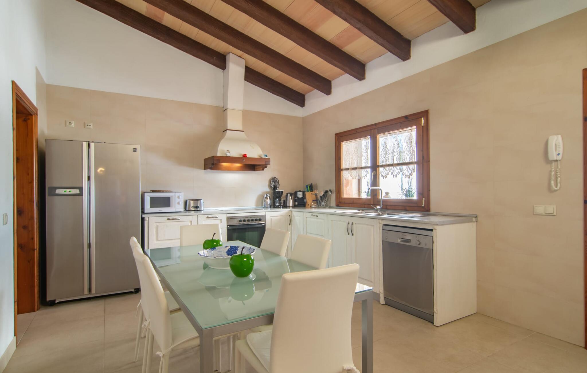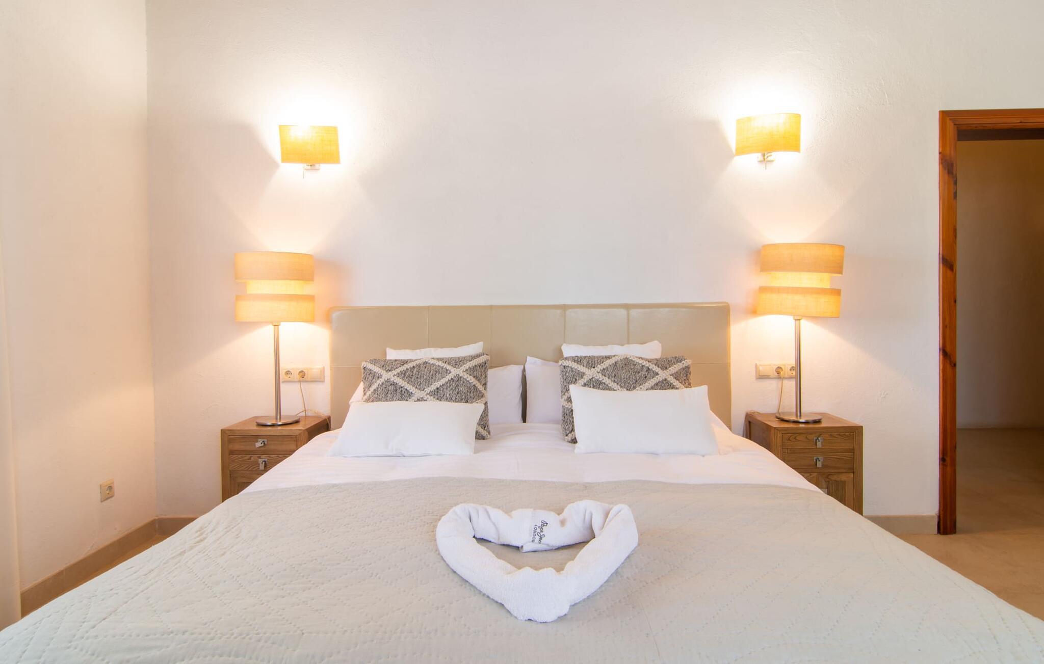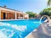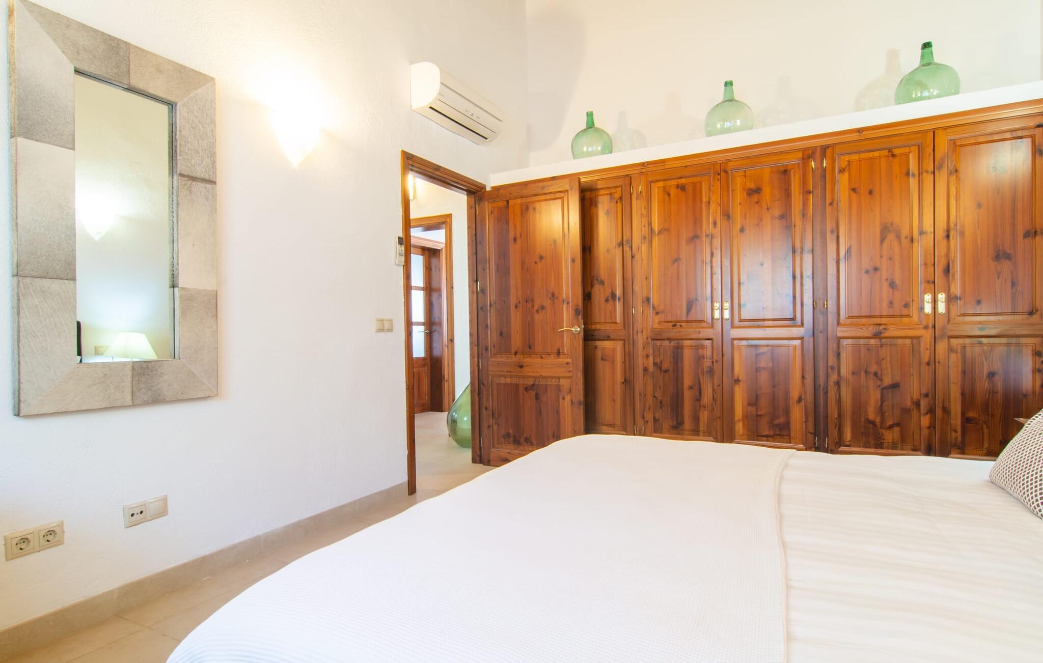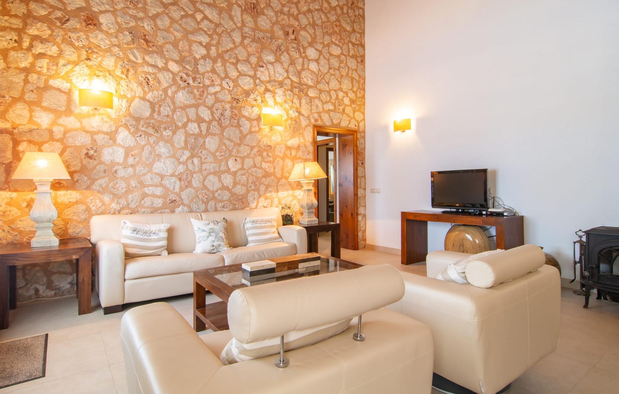Das Landleben ist nicht zwangsläufig entbehrungsreich – im Gegenteil: Wenn Sie von einem naturnahen Villenurlaub in ruhiger, aber nicht abgeschiedener Lage mit allen Annehmlichkeiten eines modernen Ferienhauses träumen, dann ist „Vinroma“ genau das Richtige für Sie perfekte Wahl für Sie! Das ebenerdige Natursteinhaus liegt auf einem wunderschön begrünten, liebevoll angelegten Grundstück und bietet einen herrlichen Blick auf die umliegenden Felder und Berge in der Ferne. Hinter dem Haus befindet sich nicht nur eine überdachte Terrasse mit Esstisch, Stühlen und bequemen Gartenmöbeln, sondern auch ein großer, flacher Pool mit integriertem Whirlpool und einem angenehm klingenden, stilvollen Wasserfall. Hier können Sie sich in absoluter Privatsphäre so richtig verwöhnen lassen und nach einem erfrischenden Bad im kühlen Nass eine wohlverdiente Siesta auf einer der einladenden Sonnenliegen genießen. Wenn Sie dann noch verschlafen über Ihre Sonnenbrille blicken, sehen Sie nur noch die beeindruckenden, hohen Palmen, die an der Längsseite des Pools gepflanzt sind – ein Traum!
