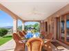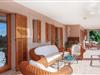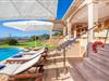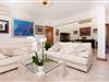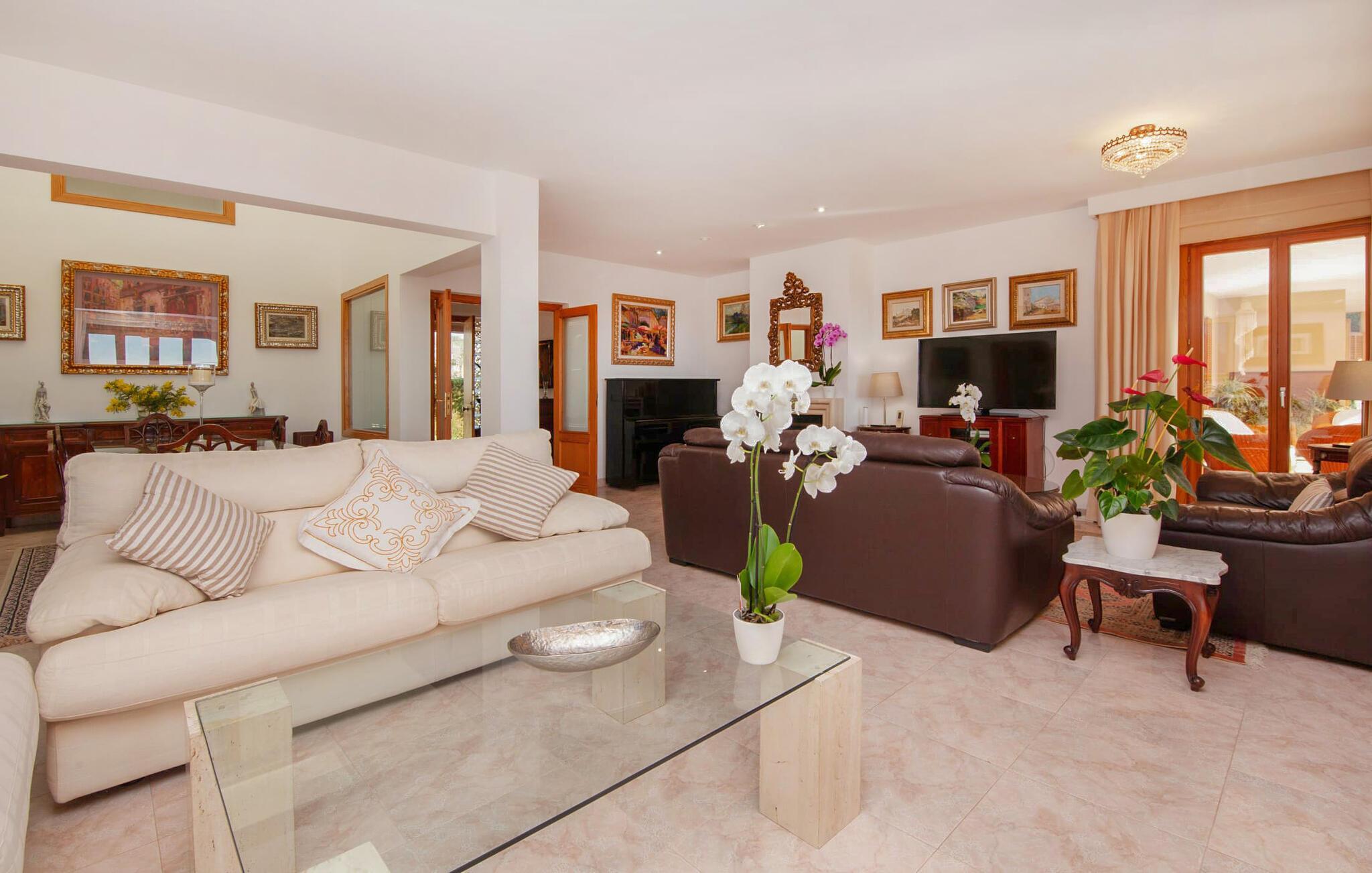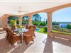 Ein gediegenes Ambiente weht durch die Räume, die das Prinzip der „Großzügigkeit“ konsequent fortführen. Auch wenn das Restaurant voll besetzt ist, gibt es im Innenbereich genügend Möglichkeiten, individuelle Plätze zum Ausruhen zu finden. Im Wohnzimmer, das direkt an die Veranda angrenzt, bieten mehrere Sofas gemütliche Plätze zum Entspannen und der Tisch bietet Gelegenheit zum gemeinsamen Essen. Die Küche im weißen Look und mit umfassender Ausstattung bietet alles, was Sie für einen unabhängigen Selbstversorger-Urlaub benötigen, und direkt daneben, nach außen hin offen, befindet sich ein weiterer Essbereich mit fantastischem Ausblick. In insgesamt fünf individuell eingerichteten Schlafzimmern finden Sie ein gemütliches Ambiente für erholsame Urlaubsnächte. Bodentiefe Fenster lassen mediterranes Licht herein und eröffnen wunderschöne Ausblicke. Drei Badezimmer en suite, teilweise von zwei Schlafzimmern aus zugänglich, runden den Wohnkomfort geschmackvoll ab.