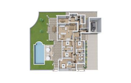 Wie der Name schon sagt, liegt diese vielseitige und geräumige Villa in der Nähe von Land und Meer – perfekt für diejenigen, die im Urlaub beides genießen möchten! Die eher ruhige und dennoch stadtnahe Lage bringt weitere Vorteile mit sich. Was hier sofort ins Auge fällt, ist die sensationelle Veranda, die sich oberhalb des Pools befindet und neben mehreren besonders einladenden Sitz- und Entspannungsmöglichkeiten auch einen herrlichen Ausblick bietet. Der in Blautönen erstrahlende Pool, der sehr bequem über eine römische Treppe zu erreichen ist, die gepflegte Liegewiese und das Sonnendeck erstrecken sich direkt vor Ihnen und dahinter blickt man auf die eher flache Landschaft des Südens Insel. Das sind beste Voraussetzungen für ausgiebige Outdoor-Aufenthalte – Gasgrill, bequeme Sonnenliegen und Sonnenschirme ergänzen das Vergnügungsangebot, das Groß und Klein begeistern wird.