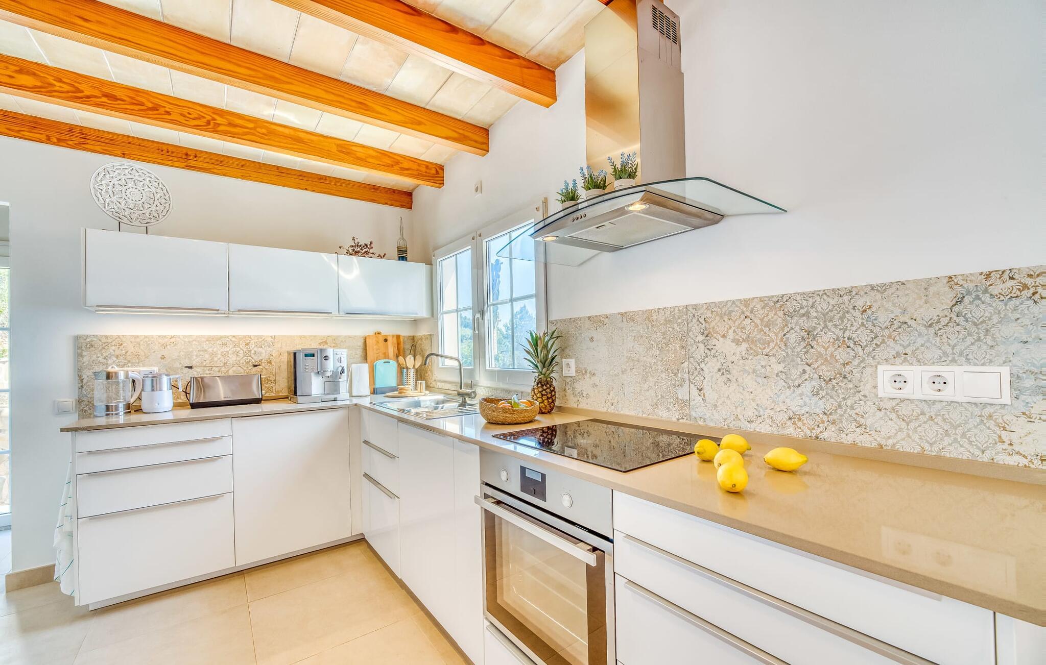 Über bodentiefe Fenster kann das Haus von der Terrasse aus betreten werden. Ein helles, modern-trendiges Ambiente prägt den offenen Wohn- und Küchenbereich. Große Bodenfliesen und weiße Wände rahmen die geschmackvolle Einrichtung dieser vollklimatisierten Villa auf Mallorca ein. Im Erdgeschoss befinden sich neben dem Wohnbereich ein Schlafzimmer mit Doppelbett und ein Badezimmer mit Dusche, während sich im Obergeschoss zwei weitere Schlafzimmer mit Doppelbett befinden. Diese teilen sich ein Duschbad. Vom Hauptschlafzimmer gibt es Zugang zu einer weiteren kleinen Terrasse. Auch die technische Ausstattung des Hauses ist mit Glasfaser-Internet, Bluetooth-Lautsprechern, Sat-TV und einer guten Home-Office-Ausstattung hervorragend. Auch Golfer, Tennisspieler, Radfahrer, Wanderer und Surfer finden hier einen idealen Ausgangspunkt für sportliche Aktivitäten.