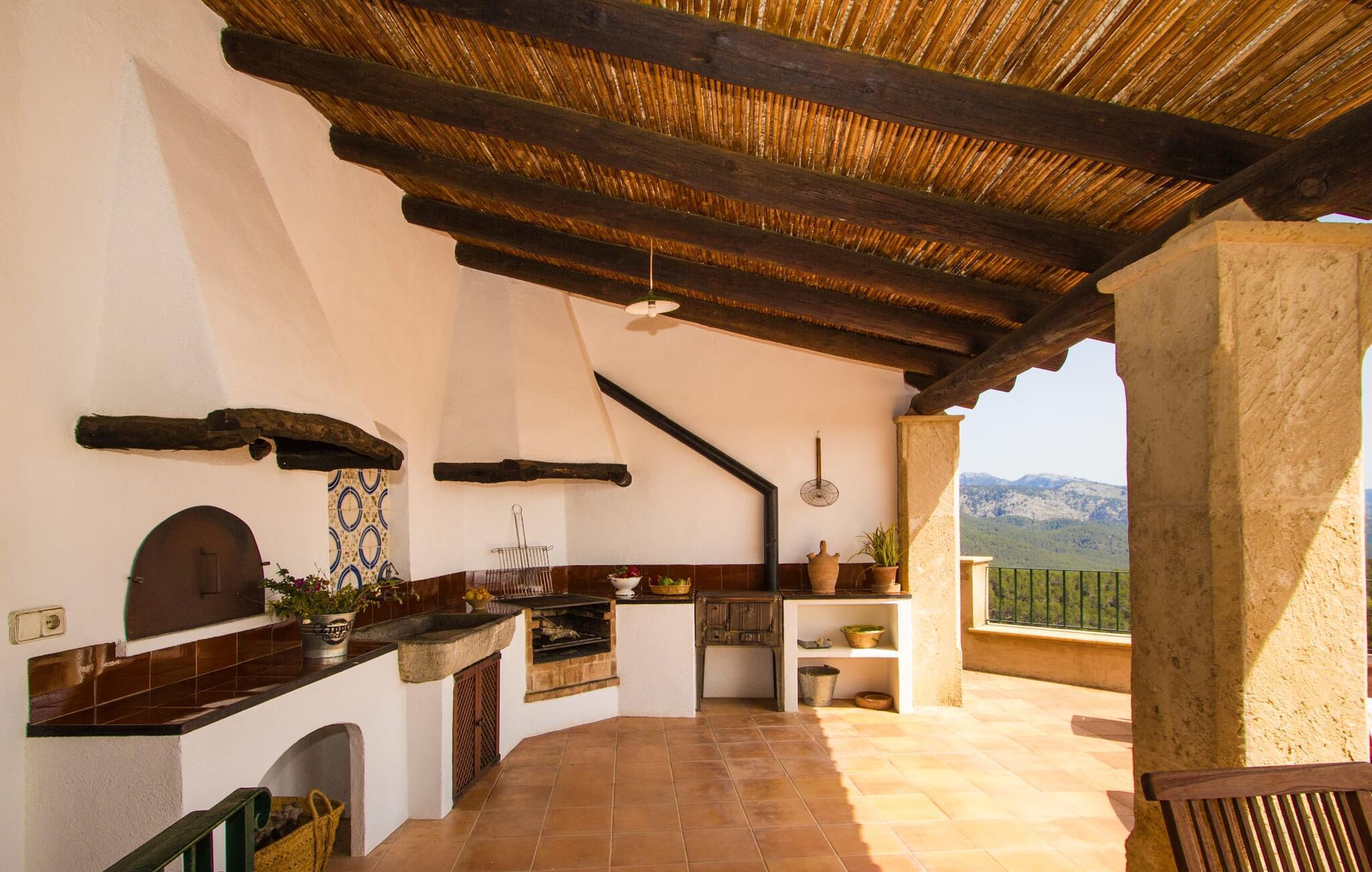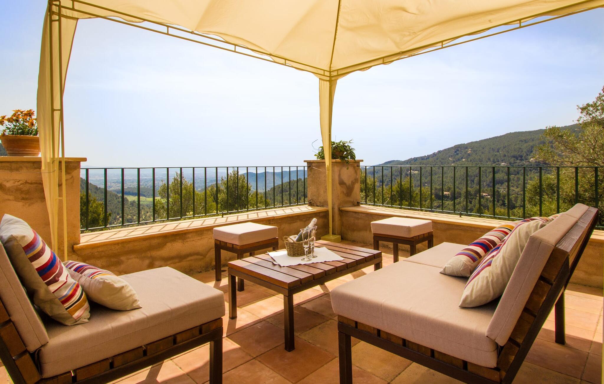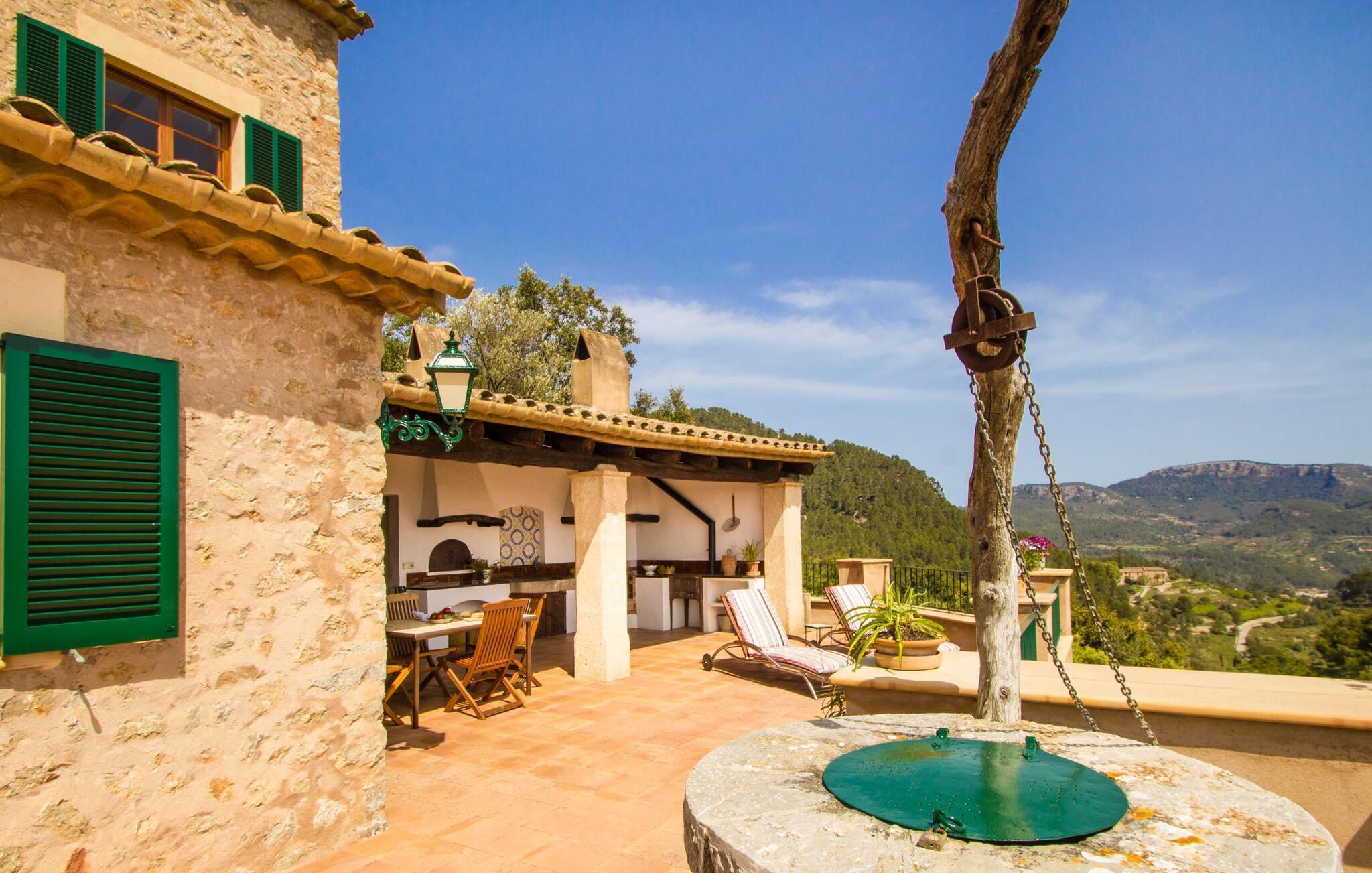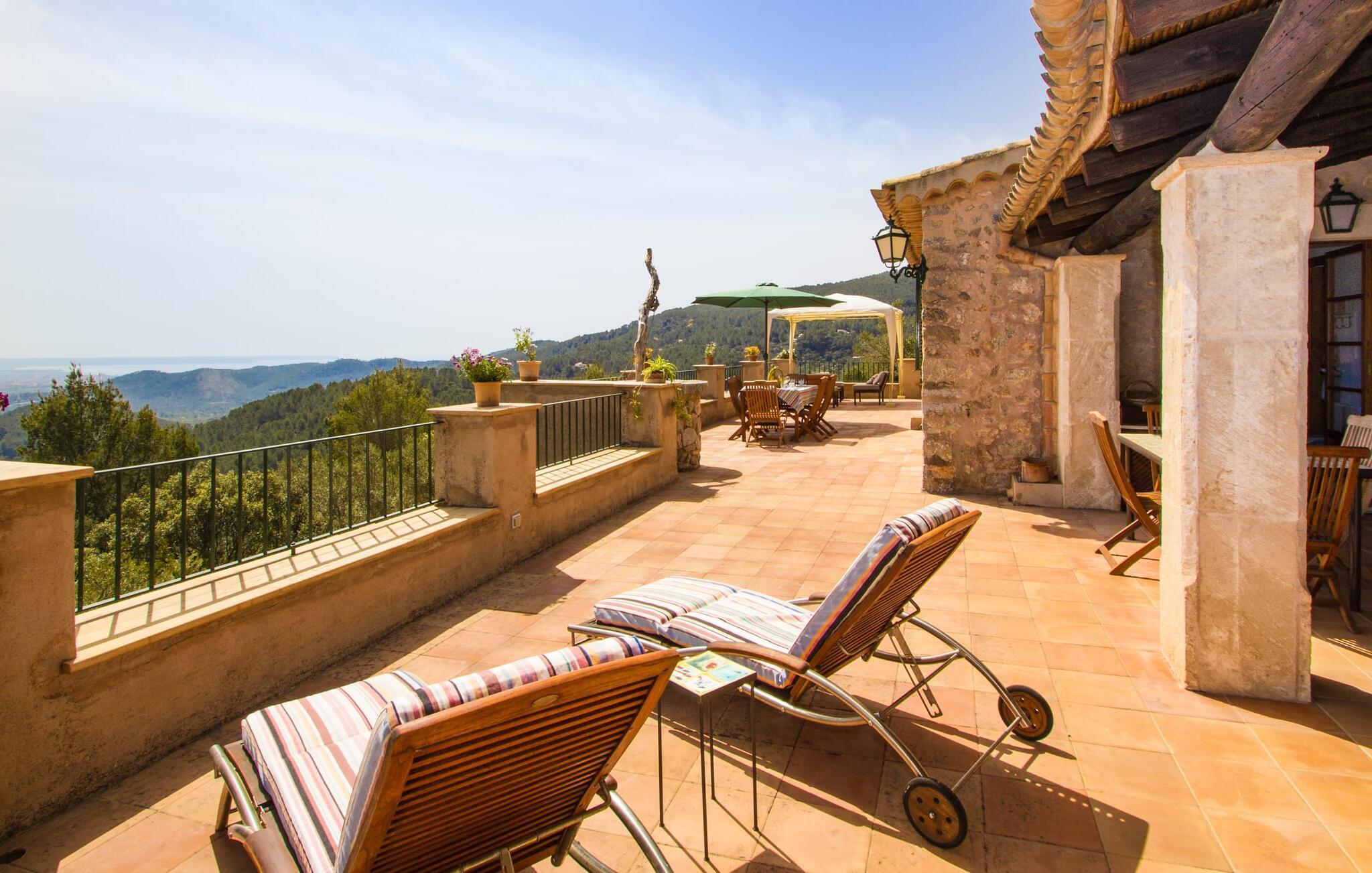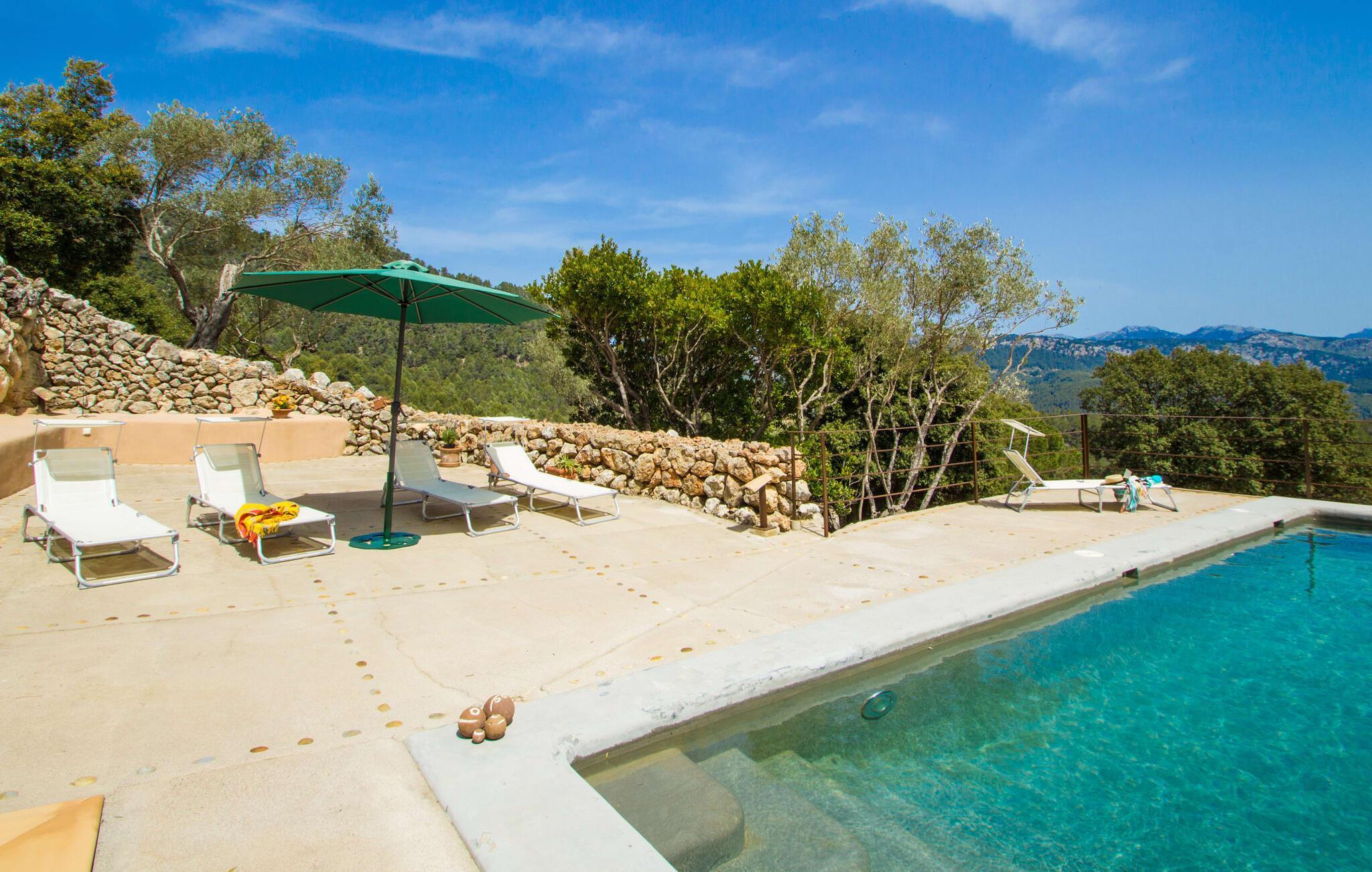 Hoch über der charmanten Kleinstadt Esporles thront die Villa „Vistas de Serra“ in völliger Ruhe. Das typisch mallorquinische Natursteinhaus fügt sich perfekt in die grüne Umgebung ein, die teilweise aus Wald besteht. Es lockt dazu, eine Weile zu bleiben und die Aussicht zu genießen. Der weitläufige Außenbereich besteht größtenteils aus Terrassen, die von kleinen Steinmauern eingefasst und mit mediterraner Flora gesäumt sind und auf denen Sie Ihre Zeit auf vielfältige und angenehme Weise verbringen können. Etwa 30 m von der Vorderseite des Hauses entfernt und etwas tiefer liegt der einladende Poolbereich, der über einen stufenförmigen Fußweg erreichbar ist und mit einer atemberaubenden, einzigartigen Aussicht gesegnet ist. Das 9 m lange Becken ist leicht zugänglich und hat eine Tiefe zwischen 1,2 und 2,20 m. An heißen Tagen ist dies ein herrlicher Ort, um sich abzukühlen. Für diejenigen, die den ganzen Tag über nichts anderes tun möchten, als sich zu entspannen und die Sonne zu genießen, stehen bequeme Liegestühle zur Verfügung. Wenn Sie sich vor übermäßiger UV-Strahlung schützen möchten, können Sie sich natürlich einfach unter einen der hier draußen stehenden Sonnenschirme setzen oder sich einen Platz im überdachten Teil dieses Außenbereichs suchen. Hier finden Sie das Außenbad und eine Essgruppe, außerdem gibt es hier draußen einen Kühlschrank, sodass Sie immer ein kühles Getränk zur Hand haben. Die lange Panoramaterrasse direkt am Haus ist ein großartiger Ort, um zusammenzusitzen und den Luxus dieser atemberaubend schönen Lage zu genießen. In der Ferne kann man sogar ein wenig vom Meer sehen. Wenn Sie etwas Zeit übrig haben, entspannen Sie sich einfach unter dem Pavillon bei einem guten Drink und vergessen Sie alle Sorgen. Auf dieser Ebene befindet sich auch der überdachte Grillbereich mit Esstisch, Spüle und Holzofen. Es ist der perfekte Ort für lange Grillabende, bei denen Sie alle Arten frischer lokaler Lebensmittel grillen können. Direkt neben dem Haus befinden sich zwei schattige Parkplätze für den Mietwagen.